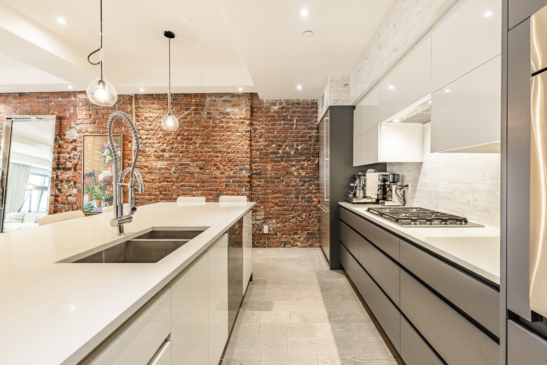 - Cuisine gastronomique sur mesure Cuisine Denis Couture, laque grise mate et blanche brillante, à aire ouverte