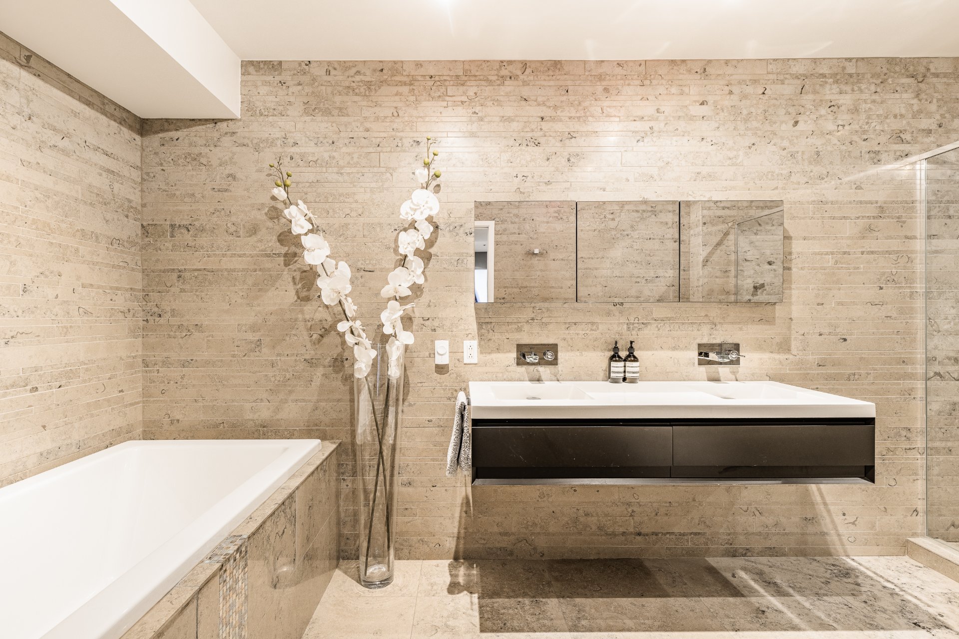 - Suite principale: salle de bain des maîtres en pierre naturelle Jura Grey, plancher chauffant, double lavabo, baignoire et douche indépendante avec jets hydromassants