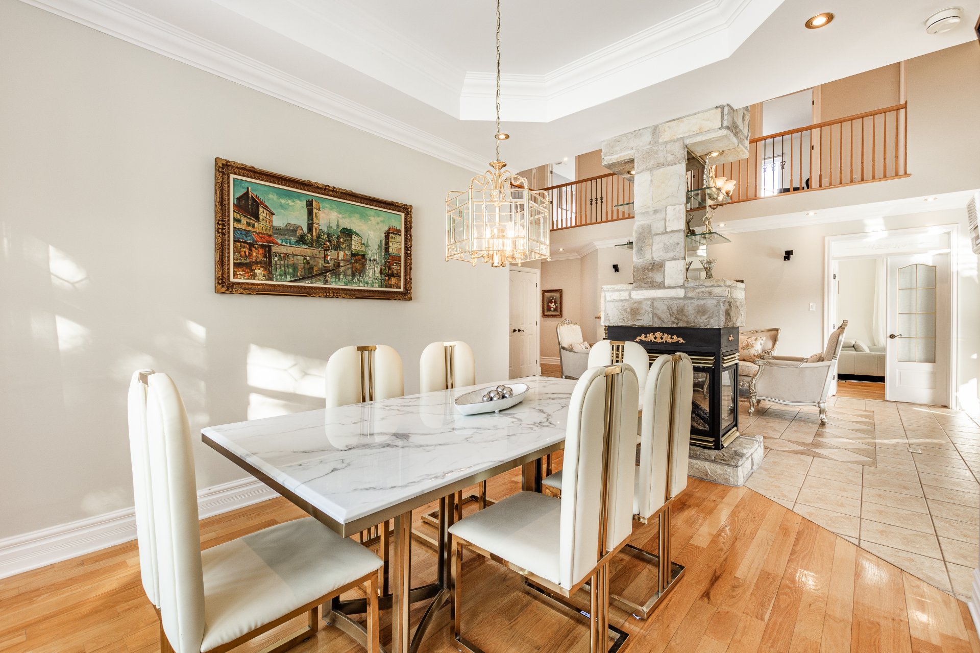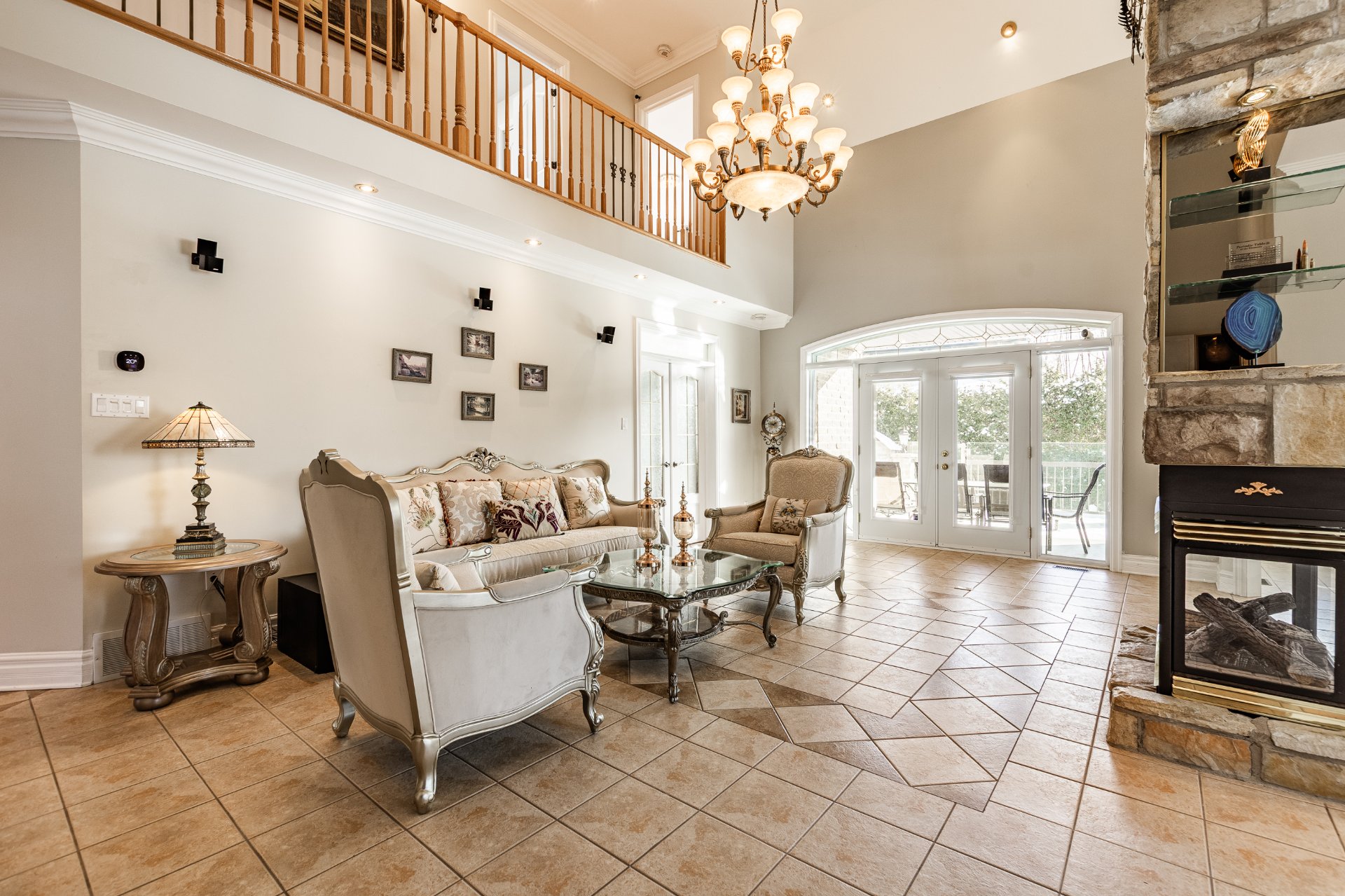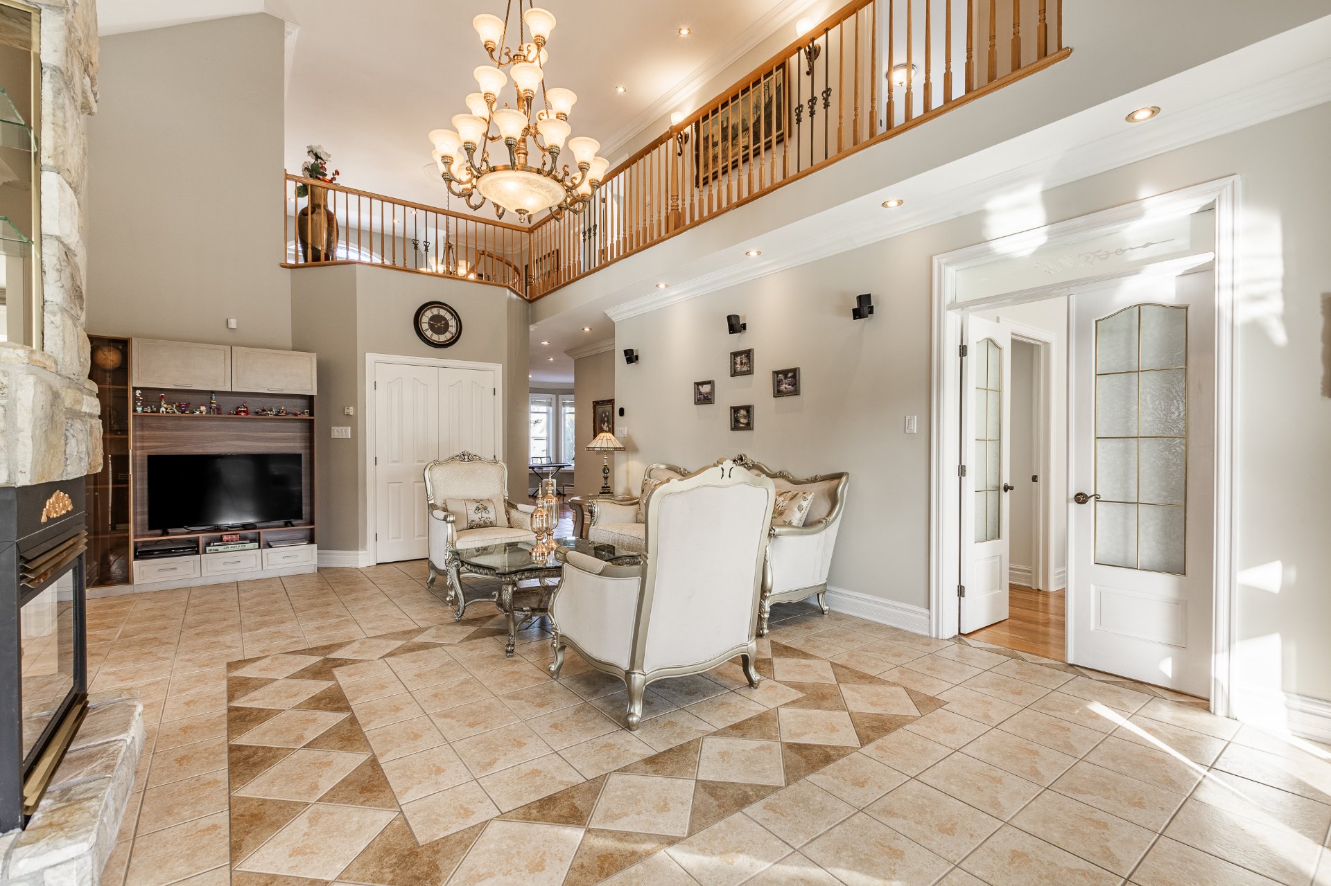 + Salle familiale largement fenestrée avec portes françaises, plafond cathédral de 18 pieds et foyer au gaz quatre faces.