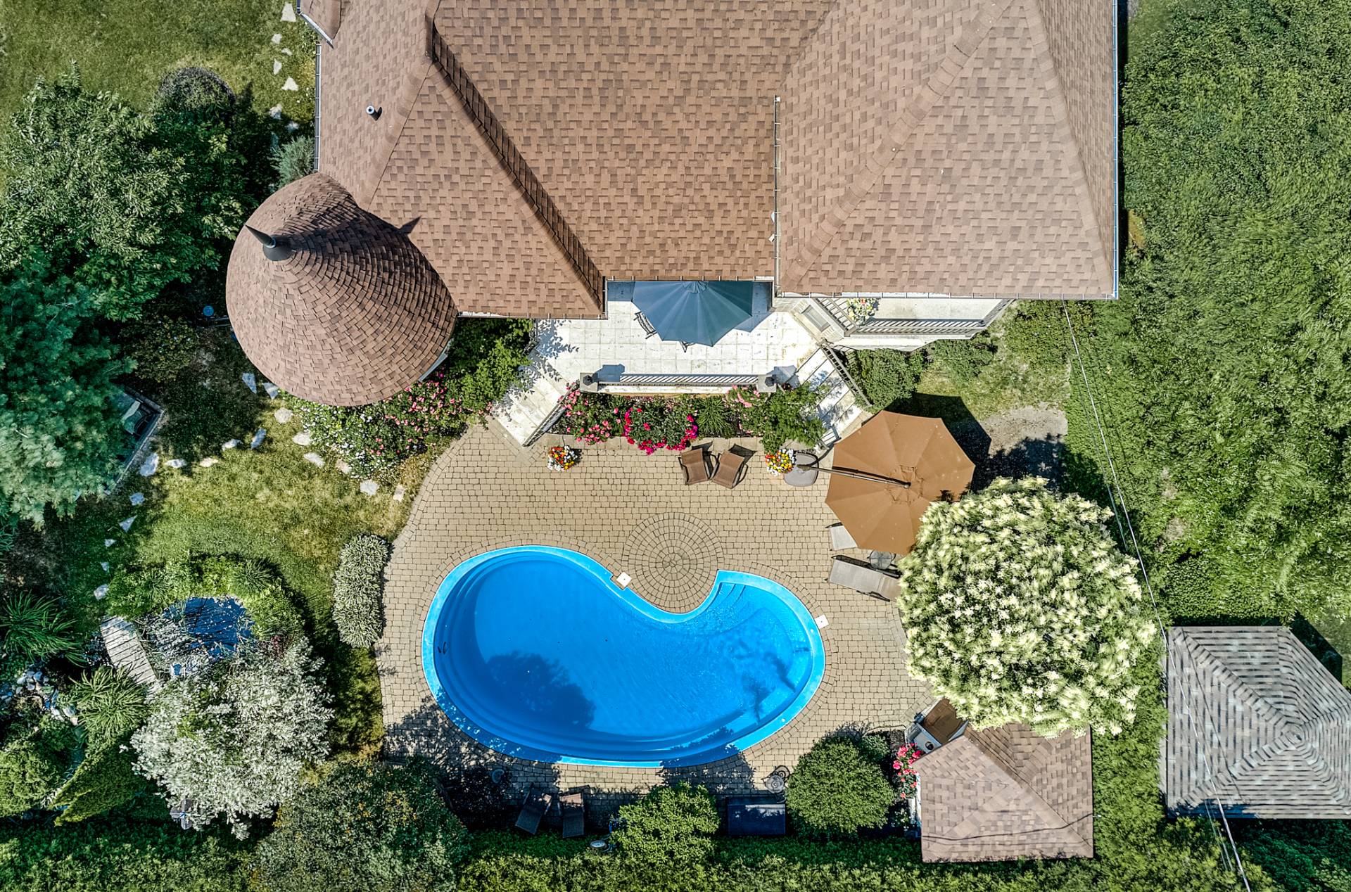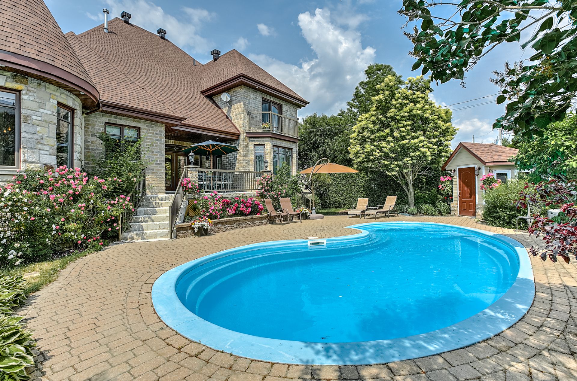 + Piscine creusée en fibre, ceinturée d'un trottoir et patio en pavés imbriqués.