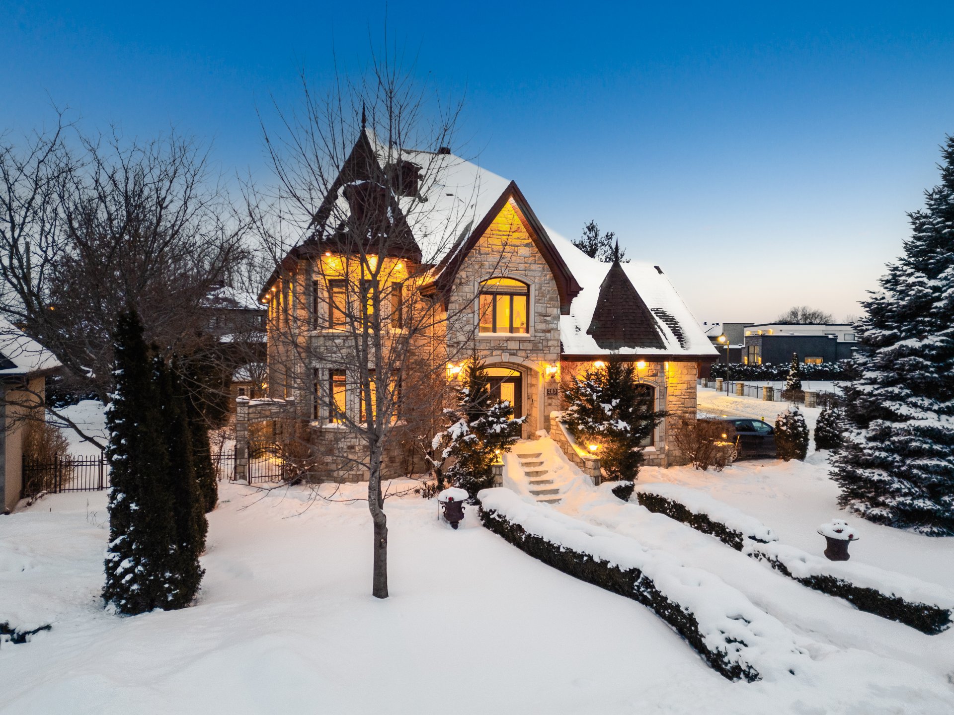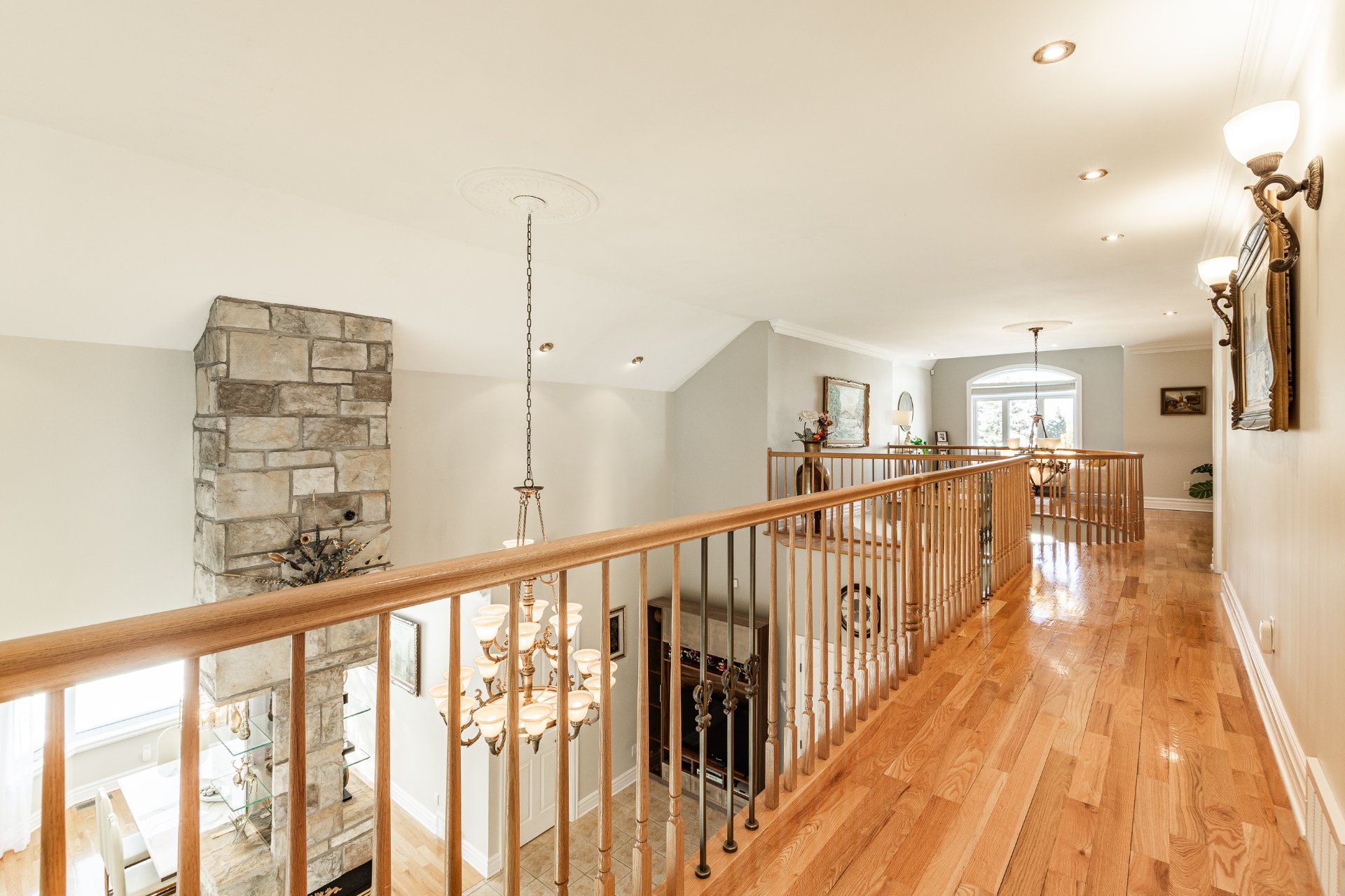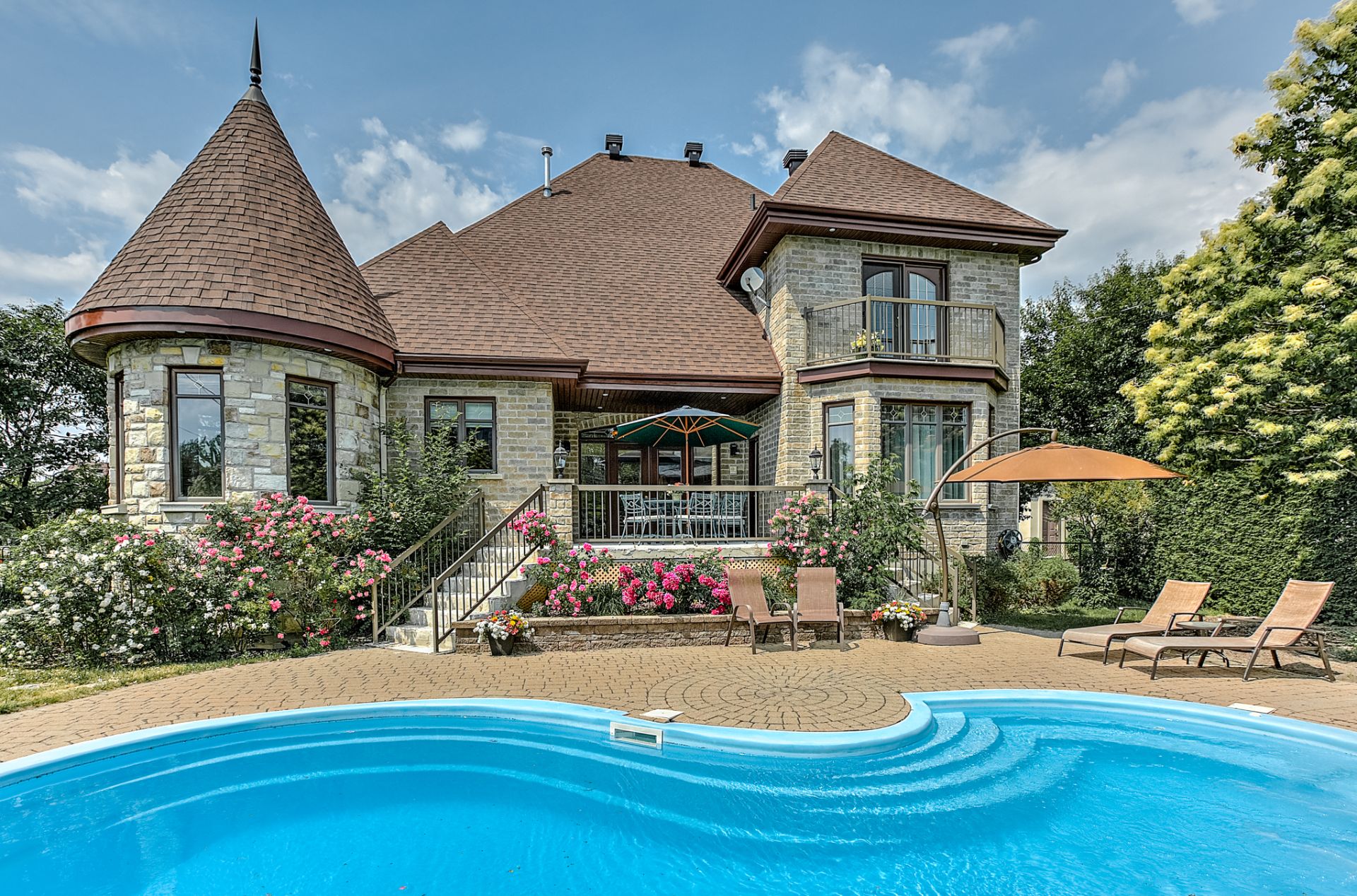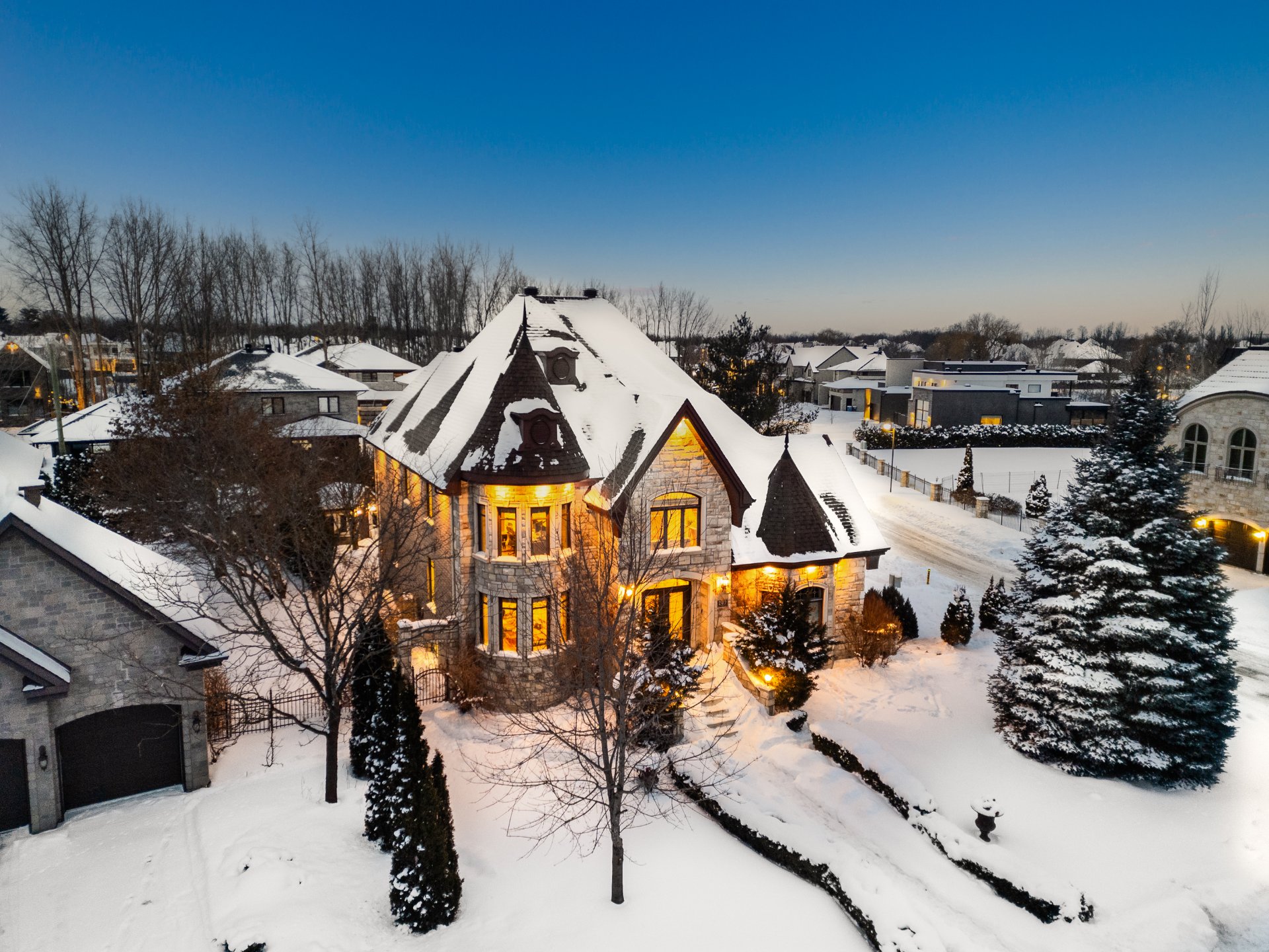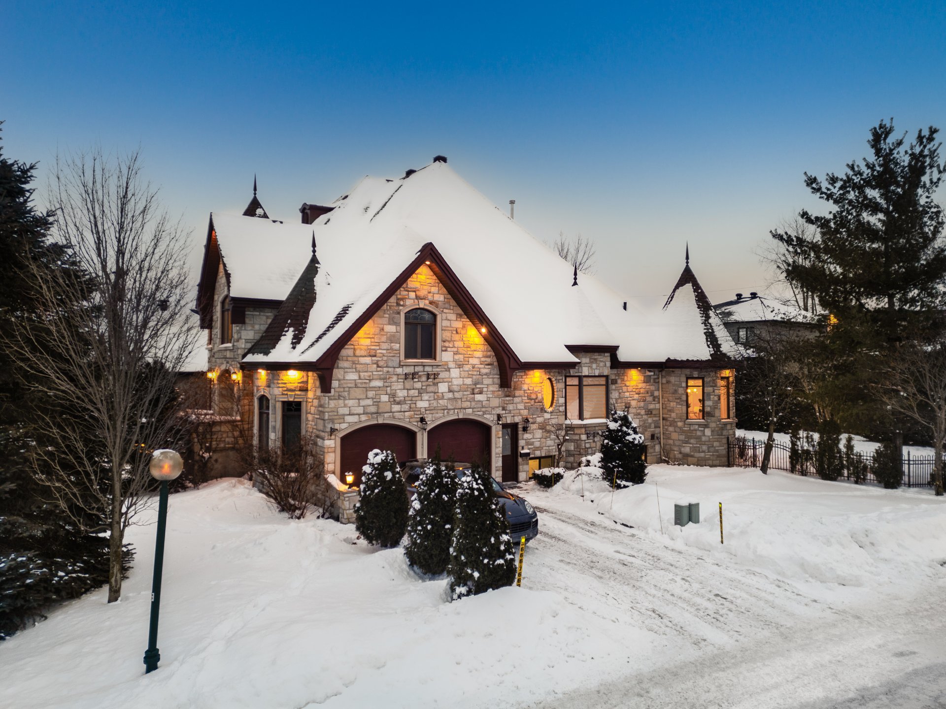 Somptueuse propriété détachée de style château située sur l'Île-aux-Lièvres à Carignan. Comprenant 7 CAC et 3 SDB complètes rénovées, elle se distingue par sa grandeur. Aires de vie vastes et lumineuses, hall d'entrée spectaculaire avec escalier cintré, salon et salle familiale avec plafonds élevés et foyer au gaz quatre faces. Cuisine rénovée avec coin-repas et plancher chauffant. Chambre principale au rez-de-chaussée avec walk-in, SDB attenante et accès à la terrasse. Mezzanine polyvalente et sous-sol aménagé avec cinéma maison, bar et CAC additionnelles. Cour arrière intime avec piscine creusée, terrasse et aménagement paysager luxuriant.