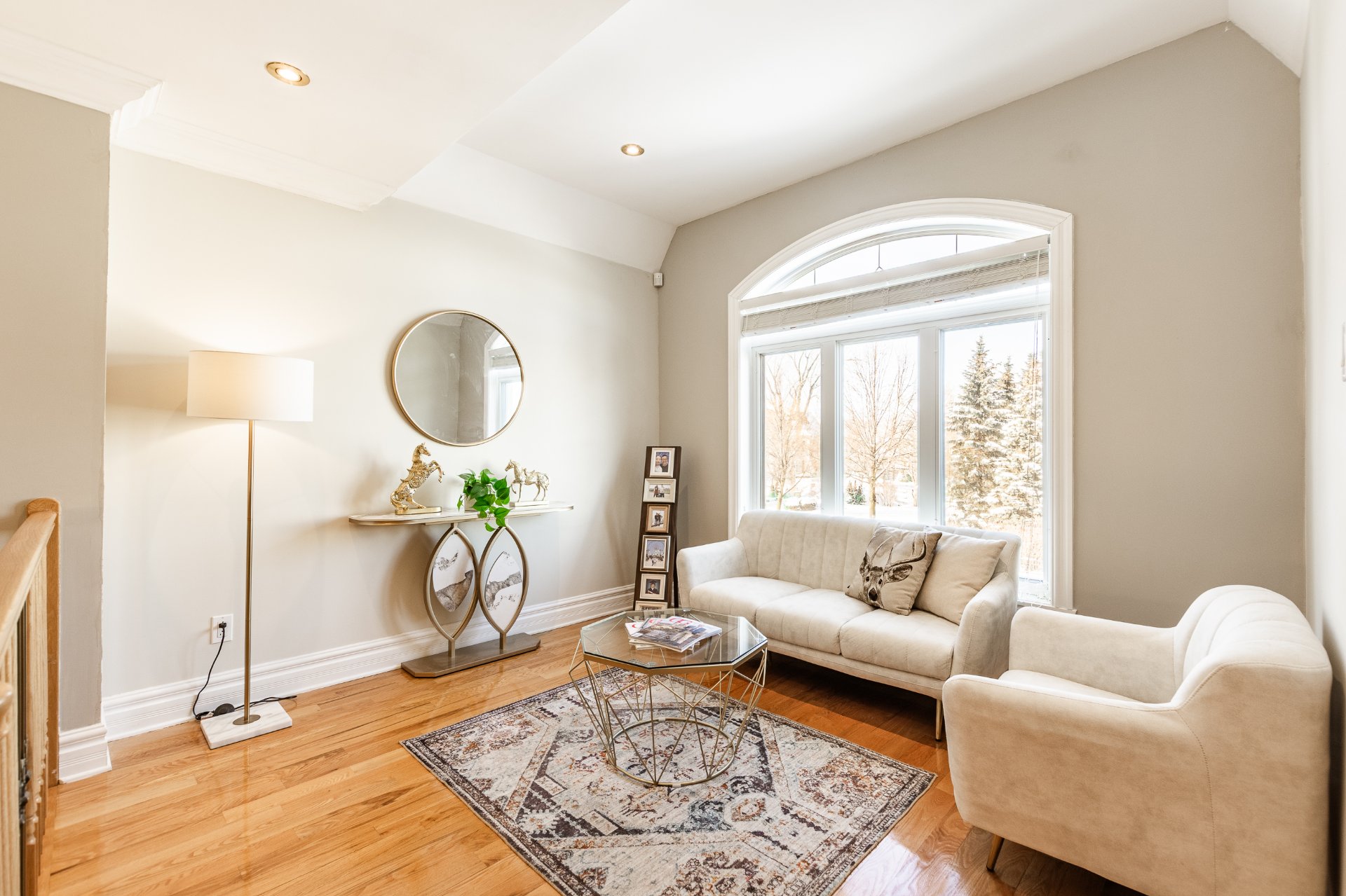 + Salon avec plafond de 9 pieds, plancher de lattes de chêne et fenêtres en rotonde.