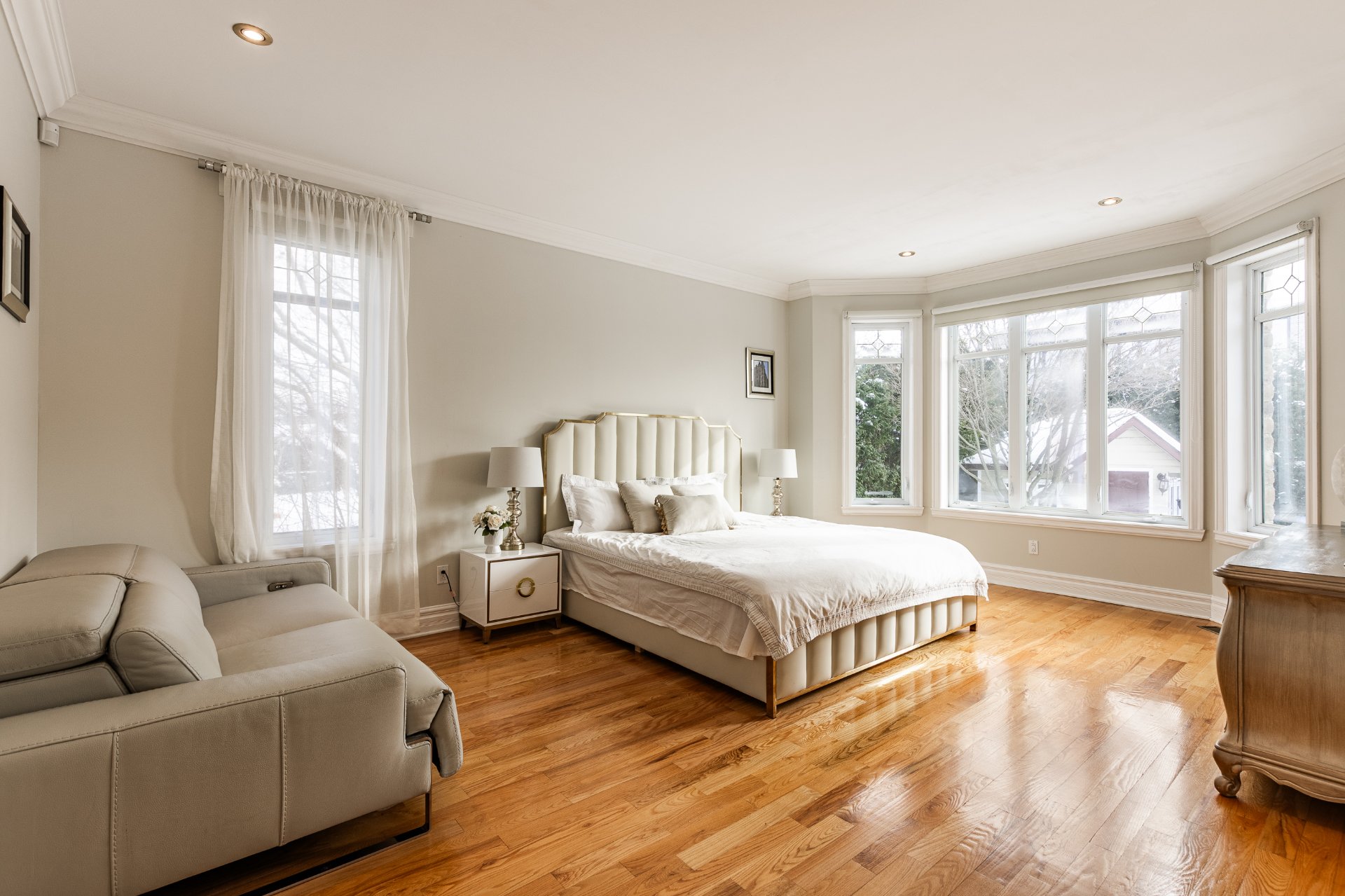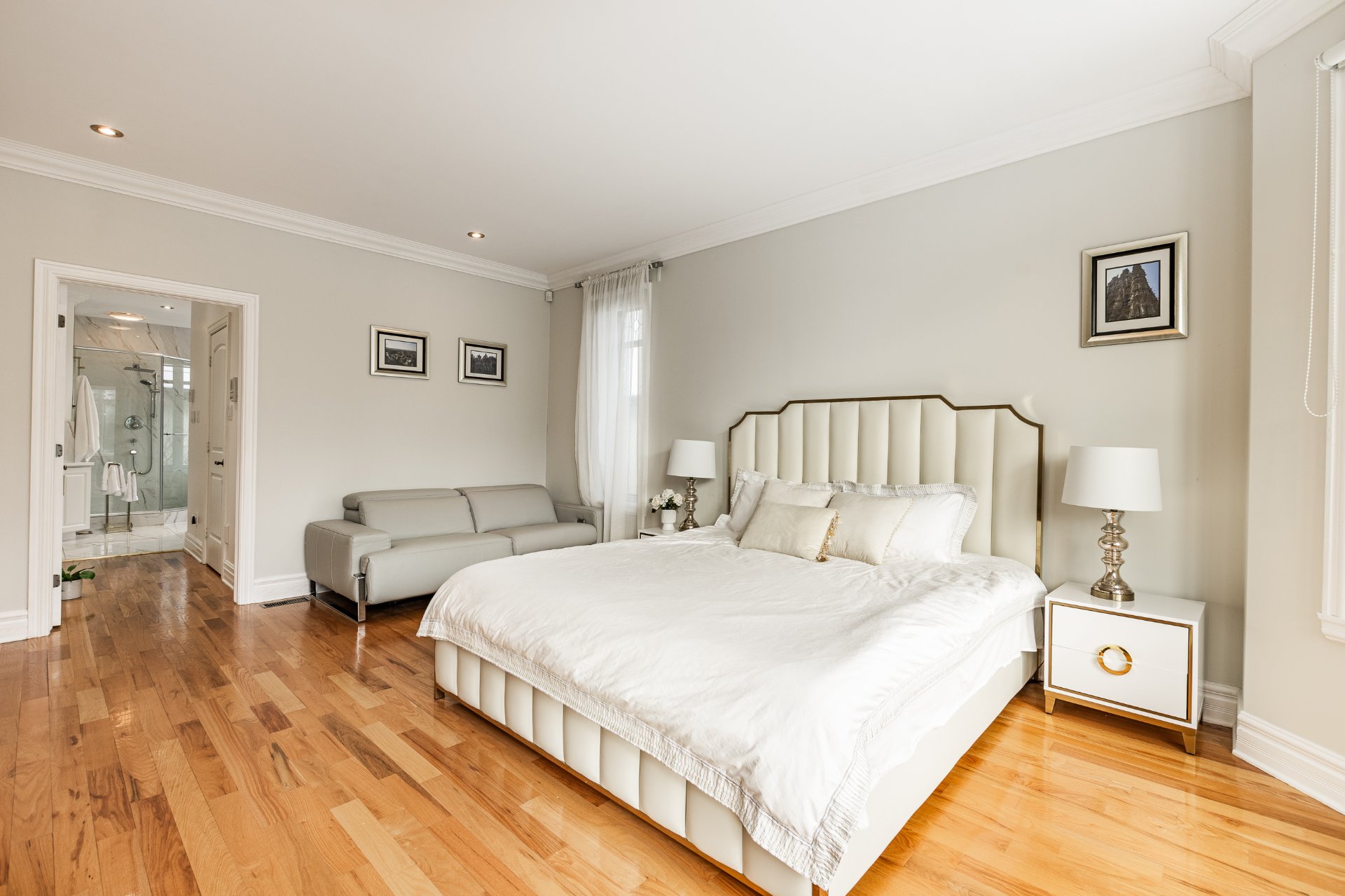 + Chambre principale somptueuse au rez-de-chaussée avec walk-in, fenêtre en baie et accès à la terrasse couverte.