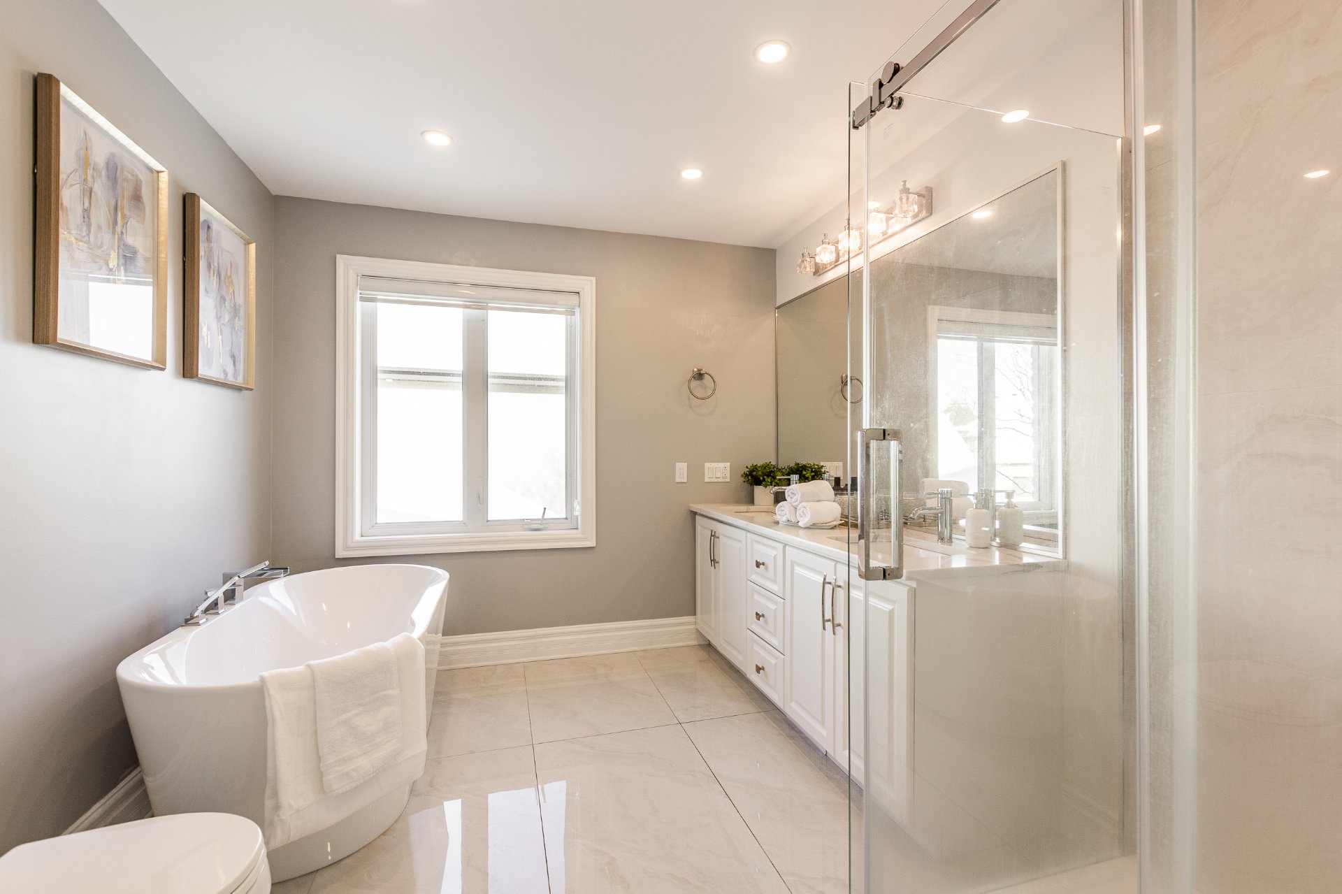+ Salle de bain attenante récemment rénovée avec douche vitrée, baignoire autoportante et vanité double.