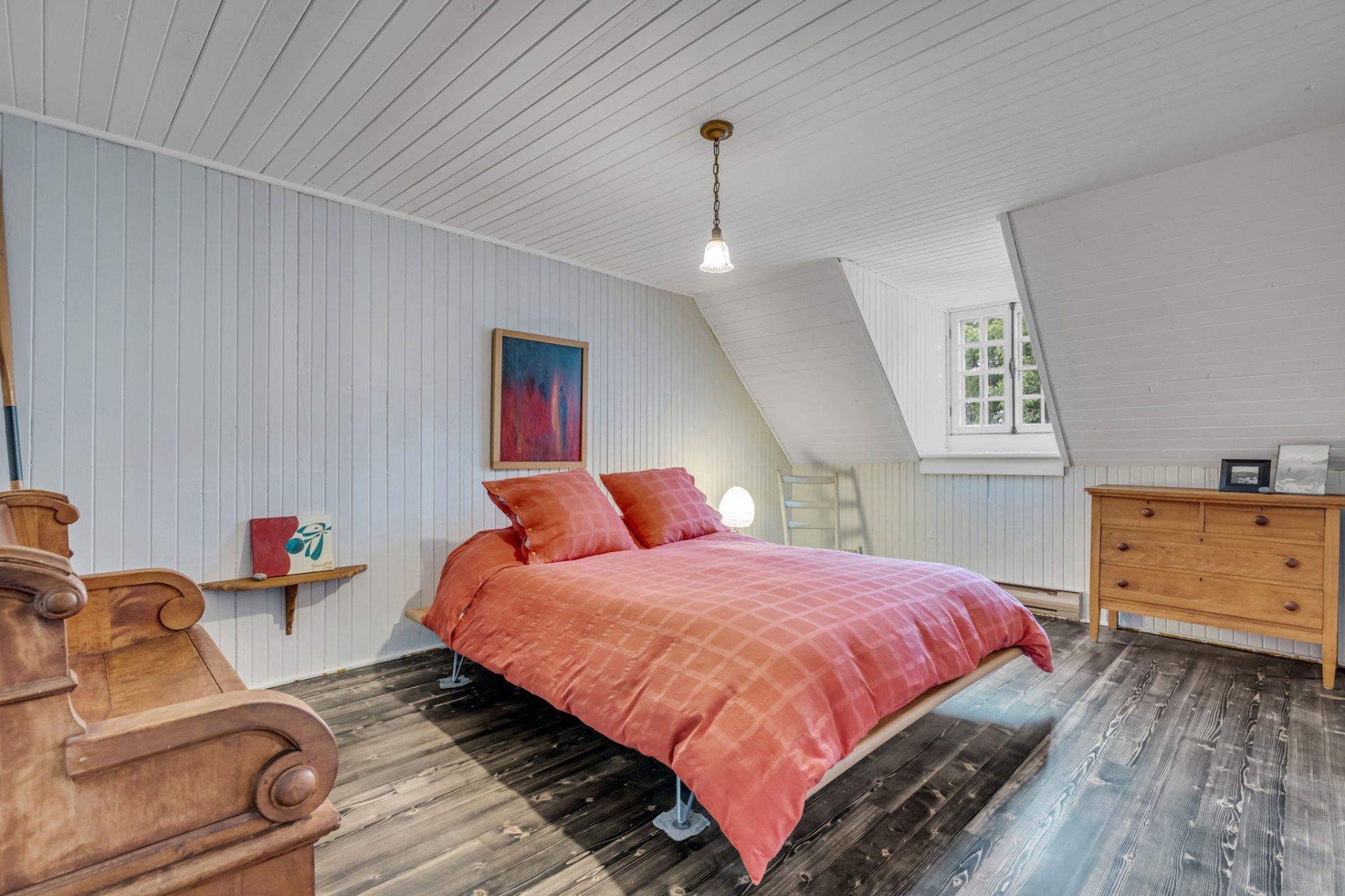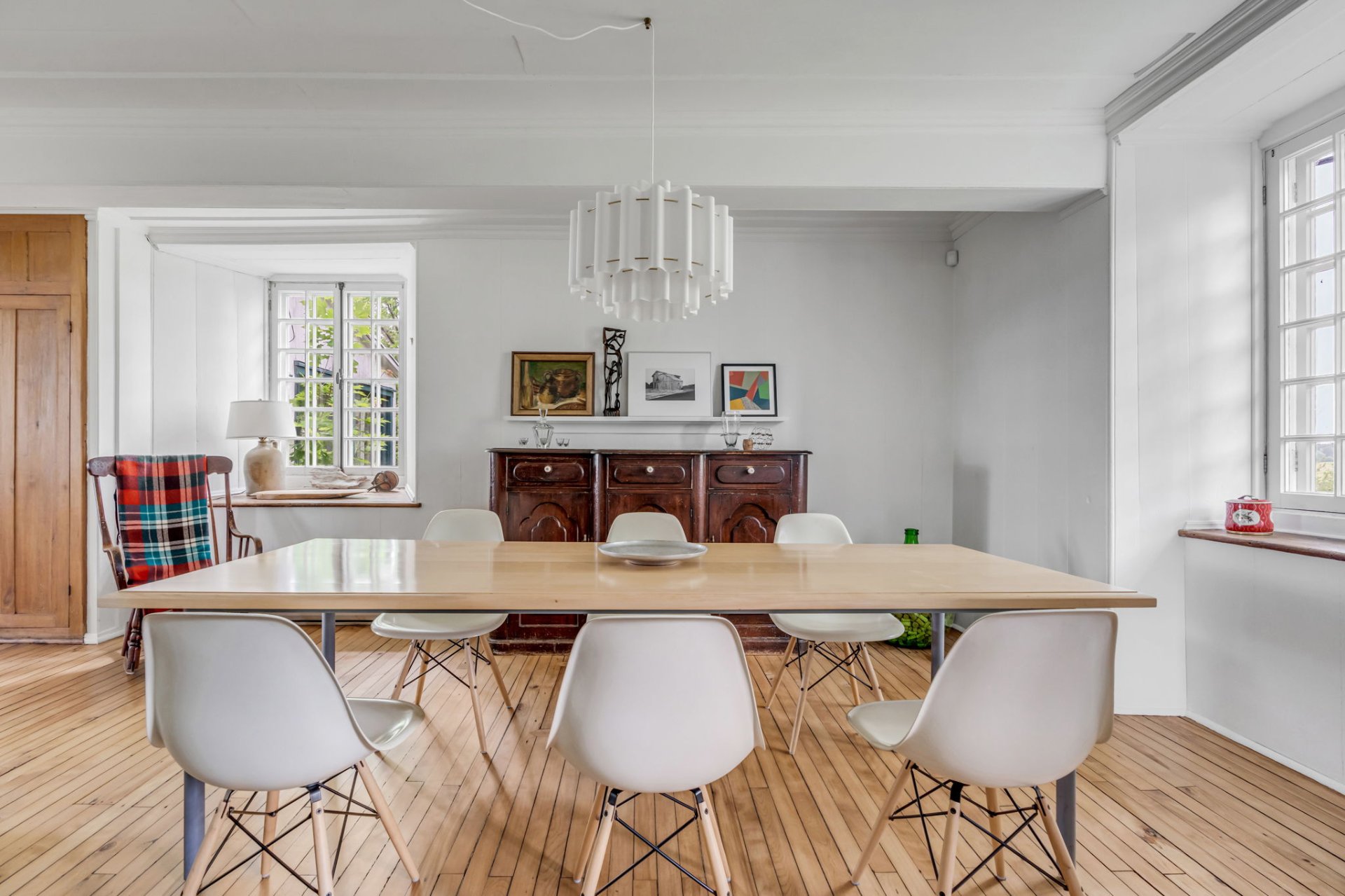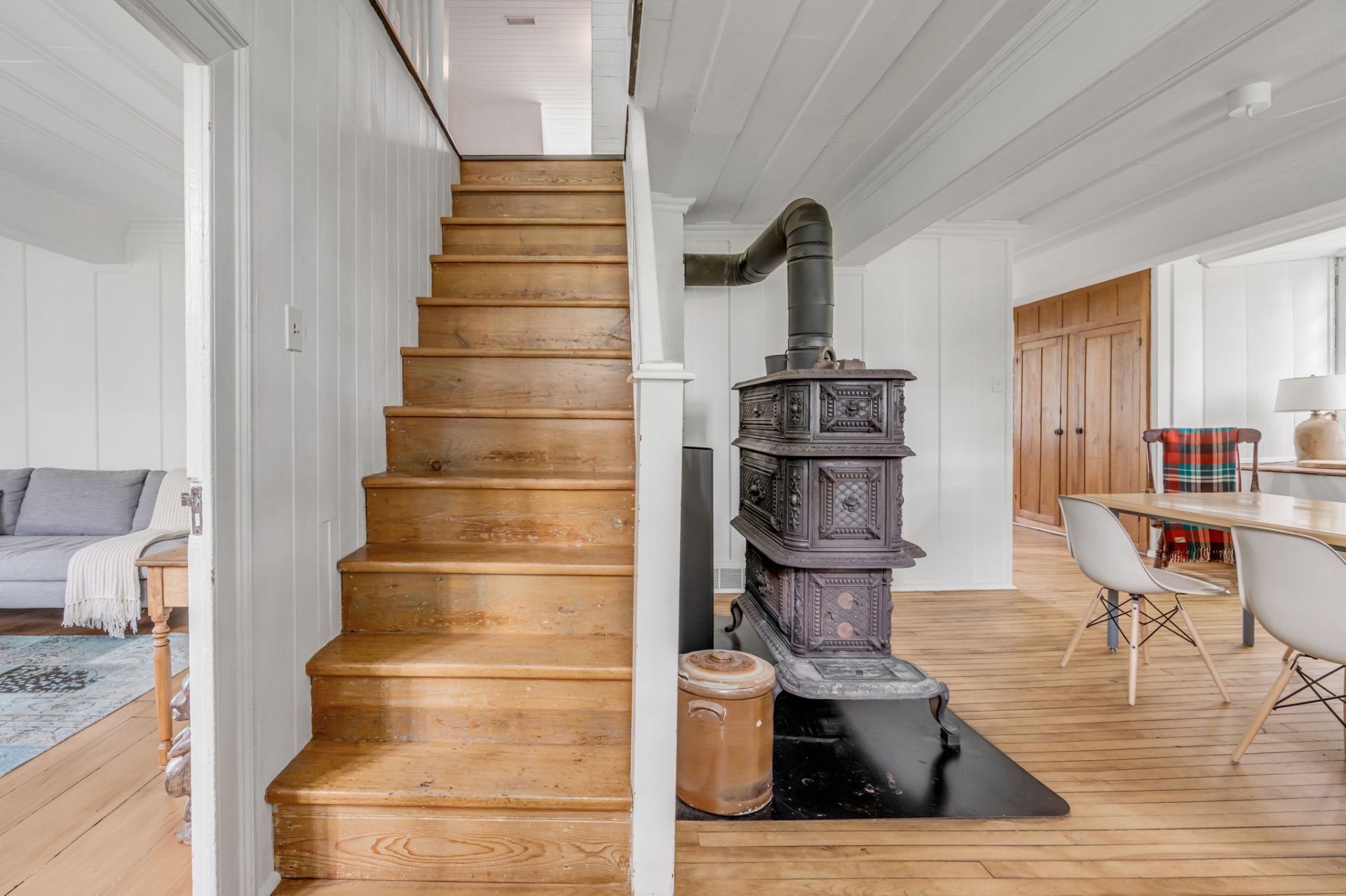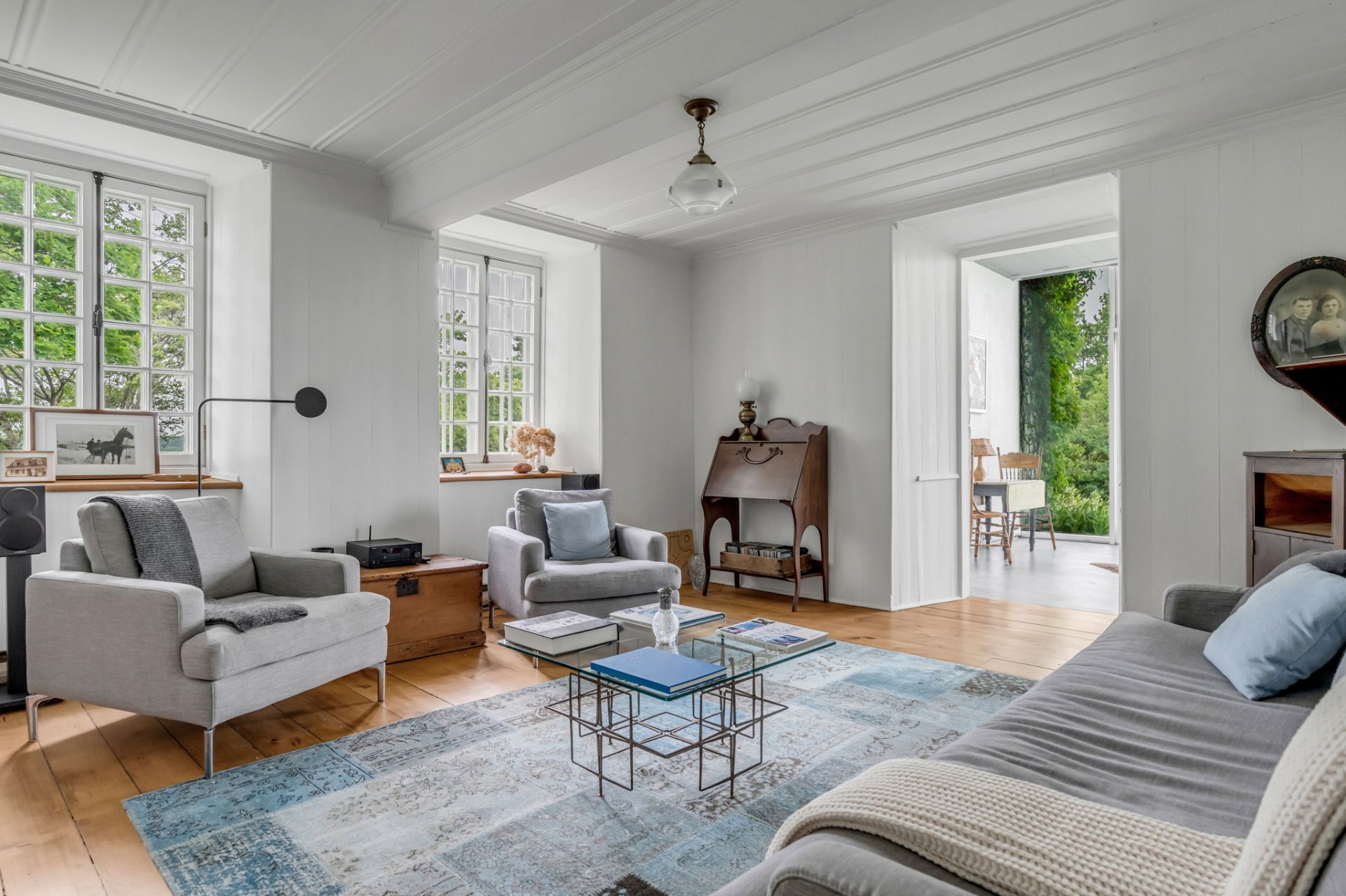 À l'intérieur, l'authenticité règne. Les murs de périmètre en madriers de pin révèlent le savoir-faire d'autrefois et dégagent une atmosphère enveloppante. Plusieurs éléments d'origine subsistent et affirment le caractère singulier de la demeure : les cloisons en planches à caissons, les plafonds à caissons ou à couvre-joints, les portes d'assemblage à panneaux, les poutres moulurées, sans oublier les planchers d'époque, patinés, vernis avec soin. Ces détails d'antan, préservés avec une rare fidélité, créent une ambiance feutrée et raffinée, propice à la contemplation, à la création ou à la villégiature.