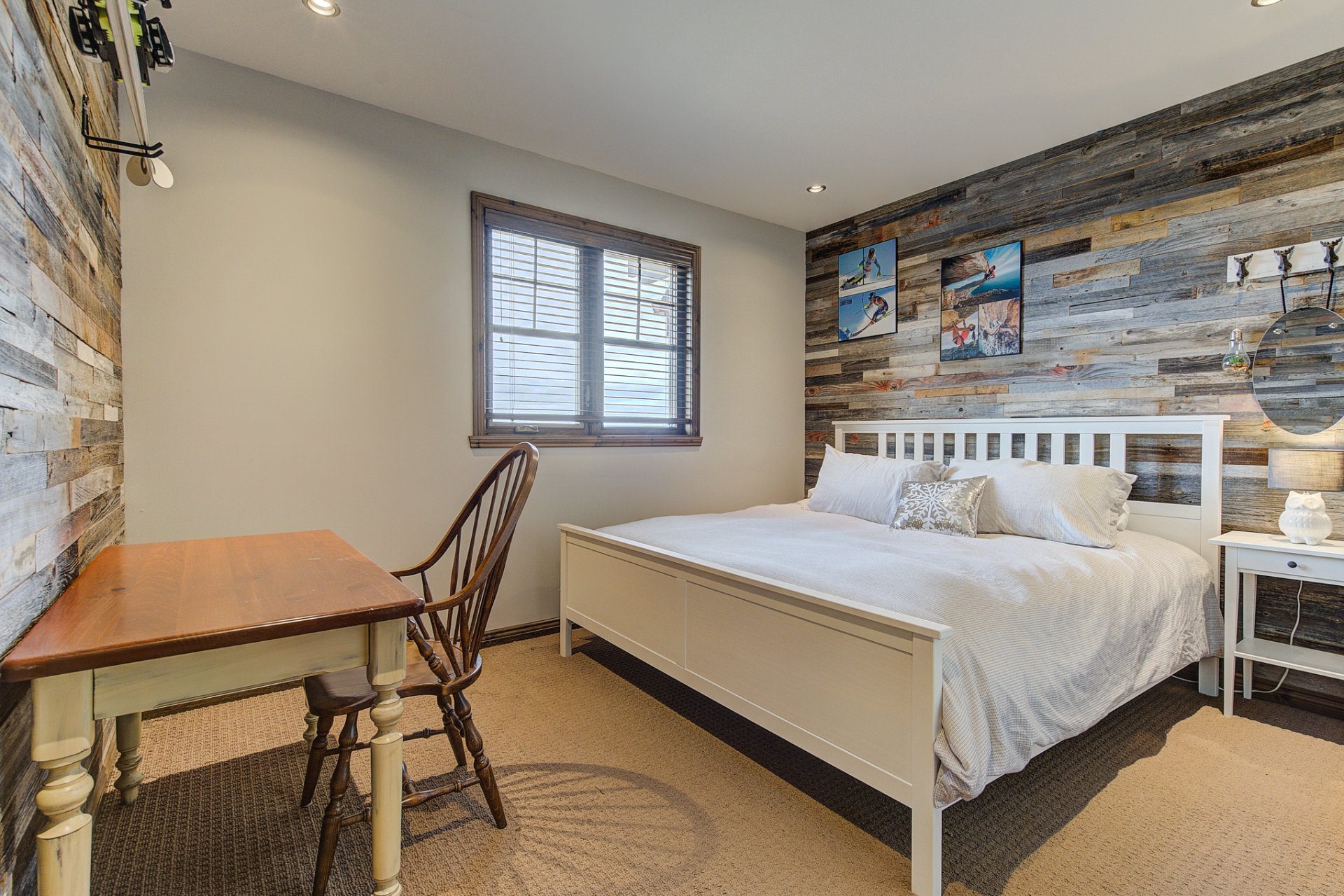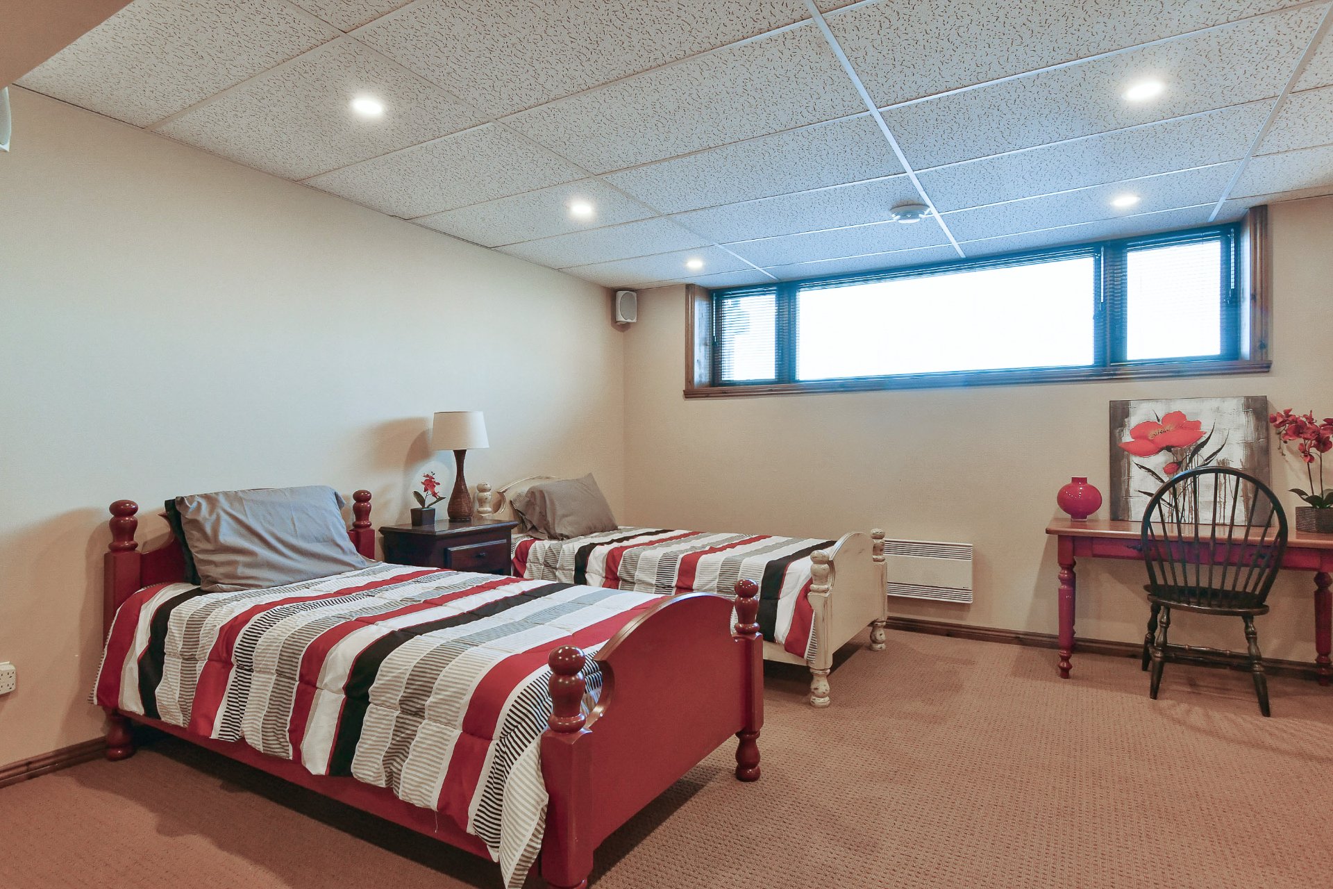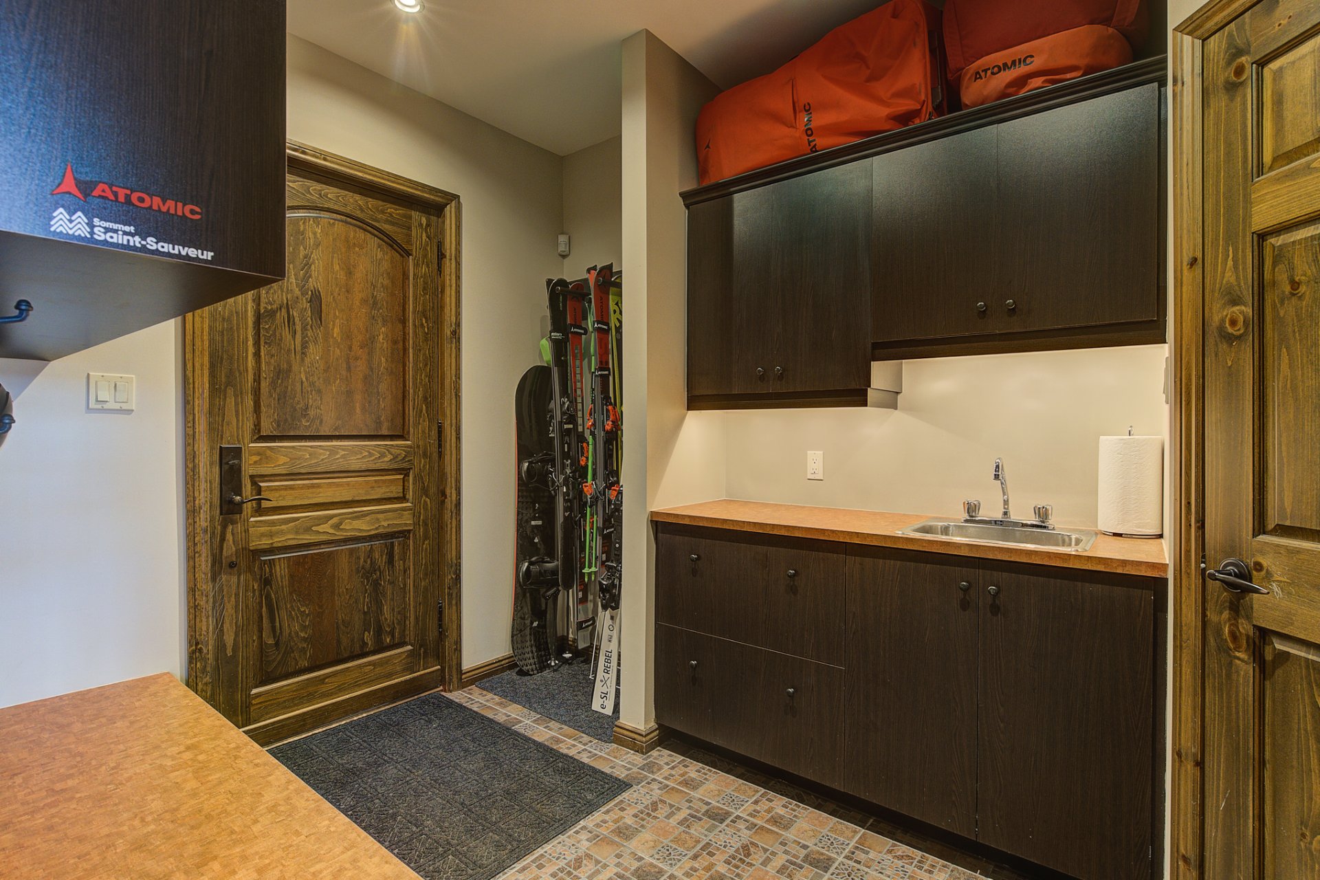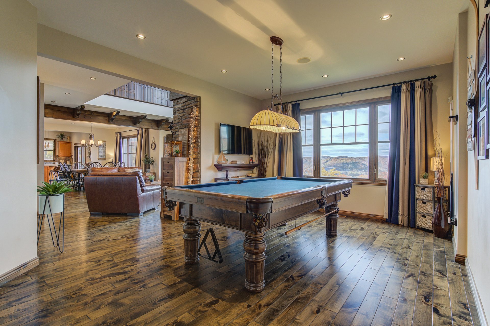 Aux côtés du salon, un espace divertissement avec table de billard et banquette intégrée promet de beaux moments entre amis et famille. On y trouve également un bureau, une salle de bains complète ainsi qu'un vestiaire avec laveuse et sécheuse pour plus de commodité.