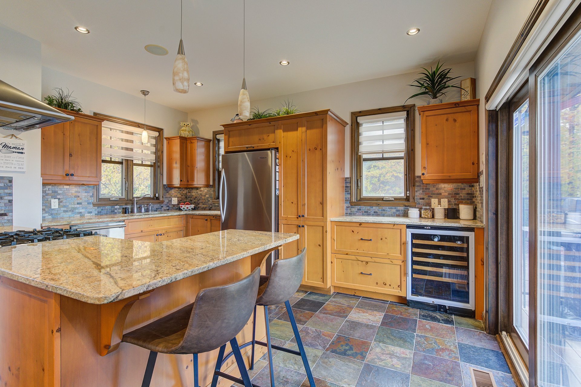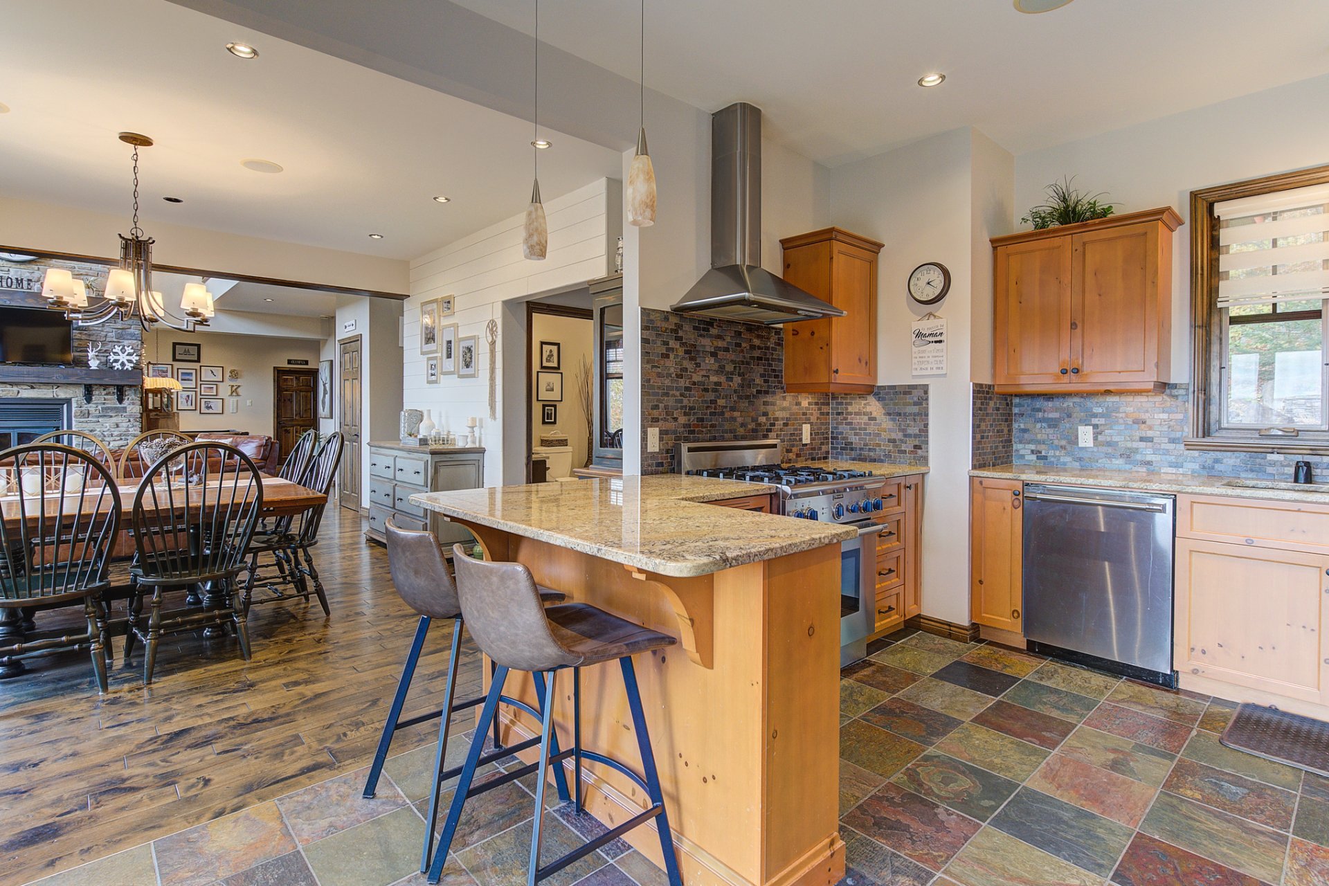 La fenestration abondante a été soigneusement pensée pour maximiser la lumière naturelle et offrir des vues saisissantes sur la nature environnante. La cuisine, fonctionnelle et élégante, avec comptoirs de granite, s'ouvre sur la salle à manger, menant directement à une terrasse et une véranda parfait pour les journées ensoleillées et vos soirées d'été.