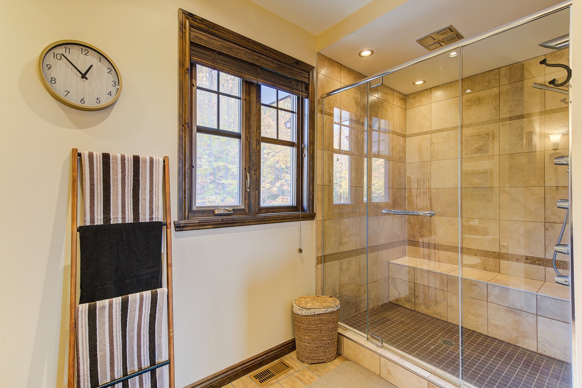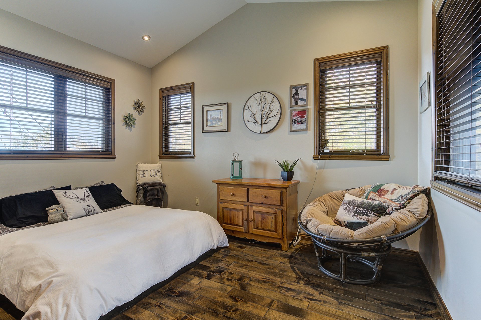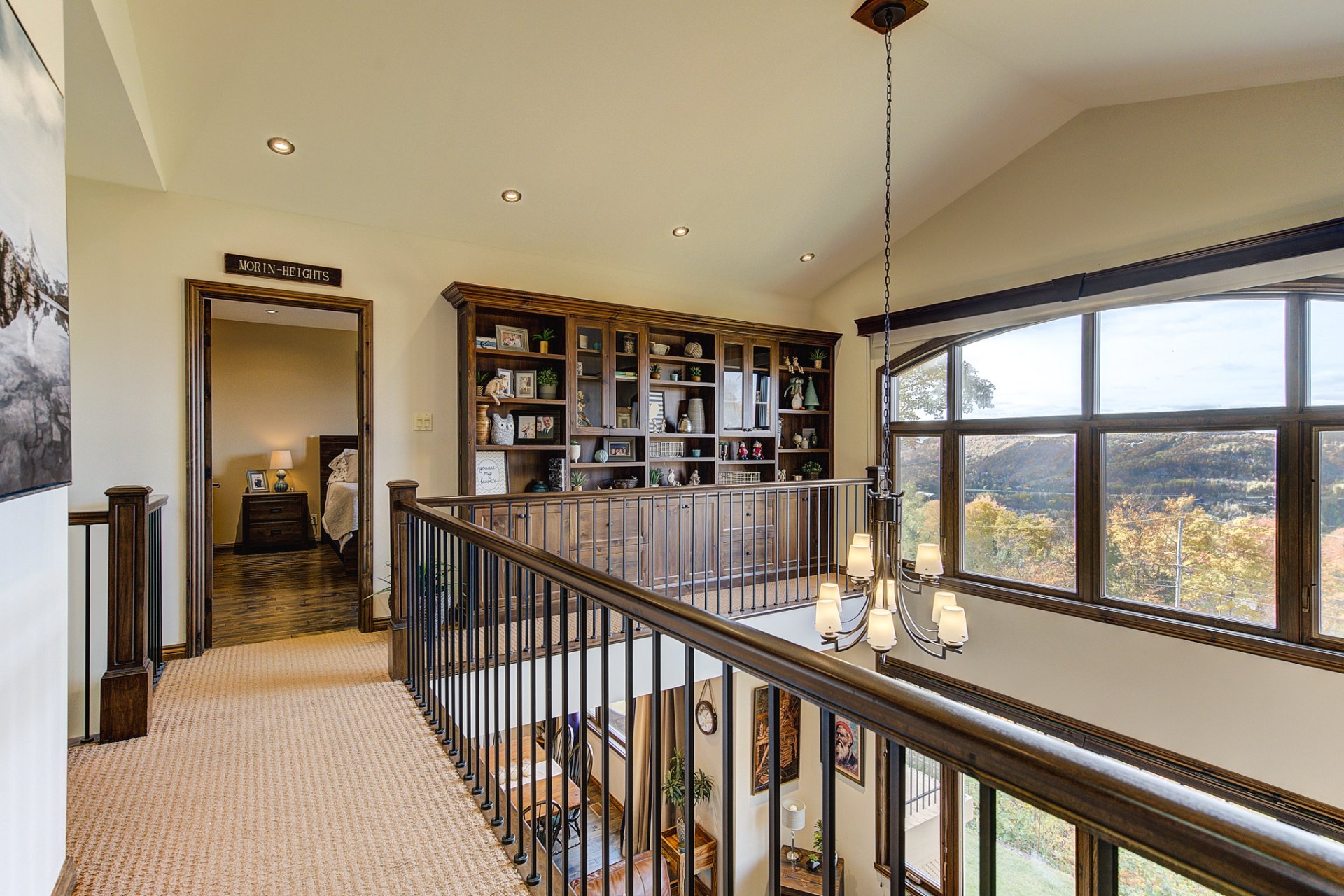 À l'étage, la chambre principale dispose de sa propre salle de bains avec plancher chauffant et offre une vue spectaculaire sur les environs. Deux autres chambres à coucher, spacieuses et lumineuses, partagent une salle de bains complète.