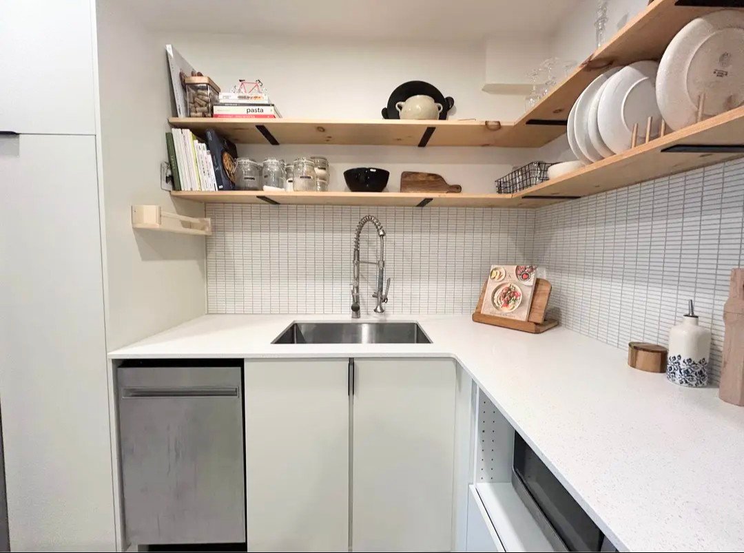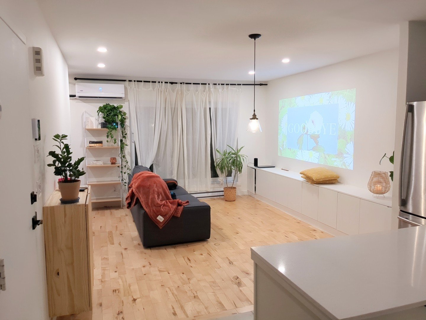 -- Appartement lumineux grâce à ses grandes fenêtres et son aire ouverte salon/cuisine.