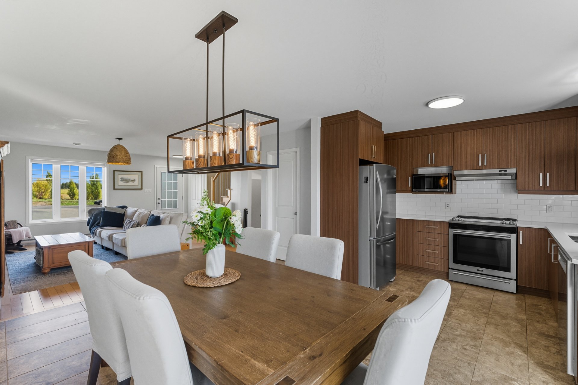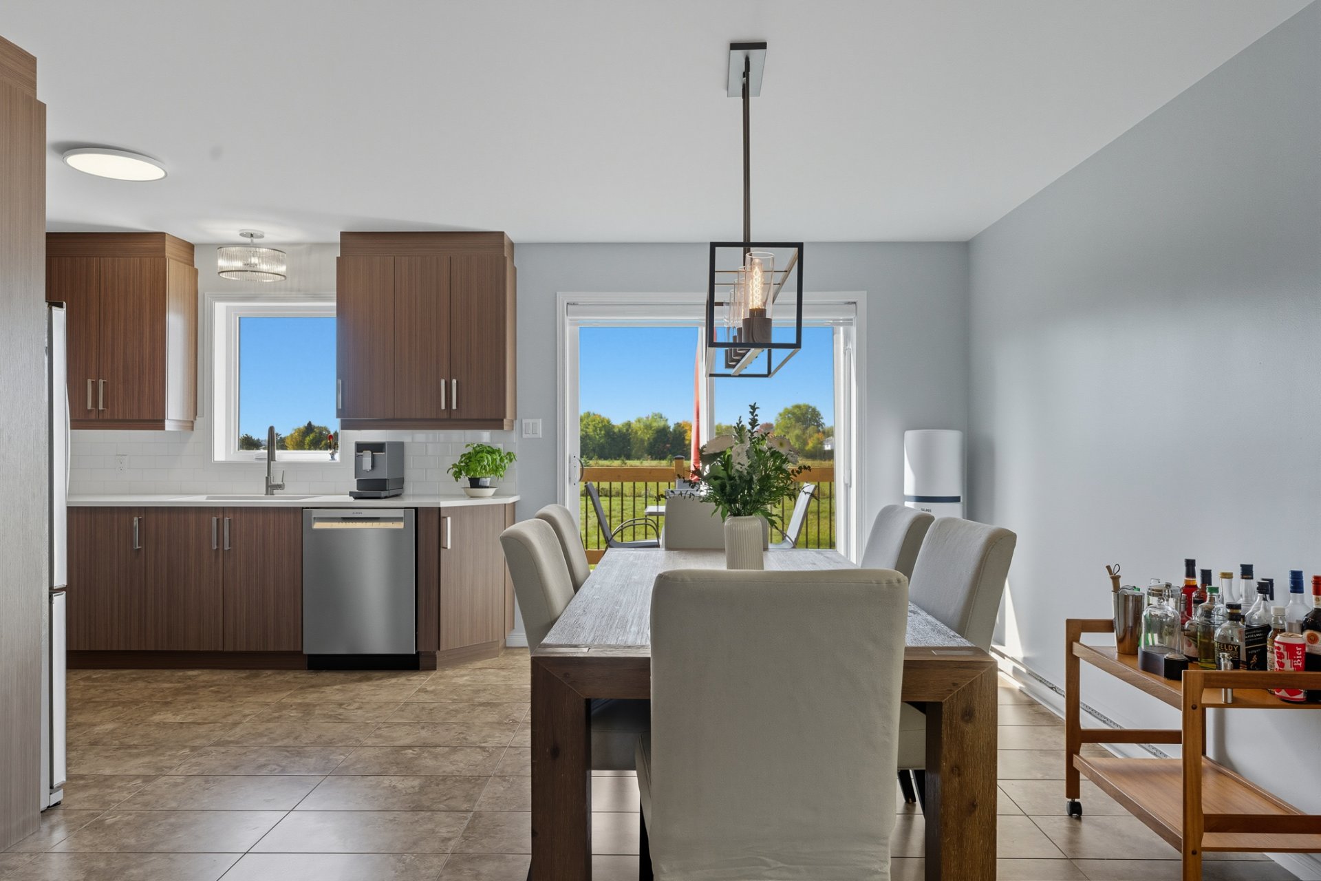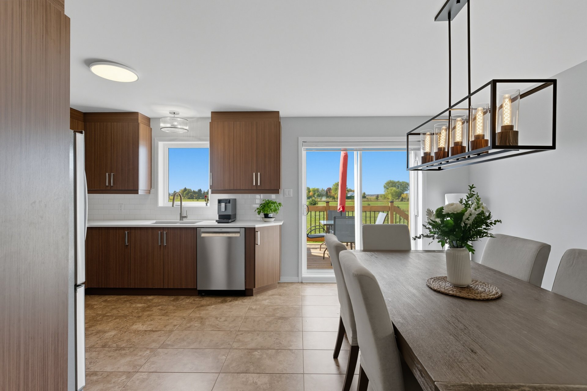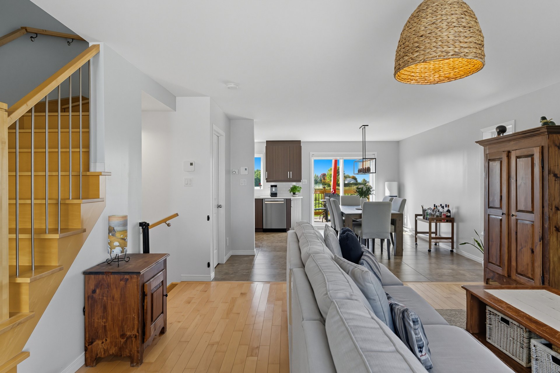 Dès l'entrée, on découvre un rez-de-chaussée à aire ouverte baigné de lumière naturelle grâce à une généreuse fenestration. Le salon, convivial et chaleureux, s'ouvre sur la salle à manger et la cuisine, créant un espace fluide et accueillant, parfait pour recevoir ou simplement profiter du quotidien. La cuisine, au design contemporain, propose des armoires abondantes et un comptoir fonctionnel.