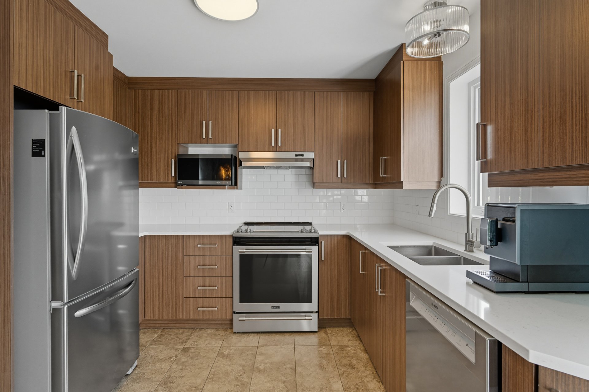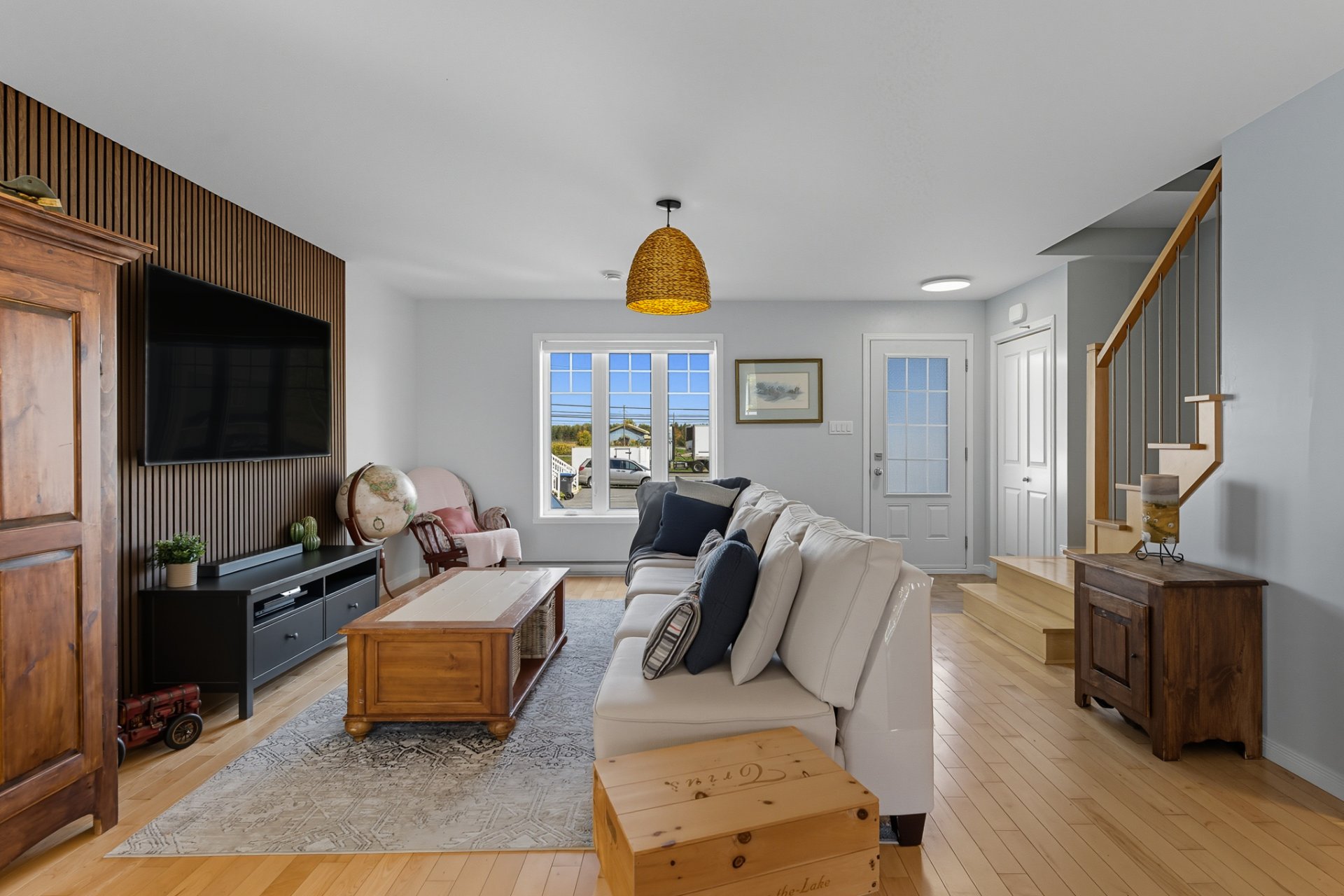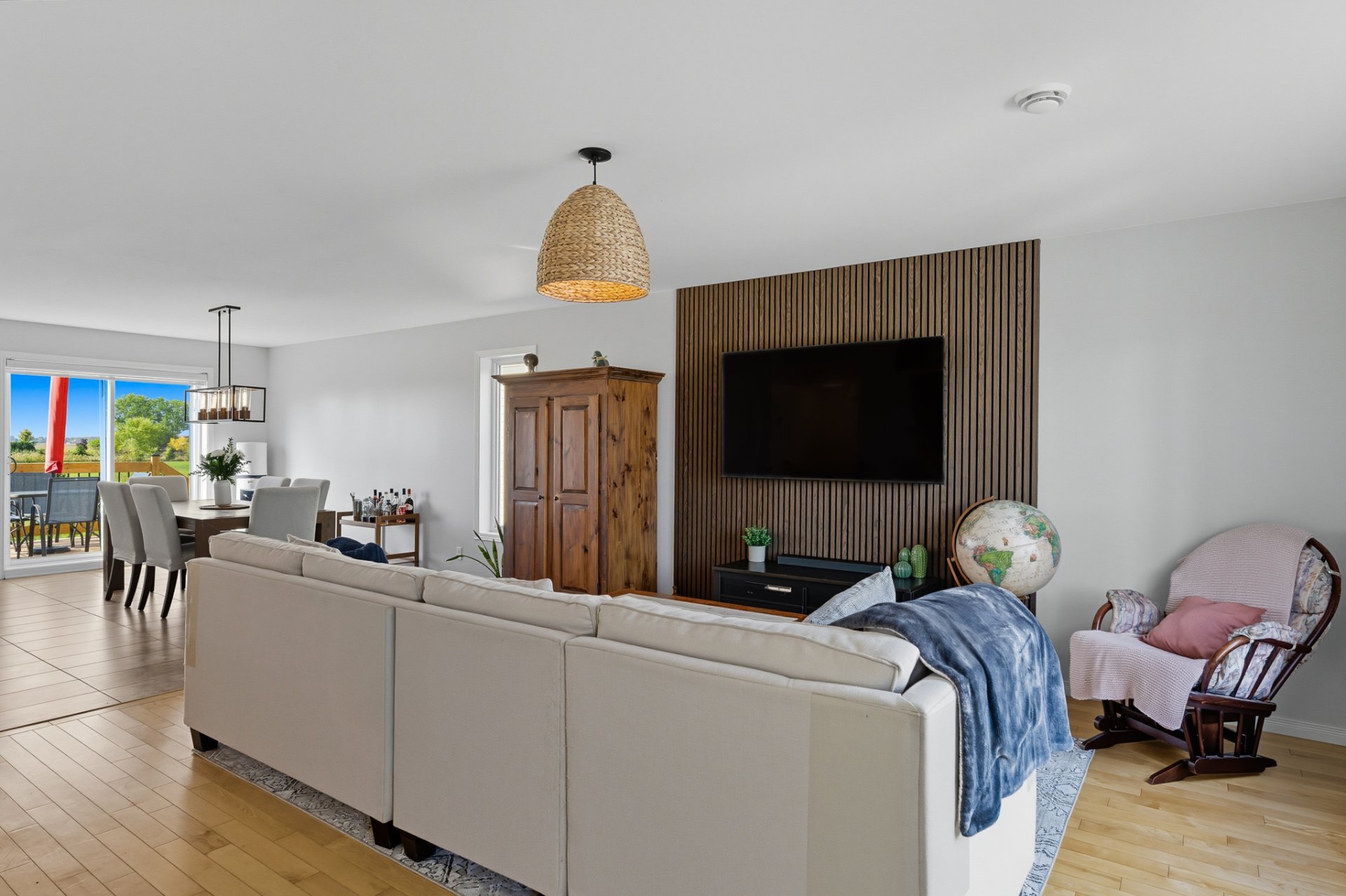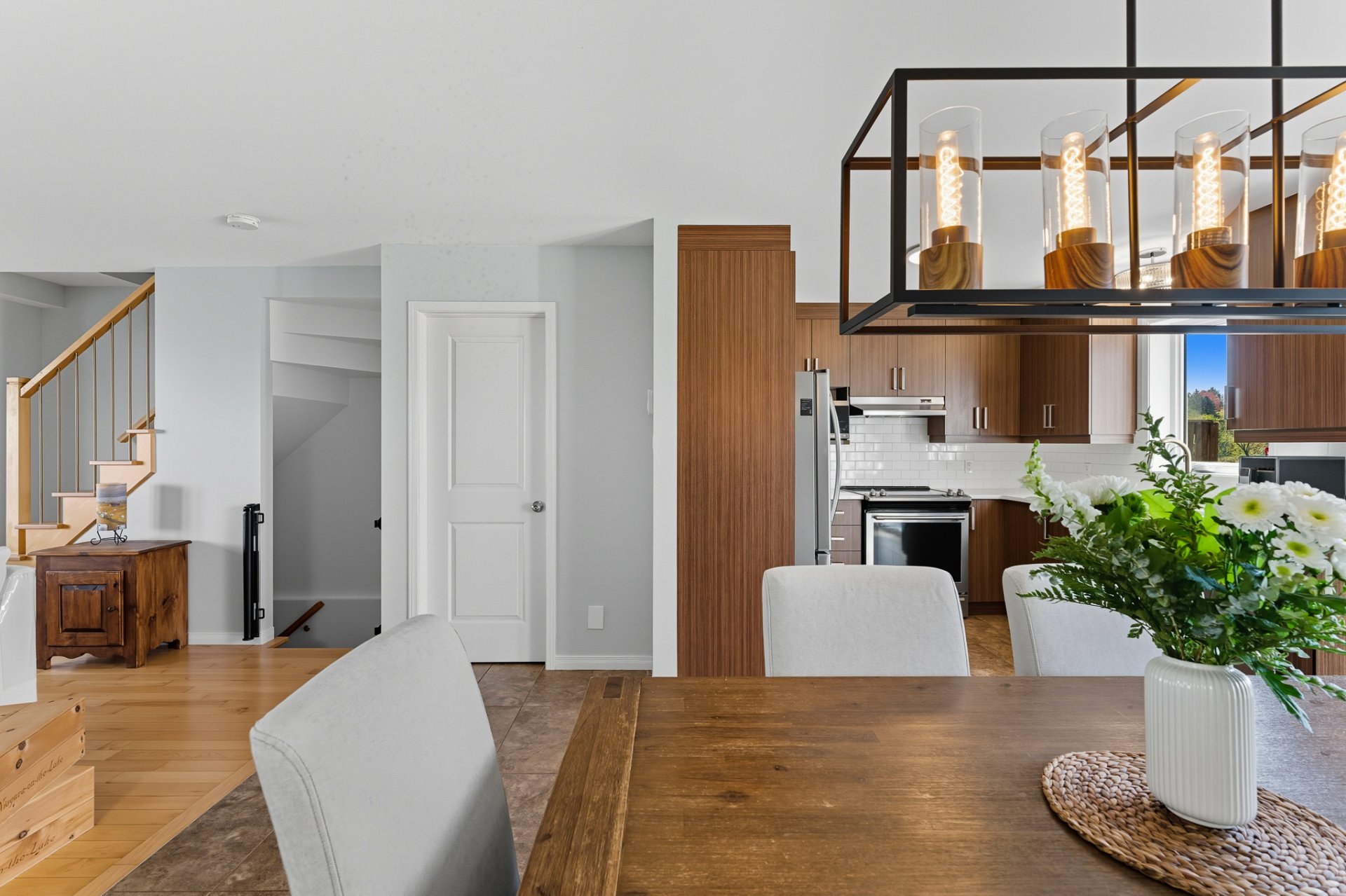 Dès l'entrée, on découvre un rez-de-chaussée à aire ouverte baigné de lumière naturelle grâce à une généreuse fenestration. Le salon, convivial et chaleureux, s'ouvre sur la salle à manger et la cuisine, créant un espace fluide et accueillant, parfait pour recevoir ou simplement profiter du quotidien. La cuisine, au design contemporain, propose des armoires abondantes et un comptoir fonctionnel.