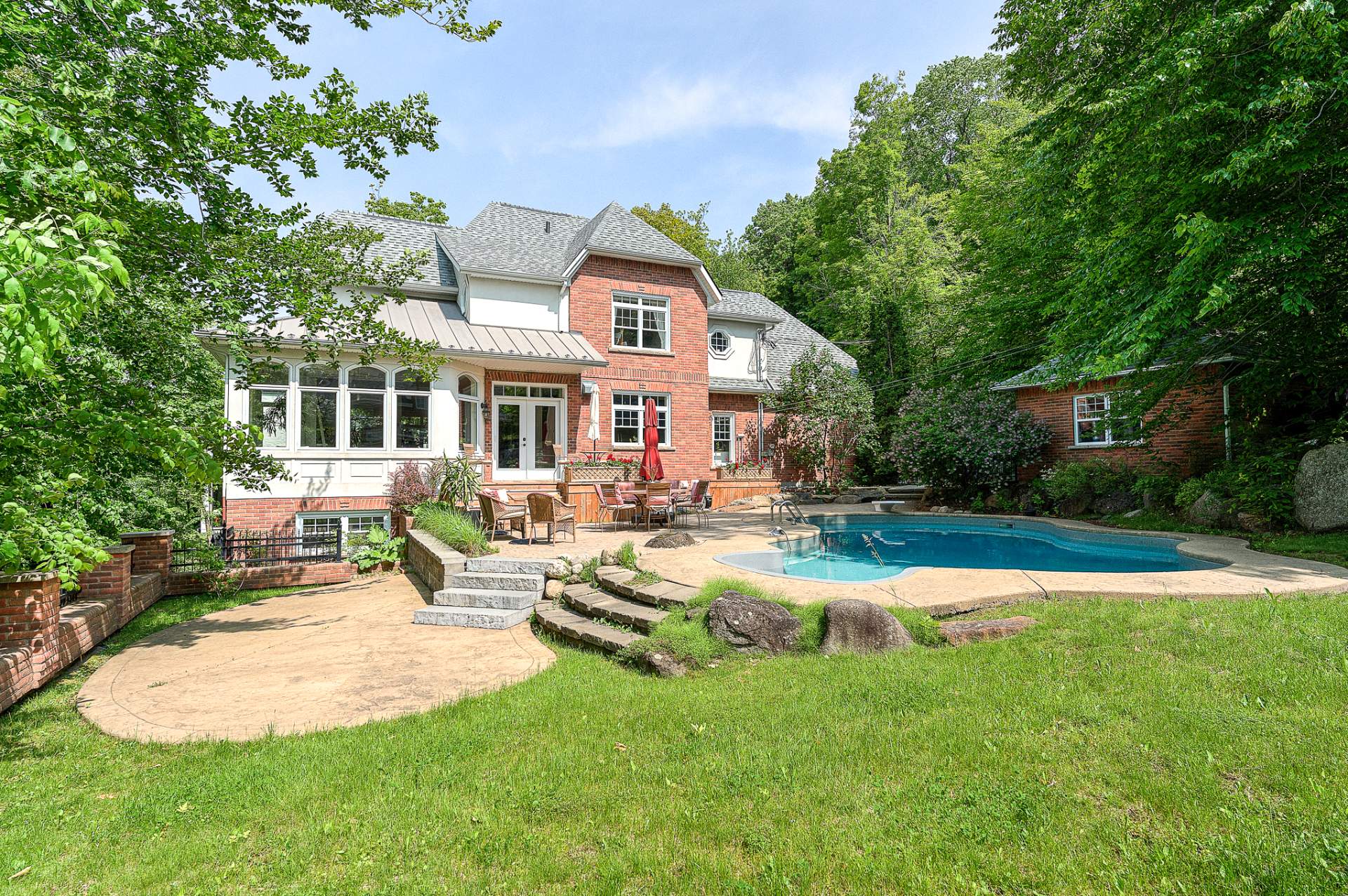 Propriété de prestige située sur la montagne à quelques pas des sentiers pédestres du parc du Mont Saint-Hilaire. Le magnifique terrain de près de 30,000 pc est superbement aménagé avec piscine creusée et grande terrasse et offre l'avantage de n'avoir aucun voisin à l'arrière. L'imposante résidence est dotée d'une fenestration abondante qui permet de jouir d'une grande luminosité et d'apprécier la vue sur la montagne. Le RDC à aire ouverte offre des pièces de vie conviviales avec plafond cathédrale et poutres apparentes. Plusieurs rénovations ont été effectuées au cours des ans afin d'obtenir un décor impeccable et un confort maximal.