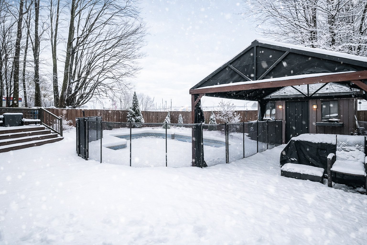 La cour arrière, entièrement aménagée et bordée d'arbres matures, procure une intimité recherchée. Vous y trouverez une superbe piscine creusée et chauffée, une grande terrasse rénovée et un espace idéal pour profiter de la belle saison en toute quiétude. Située dans un secteur paisible, la propriété se trouve à proximité des écoles, d'un parc et d'un club de golf.