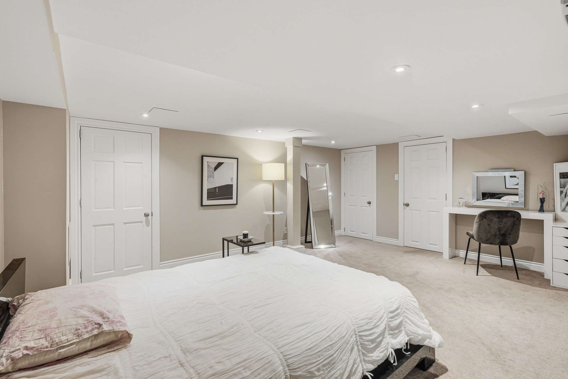 Le niveau inférieur propose un vaste sous-sol aménagé avec une cinquième chambre, un walk-in et une salle de bains attenante, ainsi qu'une grande salle mécanique/de rangement offrant beaucoup d'espace pour l'organisation. Un accès direct à l'extérieur mène à la cour arrière, et un vestiaire pratique facilite le quotidien.