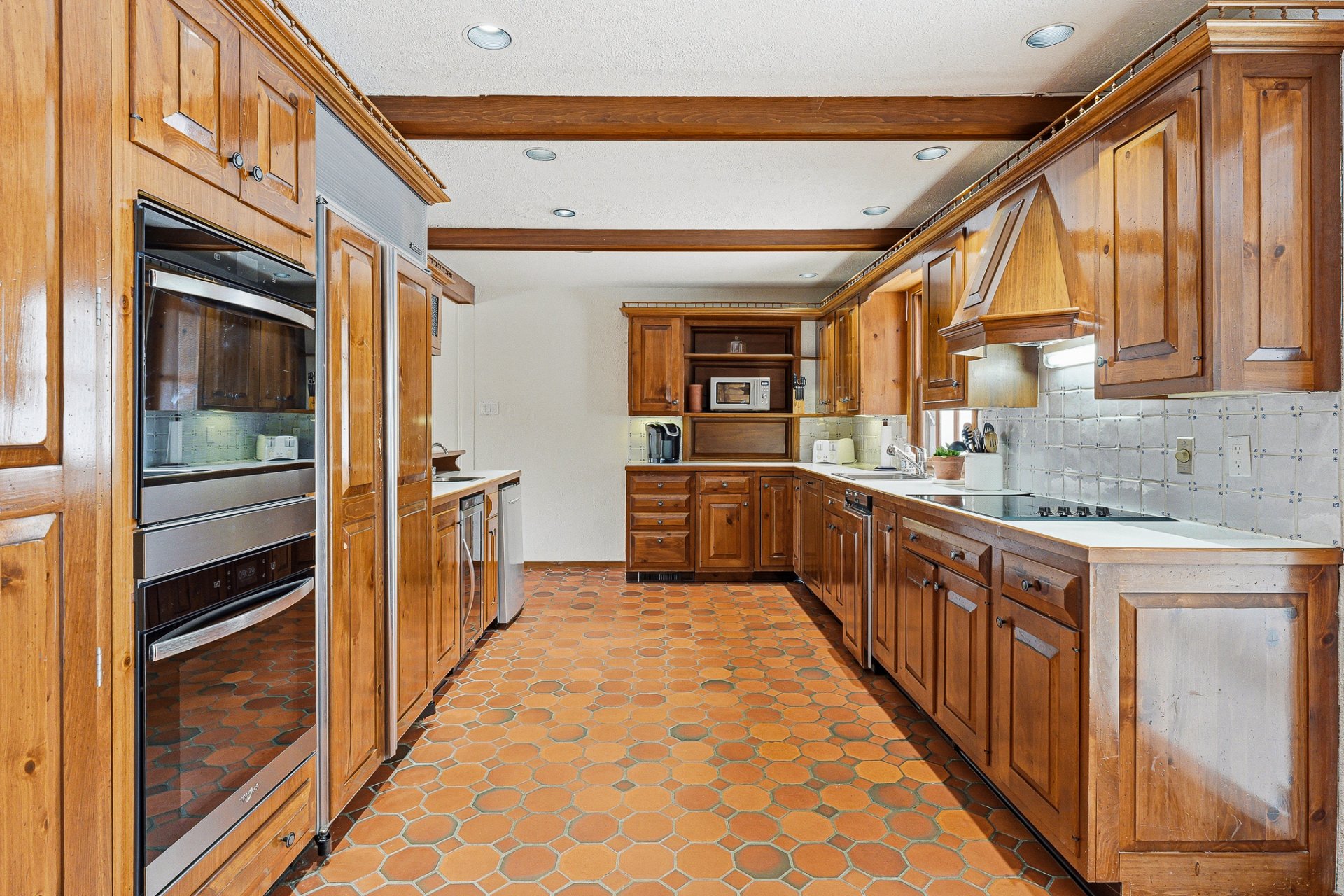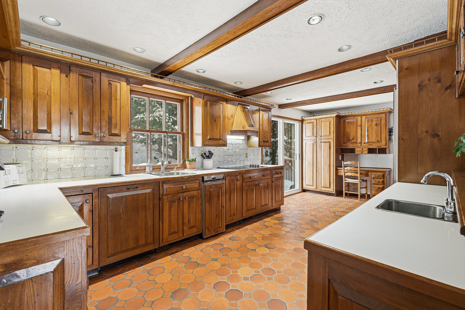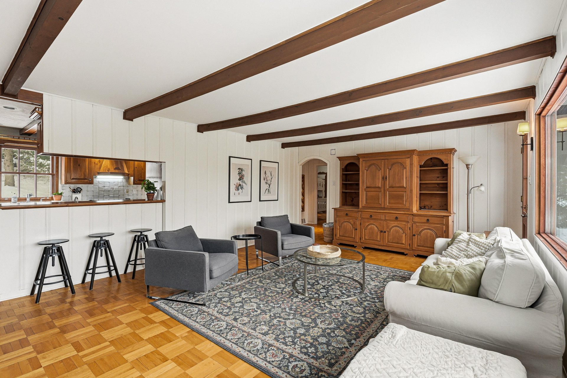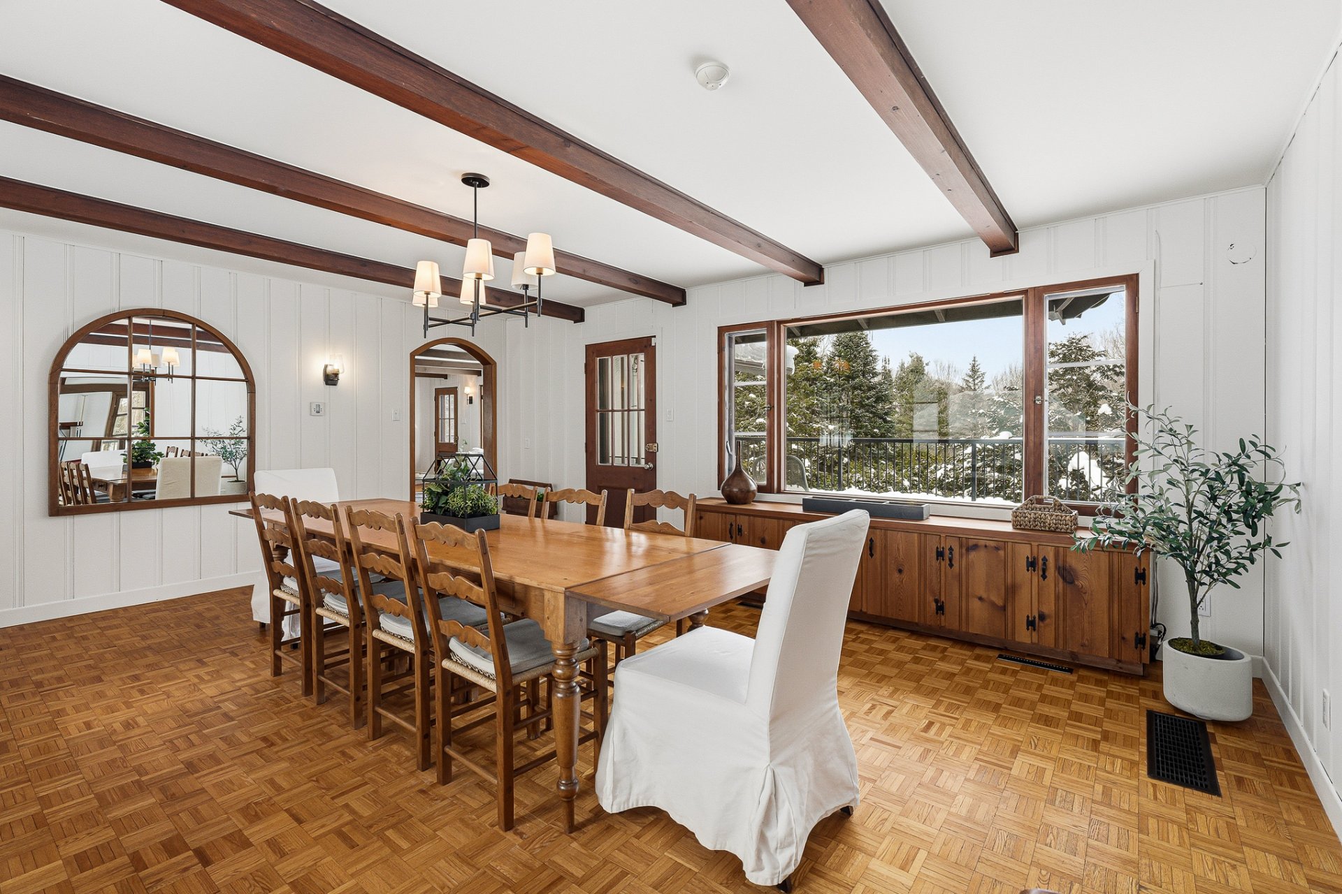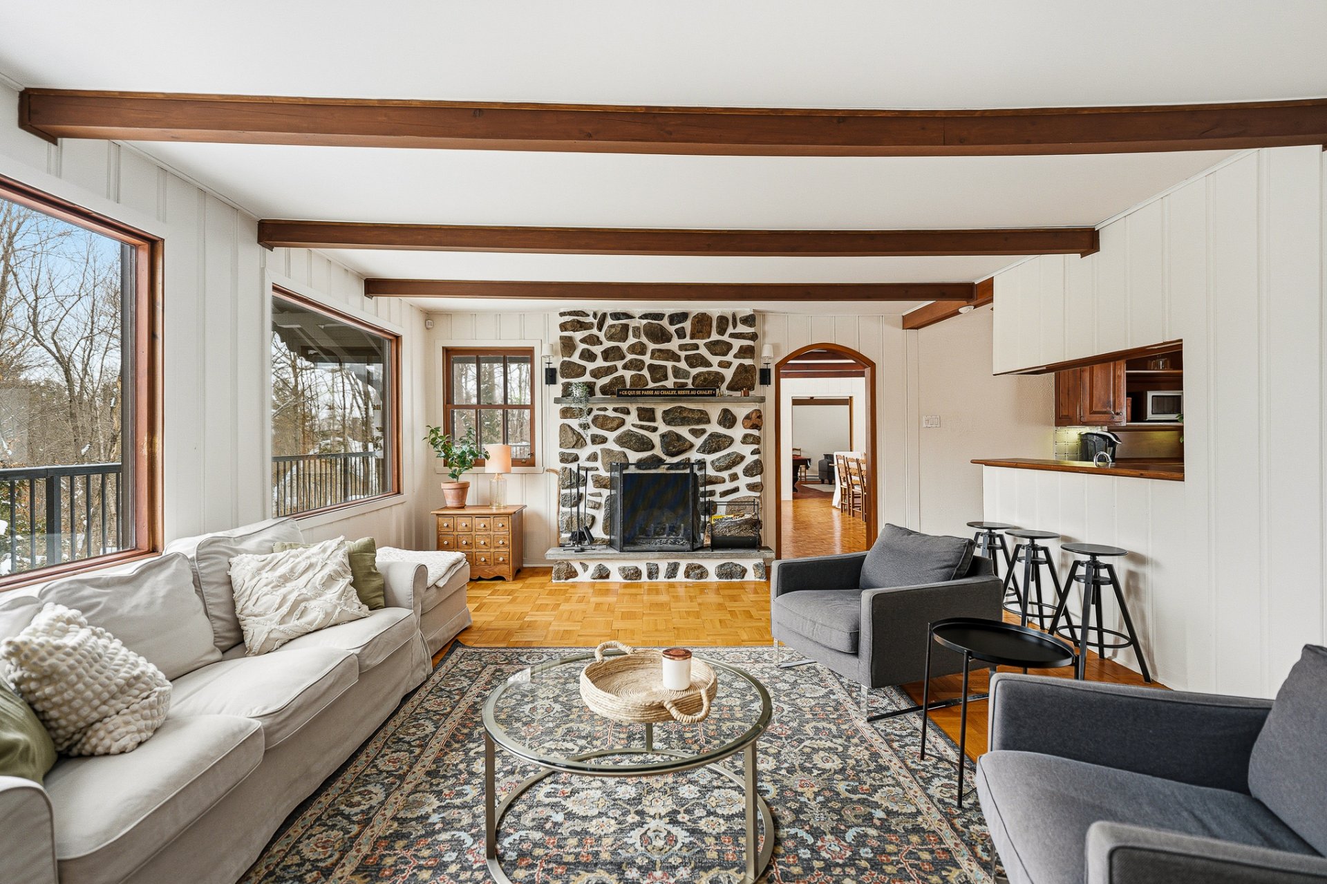 À l'étage principal, l'atmosphère authentique se dévoile à travers ses poutres de bois apparentes, ses riches boiseries et ses espaces baignés de lumière naturelle. Le grand salon, spacieux et invitant, profite d'une fenestration abondante et est agrémenté d'un foyer au bois recouvert de pierre, créant un point focal spectaculaire et une ambiance des plus chaleureuses donnant accès à une deuxième terrasse. Il s'ouvre harmonieusement sur la salle à manger, elle aussi de belles dimensions et largement fenestrée, ainsi que sur la salle familiale. Cuisine offrant une abondance de rangement et une grande porte-patio menant à l'une des terrasses.