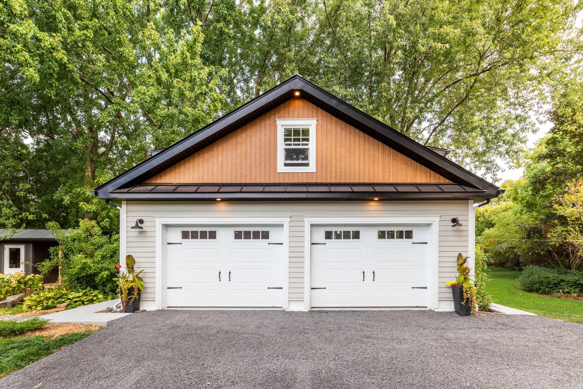 + Garage double haut de gamme : plancher chauffant au glycol, drain, chauffage additionnel au plafond, cuve avec eau courante, revêtement intérieur métal & bois, vaste espace ouvert à l'étage.