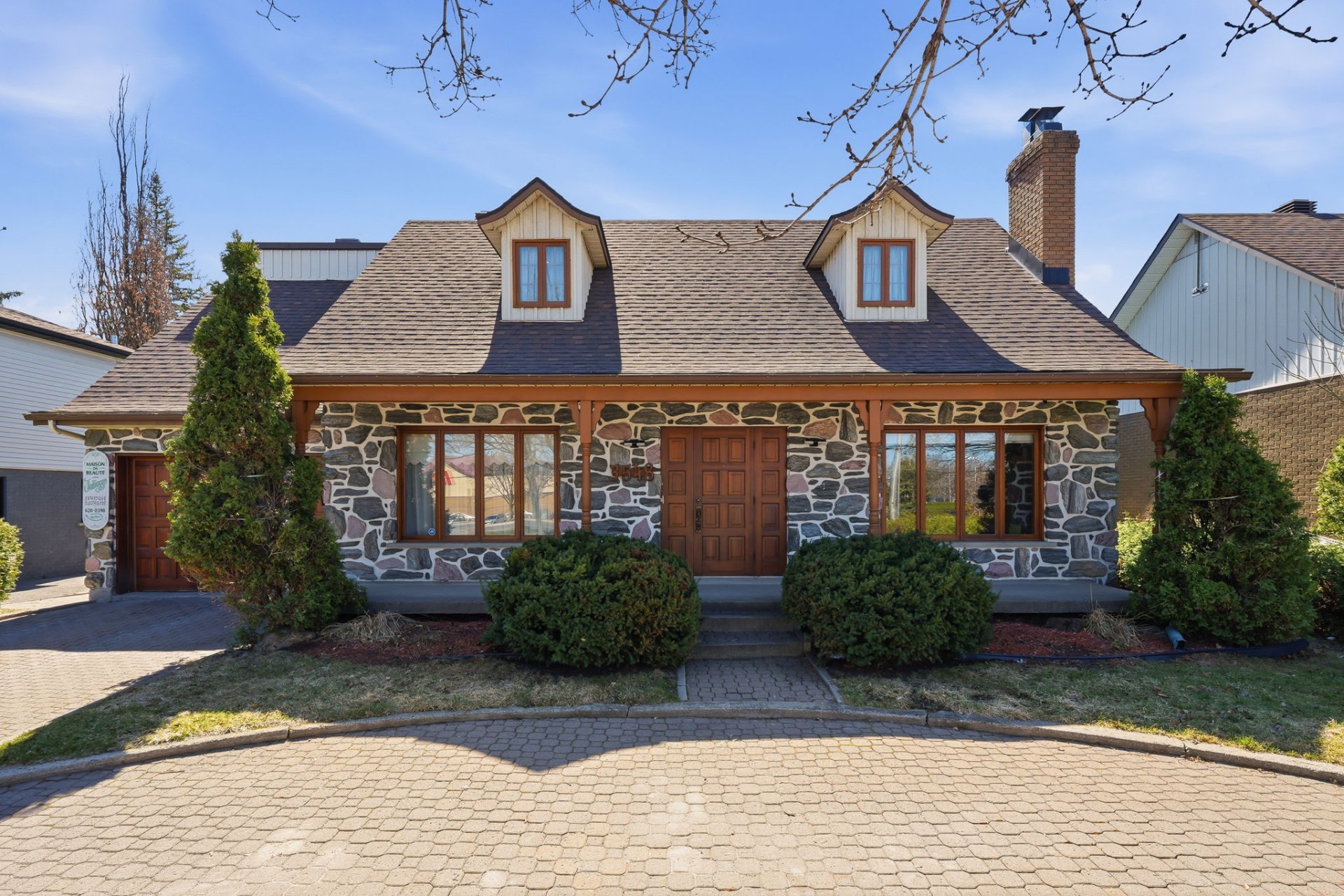 Jolie maison québécoise avec façade en pierre et entrée en rond-point, offrant beaucoup de cachet.