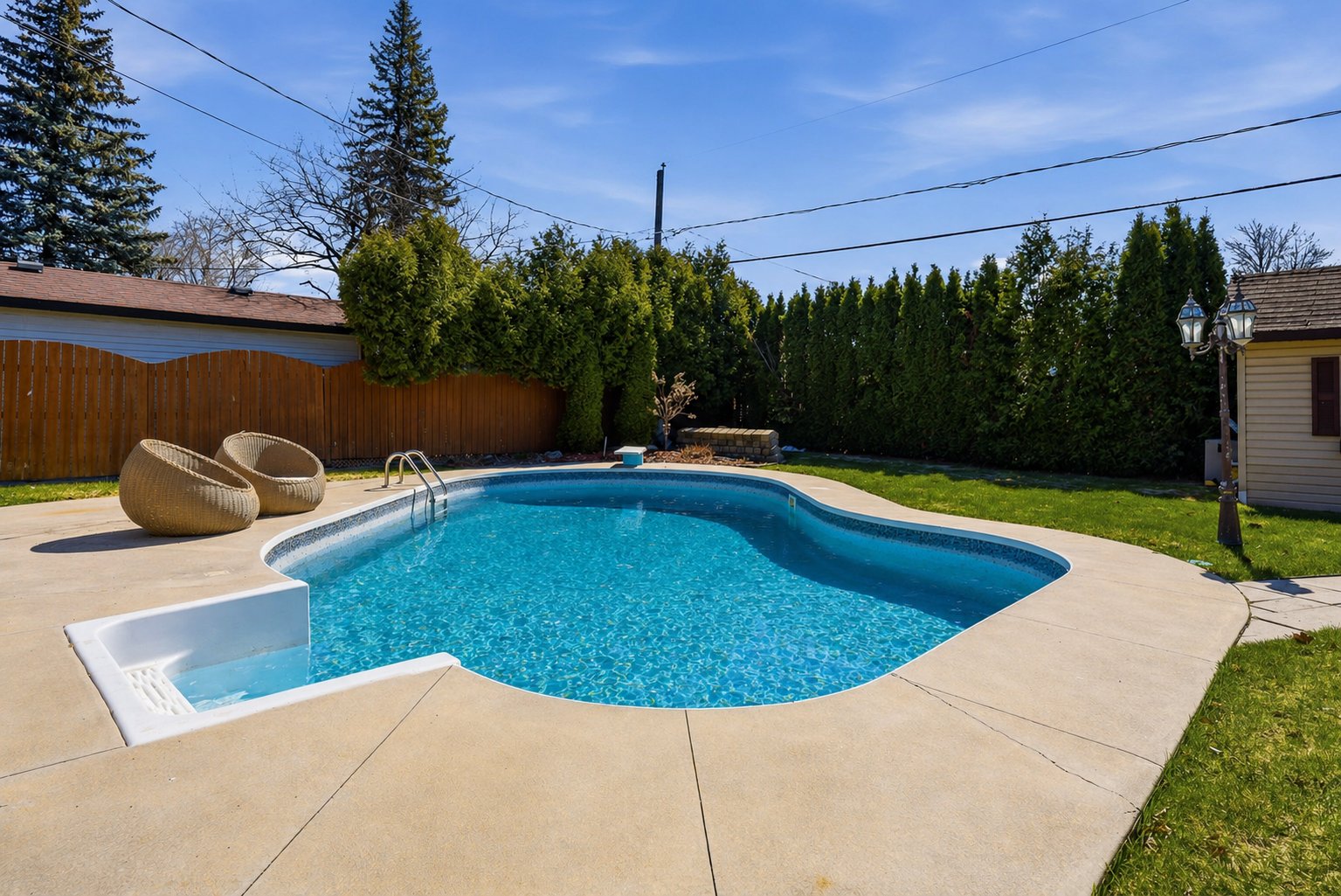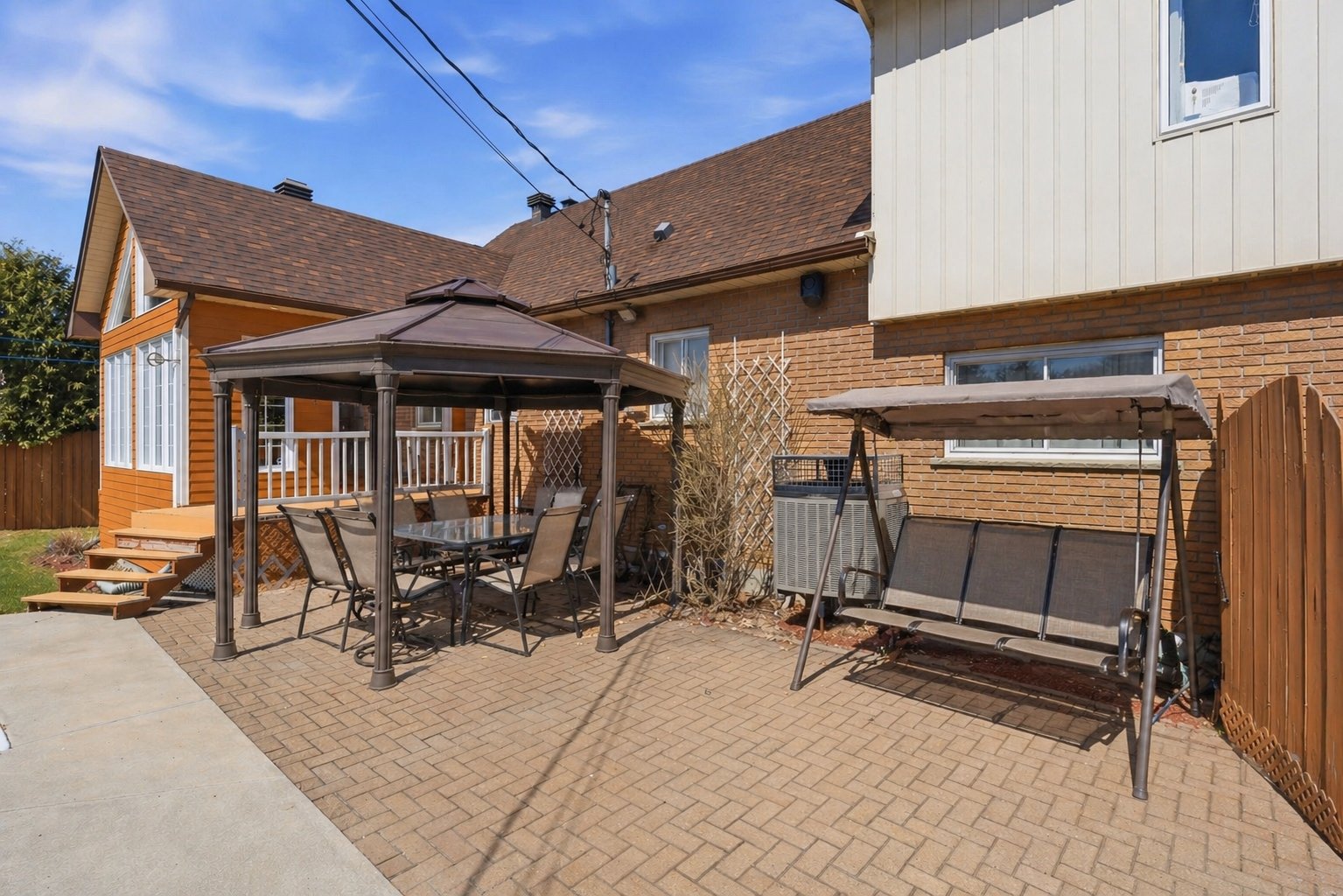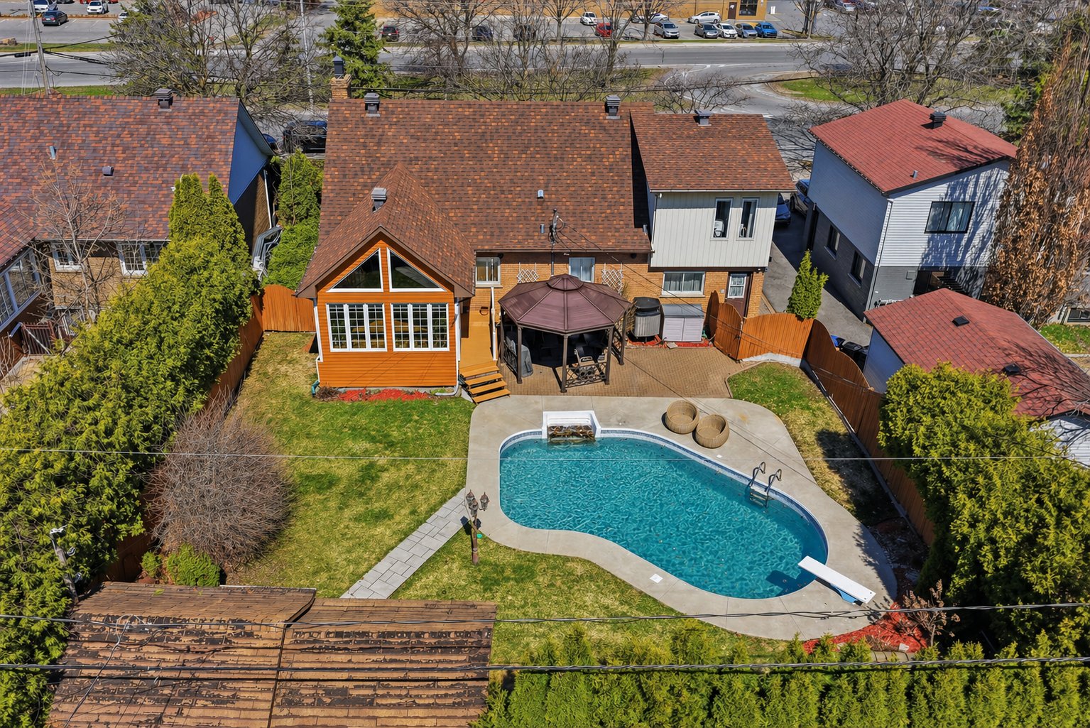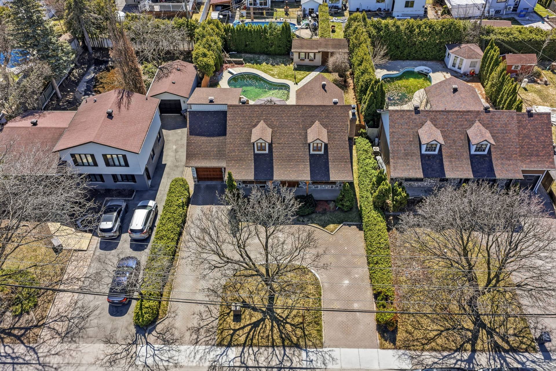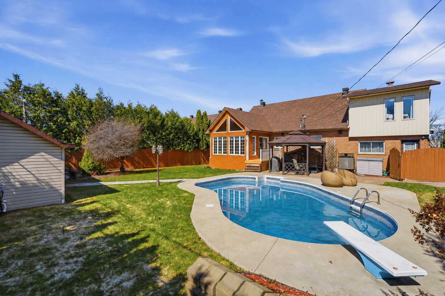 À l'extérieur, la cour invite à profiter de l'été avec sa piscine creusée chauffée. Les haies matures procurent une belle intimité, et un cabanon ainsi qu'un garage avec porte indépendante ajoutent un côté pratique.