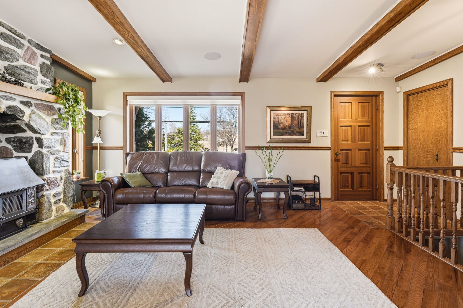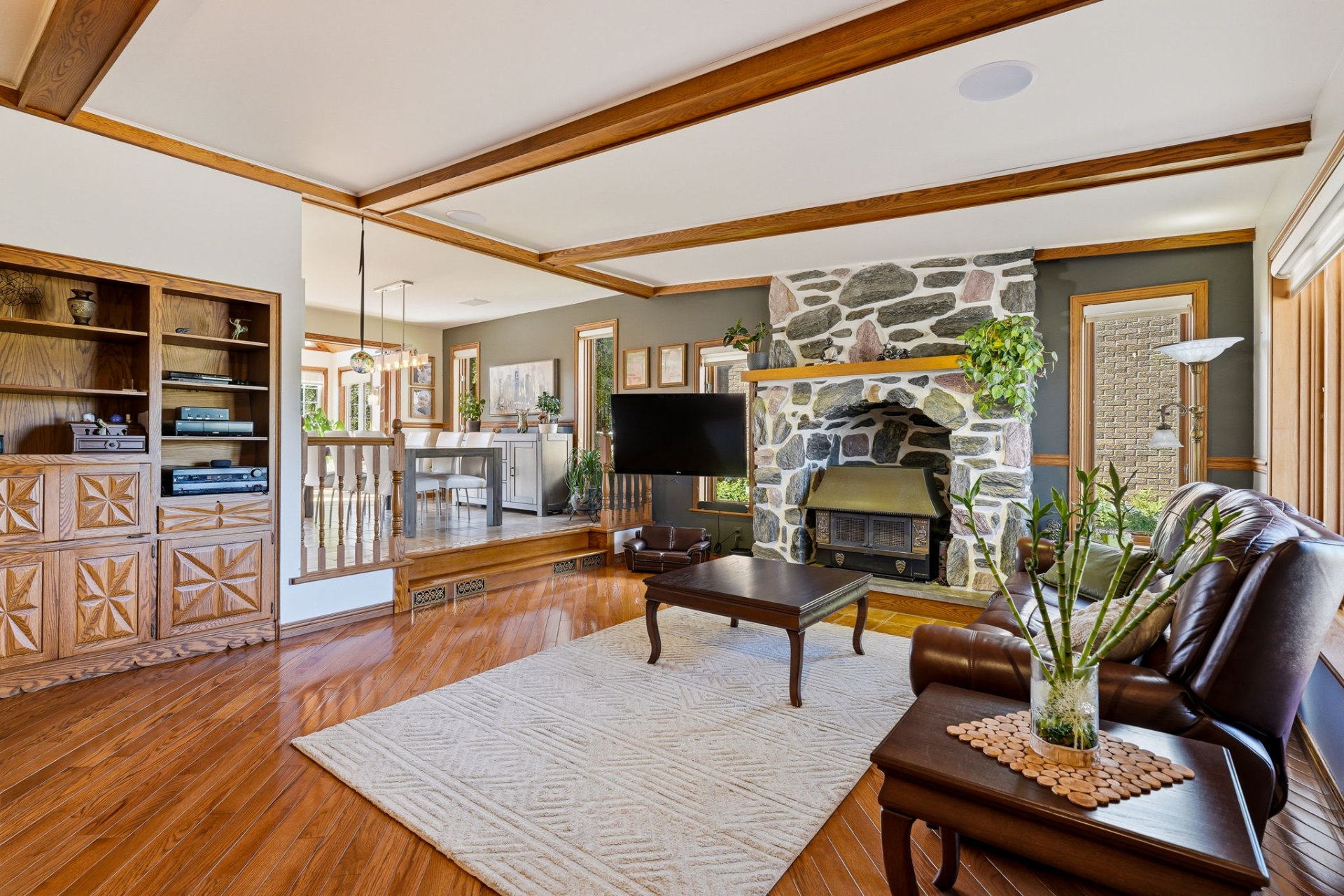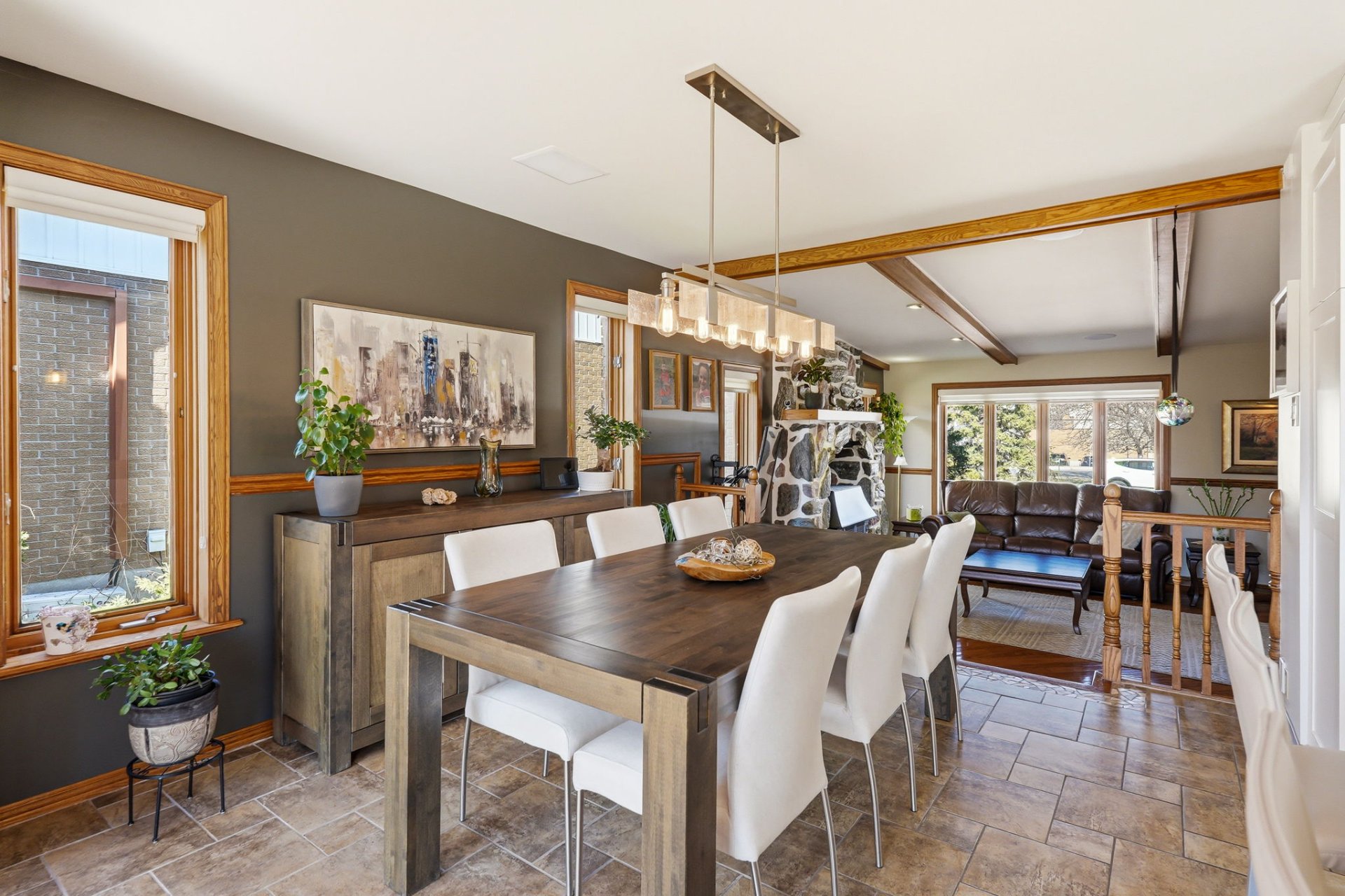 Dès le rez-de-chaussée, on apprécie la belle luminosité naturelle grâce à une généreuse fenestration. Les espaces de vie sont ouverts et agréables, parfaits pour le quotidien. Le salon, avec ses poutres de bois apparentes, son foyer au bois et son manteau en pierre, crée une ambiance chaleureuse et accueillante. On y trouve aussi une chambre, une salle de bains ainsi qu'une verrière avec toit cathédrale, baignée de lumière et idéale comme coin détente.