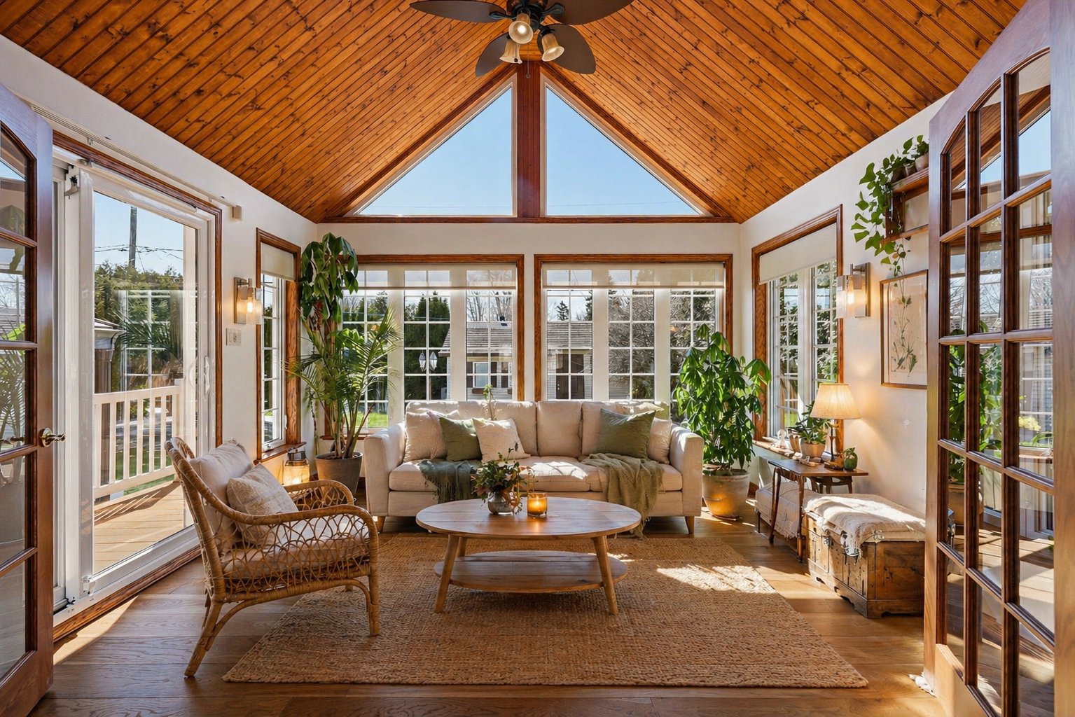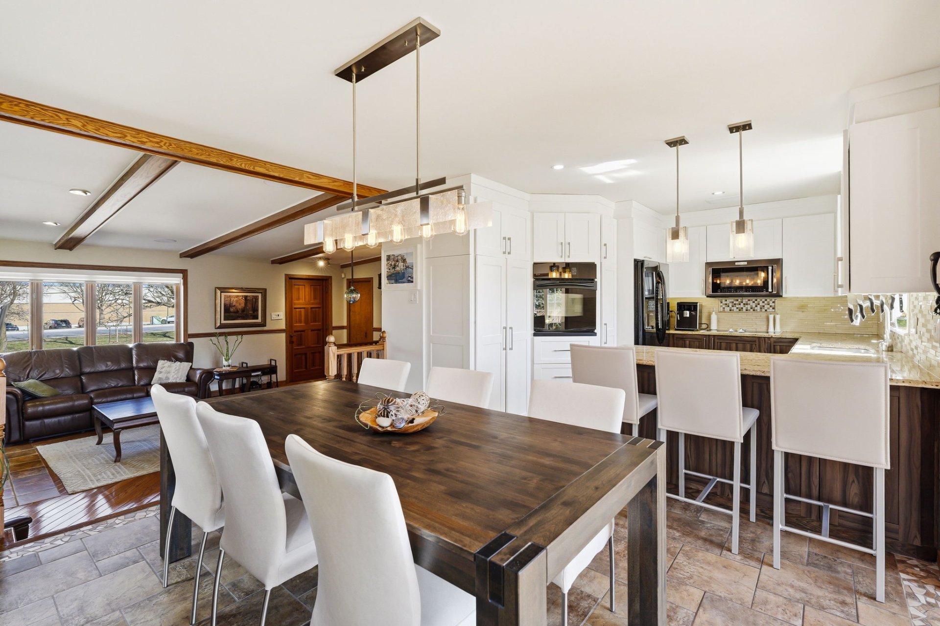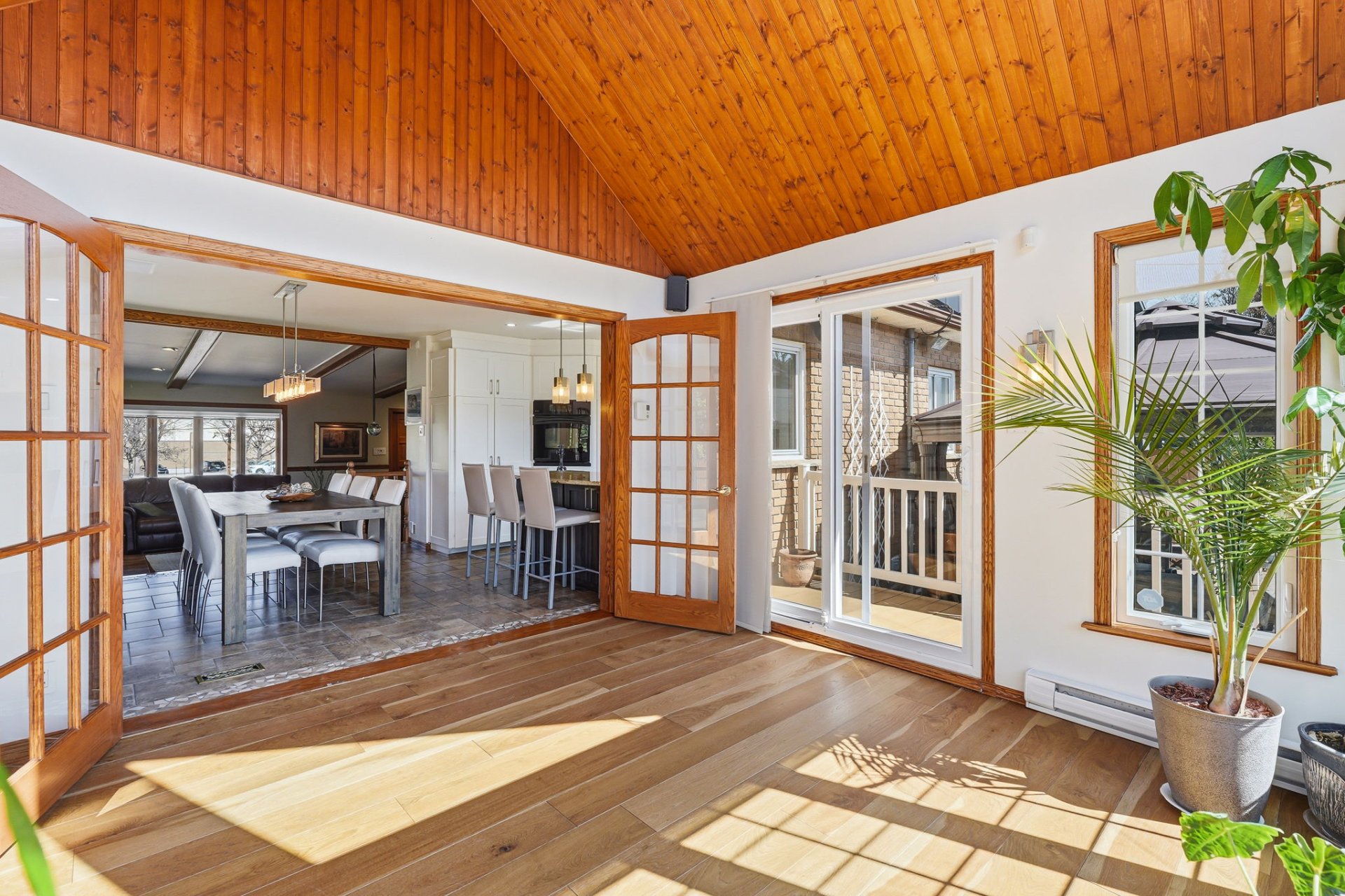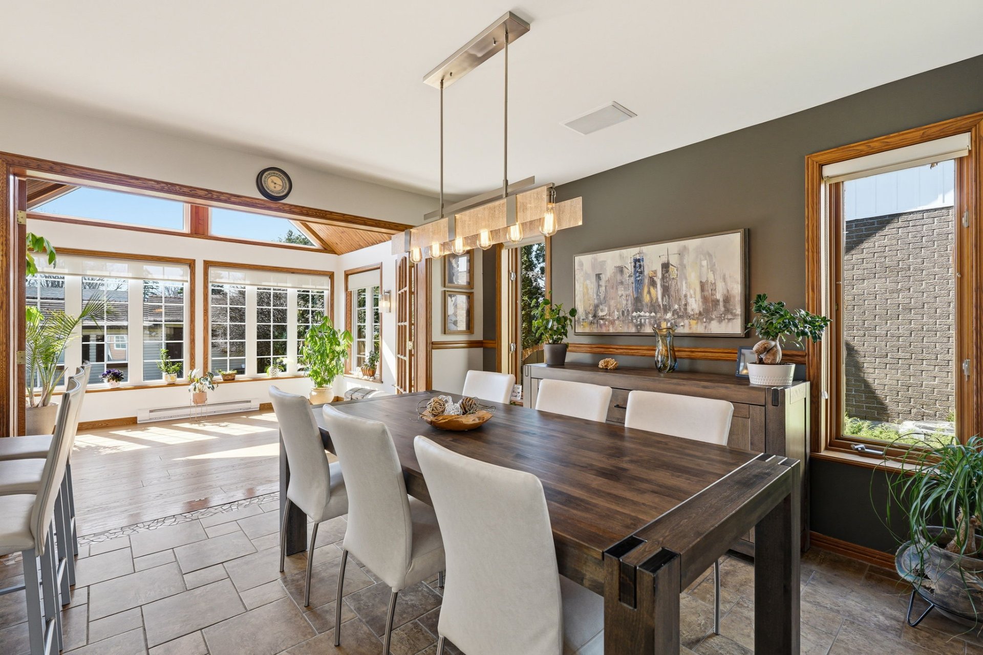 Dès le rez-de-chaussée, on apprécie la belle luminosité naturelle grâce à une généreuse fenestration. Les espaces de vie sont ouverts et agréables, parfaits pour le quotidien. Le salon, avec ses poutres de bois apparentes, son foyer au bois et son manteau en pierre, crée une ambiance chaleureuse et accueillante. On y trouve aussi une chambre, une salle de bains ainsi qu'une verrière avec toit cathédrale, baignée de lumière et idéale comme coin détente.