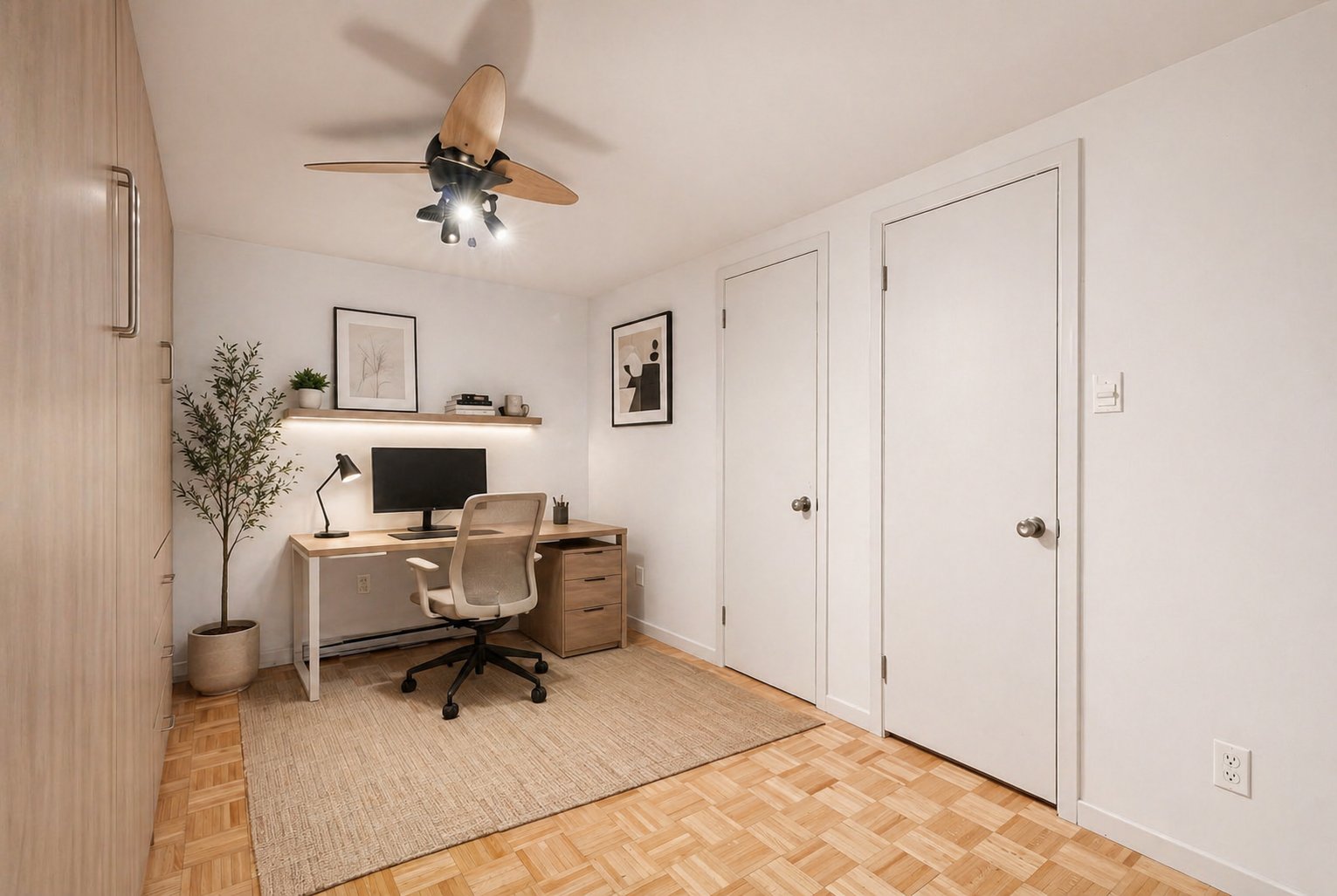 À l'étage, une pièce polyvalente peut facilement servir de troisième chambre ou d'espace bureau, avec une salle d'eau attenante.