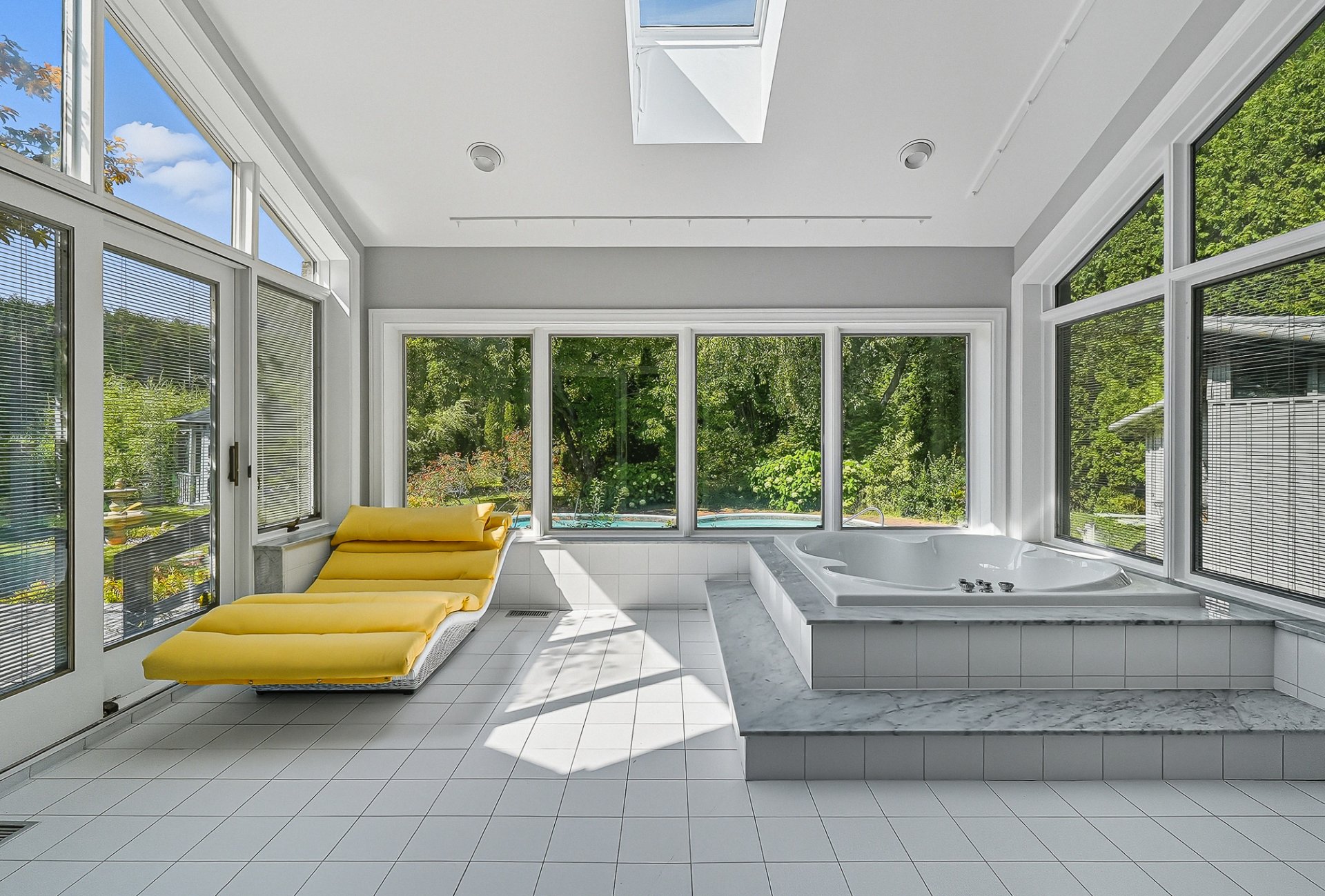 Au rez-de-chaussée, la maison principale propose de généreux espaces de vie avec hauts plafonds et fenestration abondante, laissant entrer une lumière naturelle remarquable et offrant une superbe vue sur la cour. La cuisine, à la fois fonctionnelle et conviviale, est ouverte sur le coin repas, tandis qu'un deuxième salon adjacent à la véranda, avec spa intégré et puits de lumière, complète l'espace. On y retrouve également deux chambres, dont une suite principale sur deux niveaux.