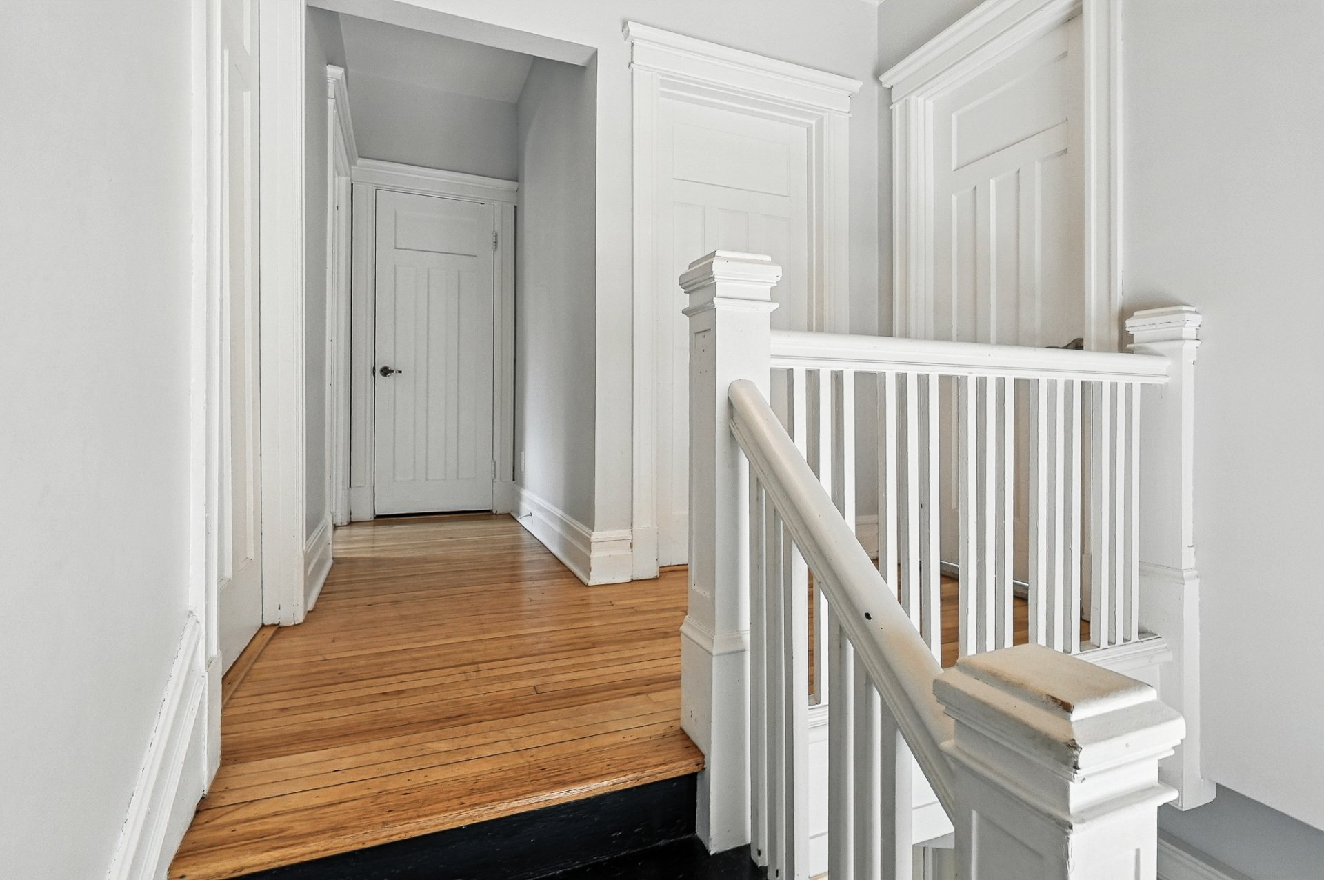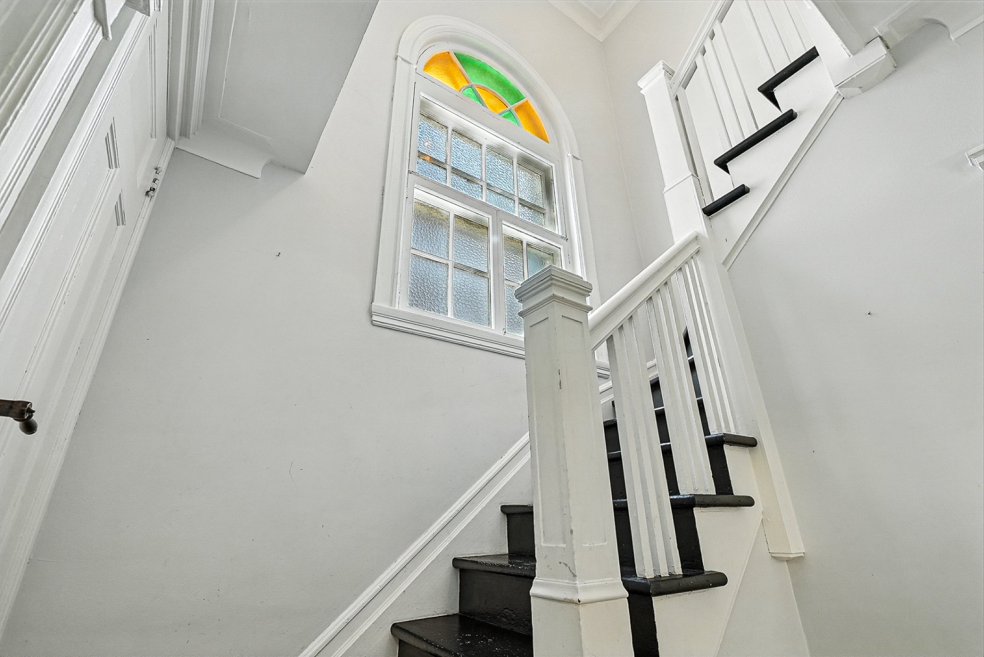 * Hall central avec escalier de bois, rangement fermé et vitraux