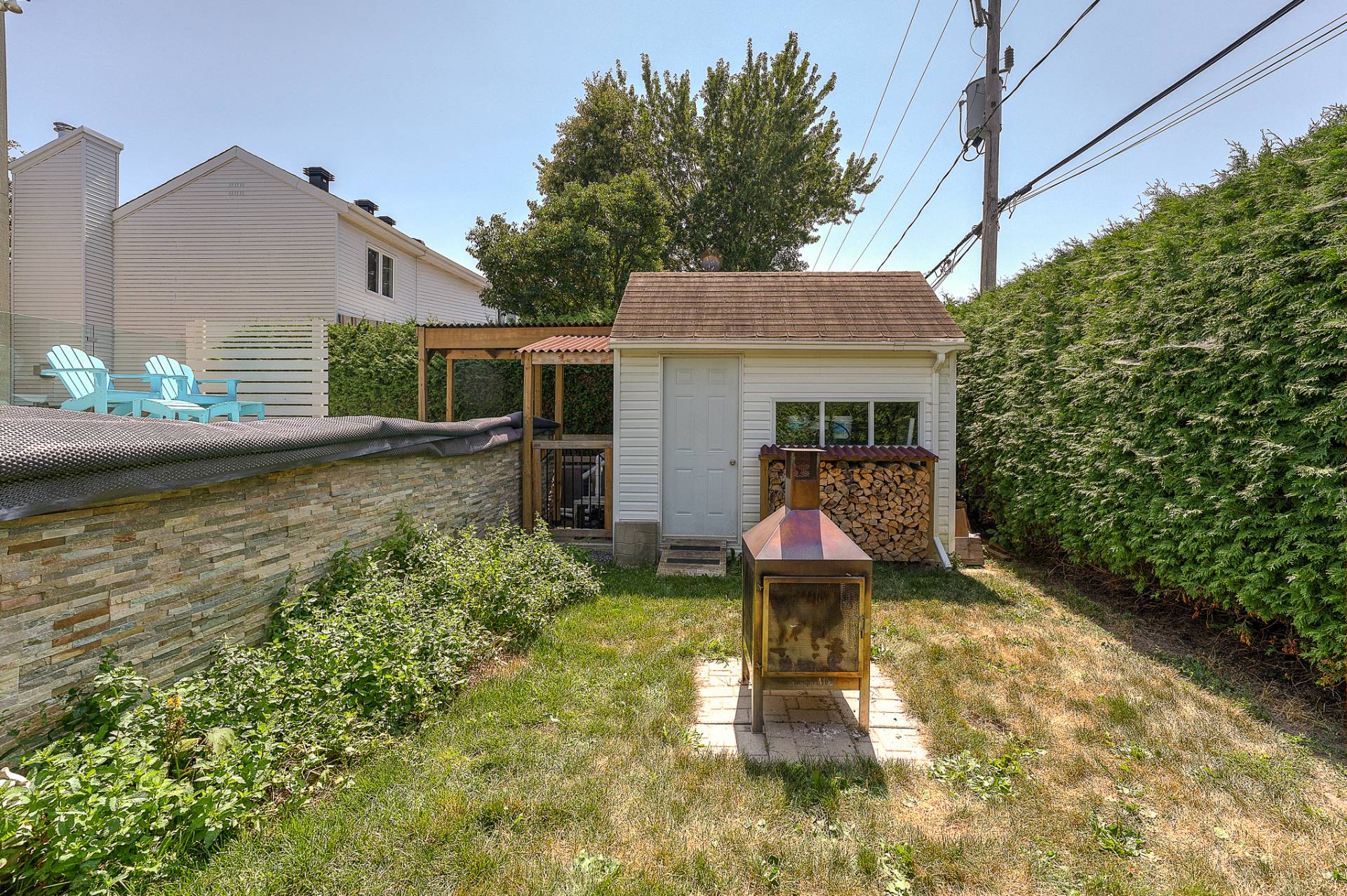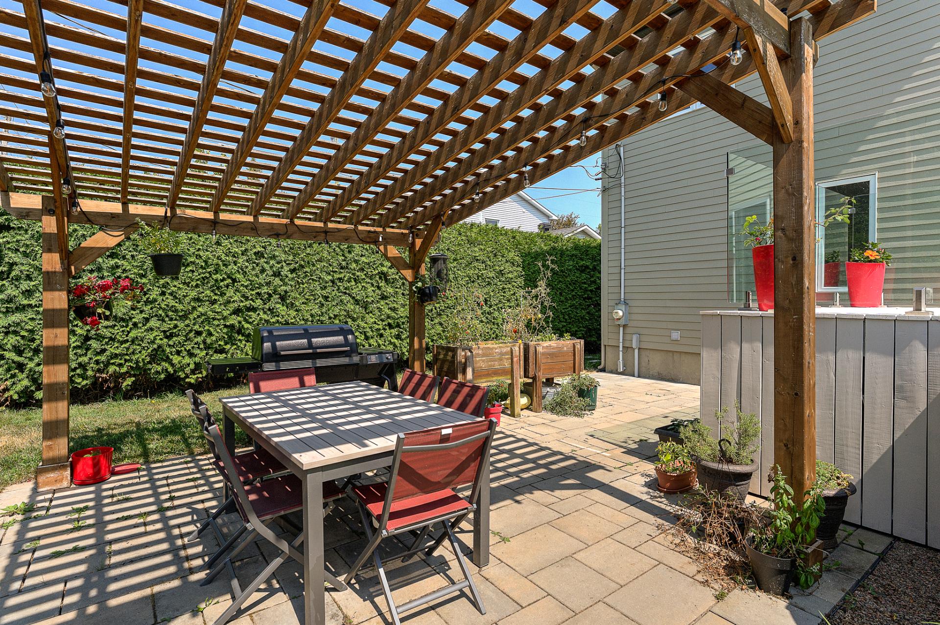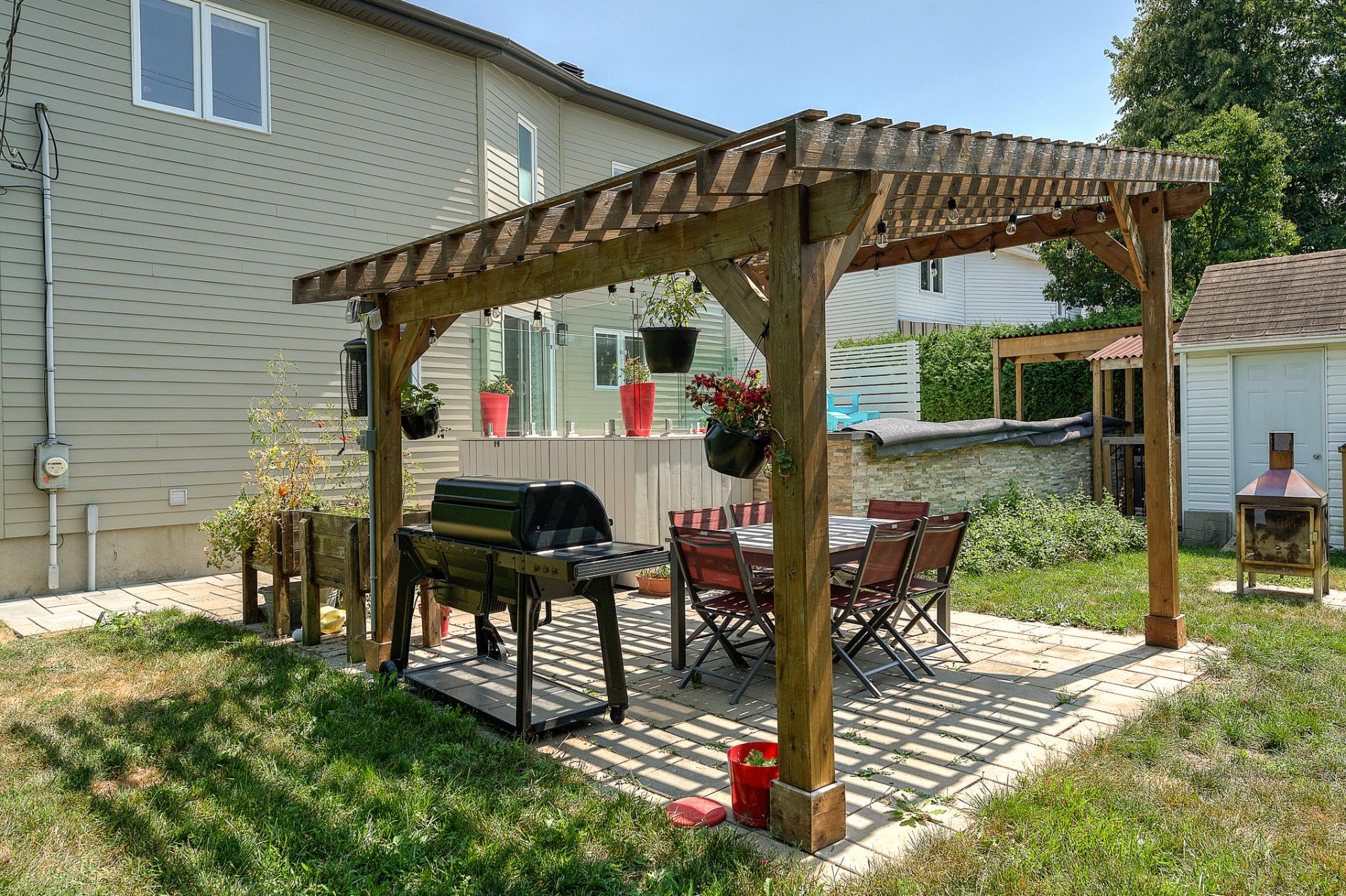 À l'extérieur, la cour arrière est un véritable oasis privé. Une piscine hors terre, parfaitement intégrée dans un patio de niveau, invite aux après-midis ensoleillés, tandis qu'un coin feu chaleureux prolonge les soirées d'été. Un cabanon pratique et des aménagements paysagers soignés complètent ce tableau enchanteur.