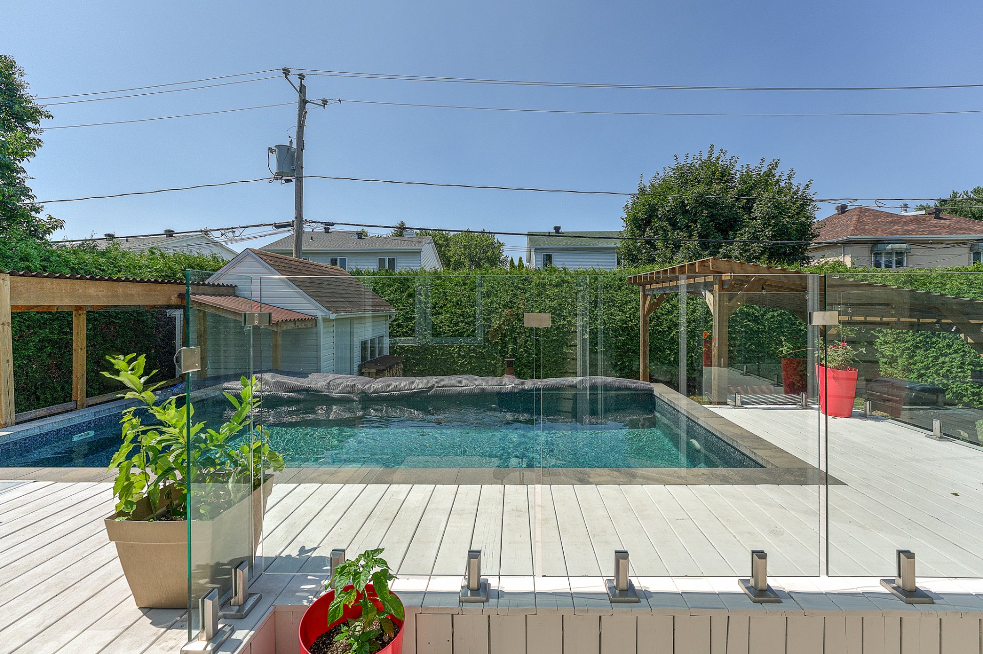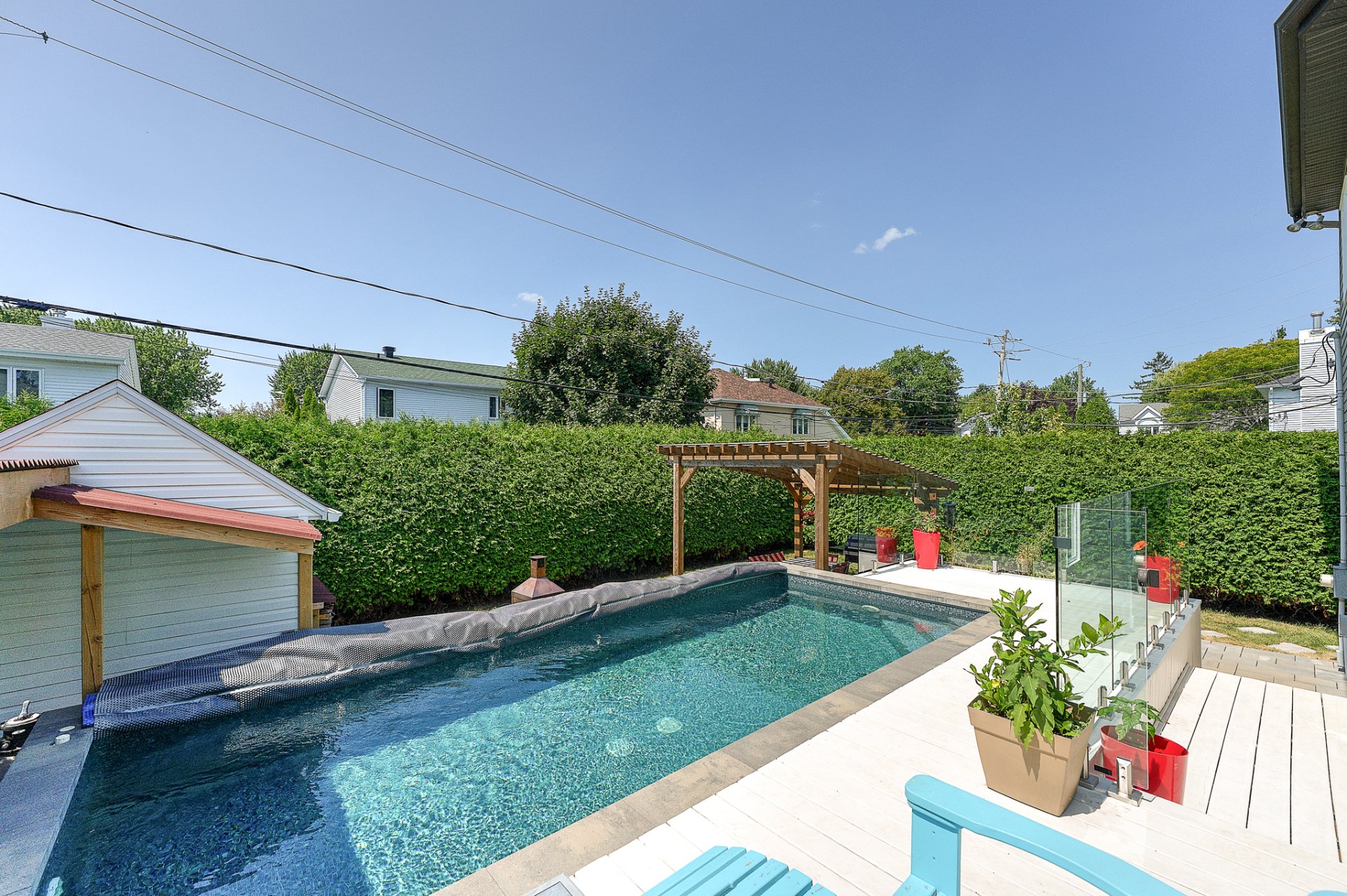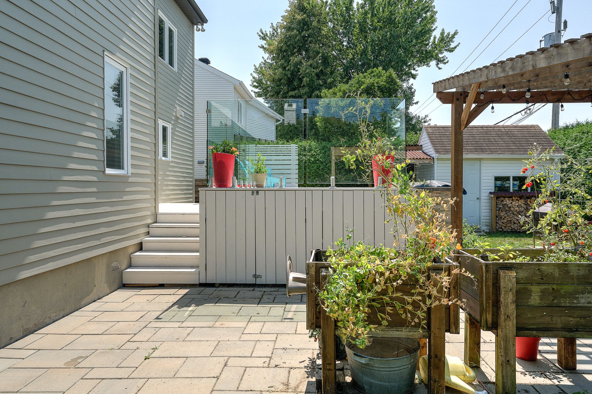 À l'extérieur, la cour arrière est un véritable oasis privé. Une piscine hors terre, parfaitement intégrée dans un patio de niveau, invite aux après-midis ensoleillés, tandis qu'un coin feu chaleureux prolonge les soirées d'été. Un cabanon pratique et des aménagements paysagers soignés complètent ce tableau enchanteur.