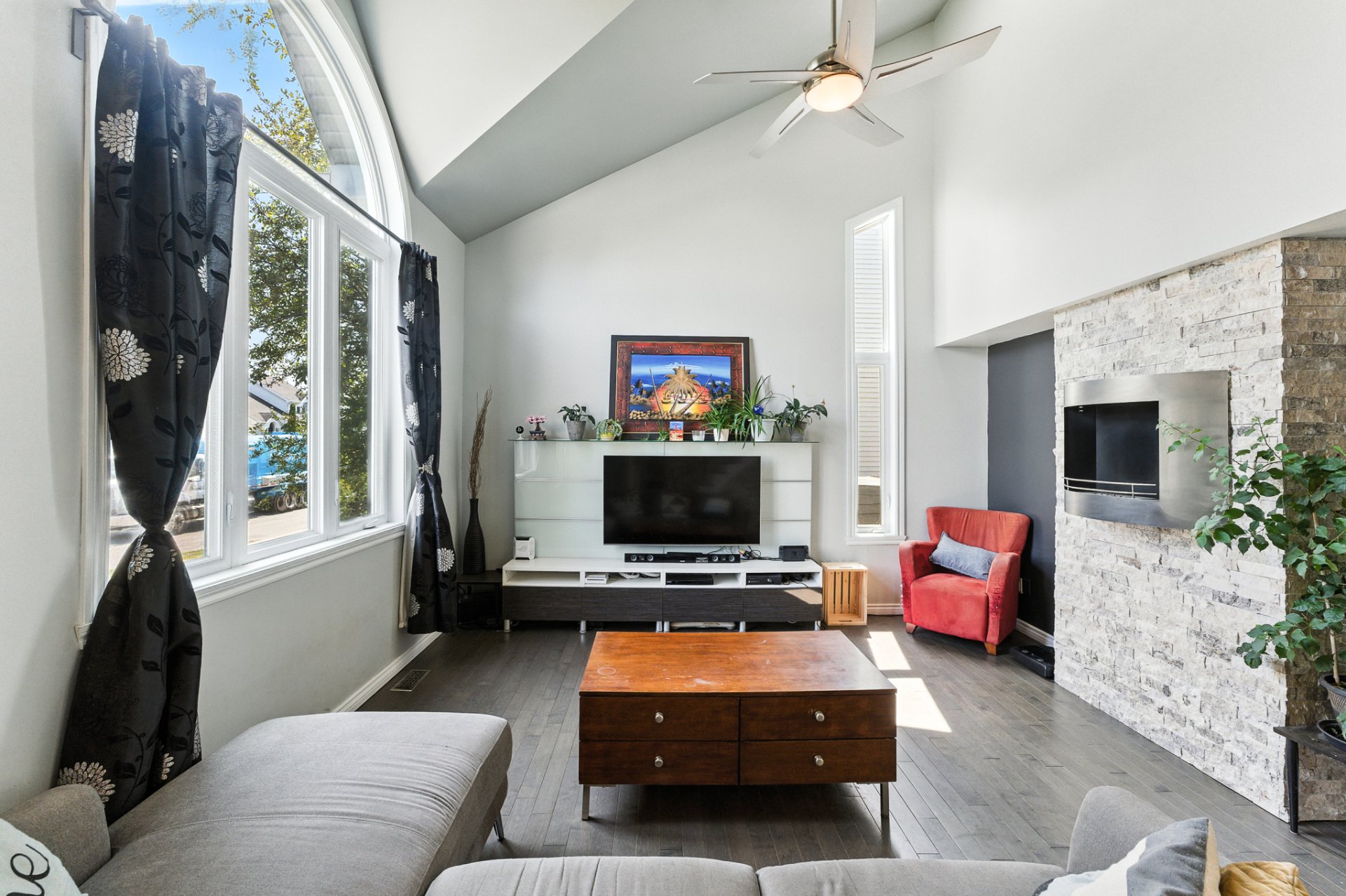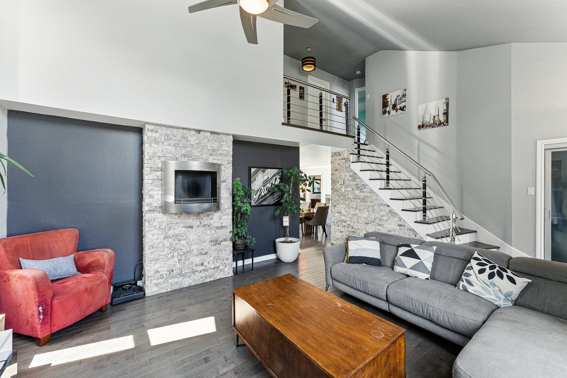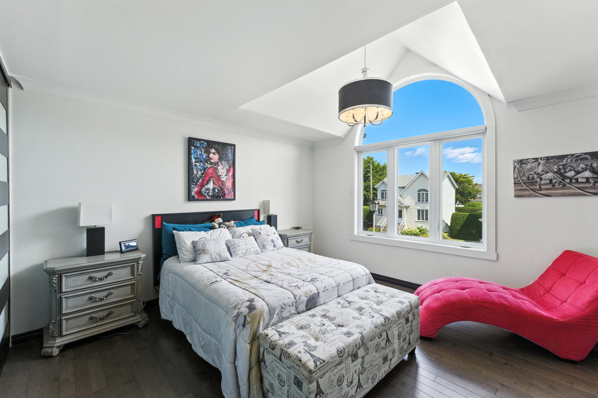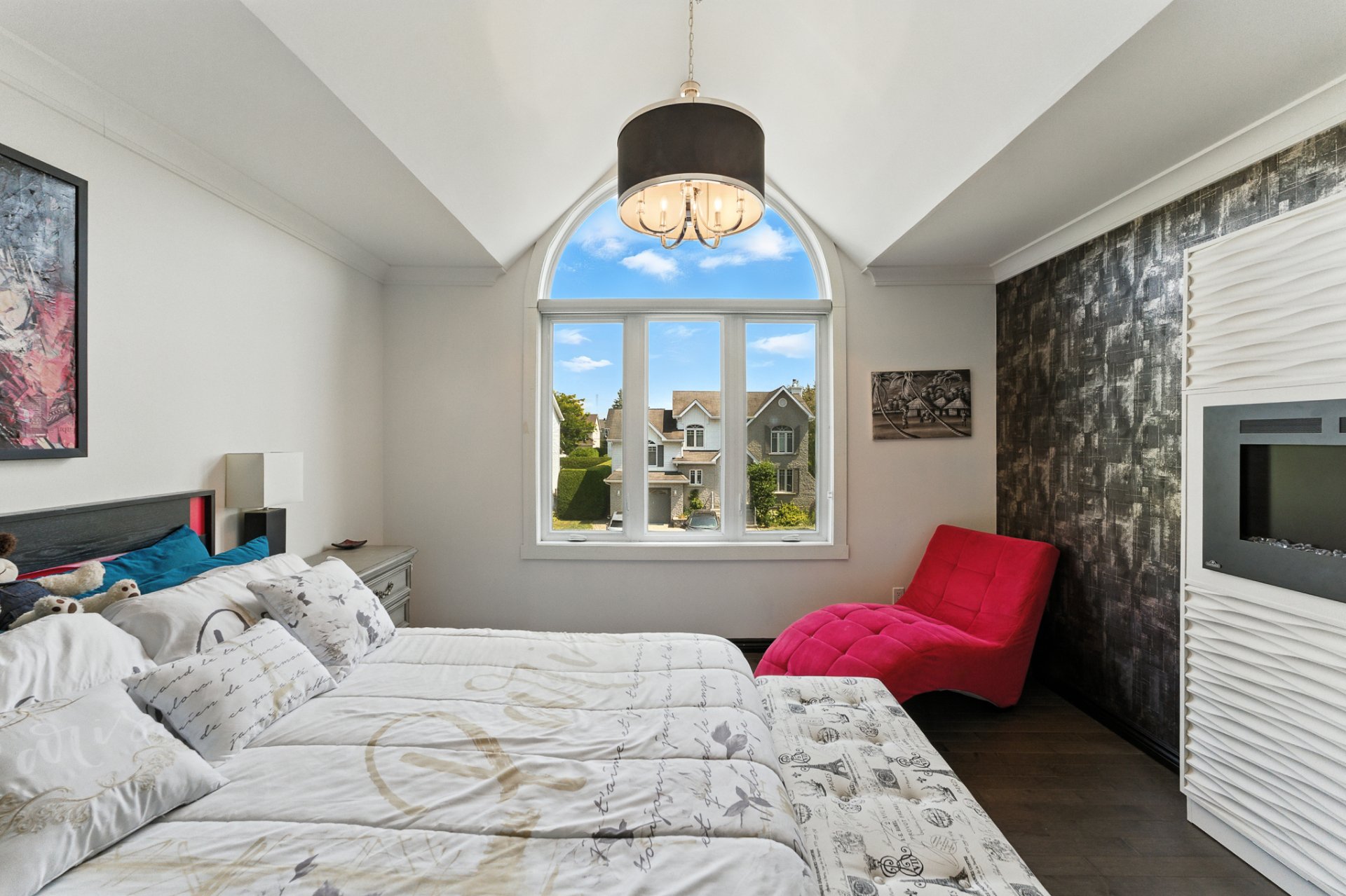 Dès l'entrée, l'atmosphère se veut chaleureuse et invitante, avec un salon baigné de lumière naturelle grâce à ses hauts plafonds cathédrale, créant un volume et une luminosité remarquables. La suite des maîtres bénéficie elle aussi de cette élégance architecturale, offrant un espace de repos empreint de calme et de grandeur.