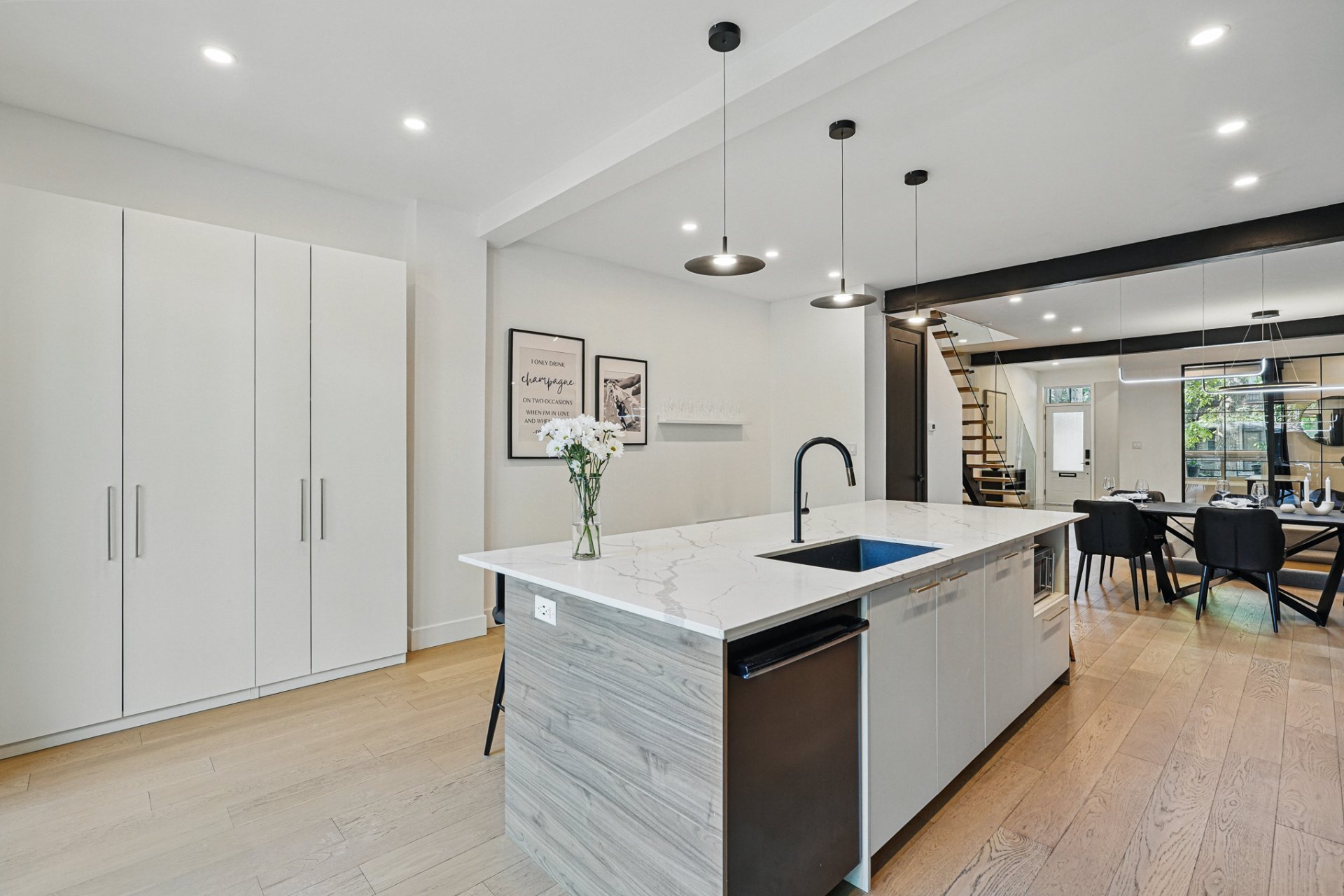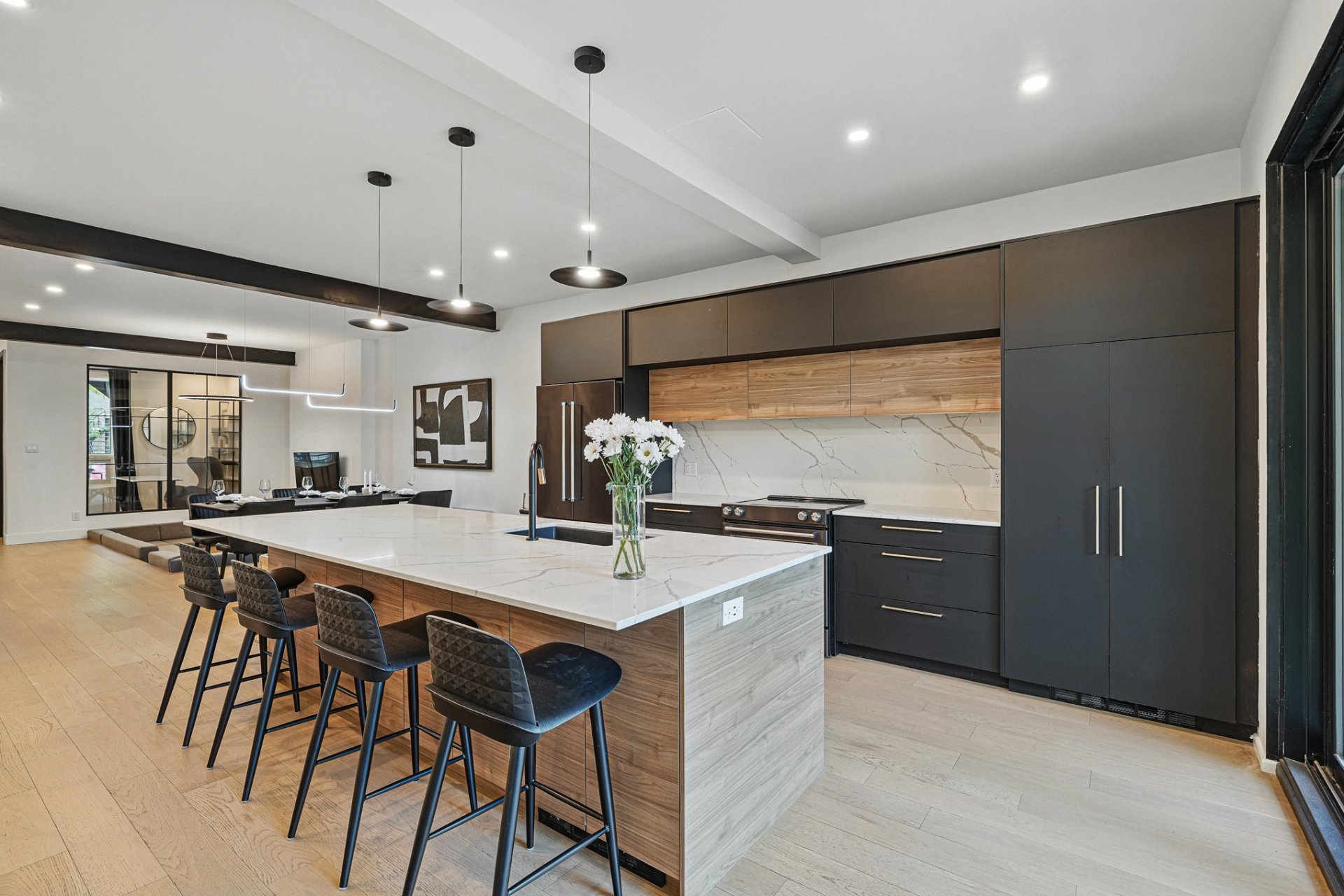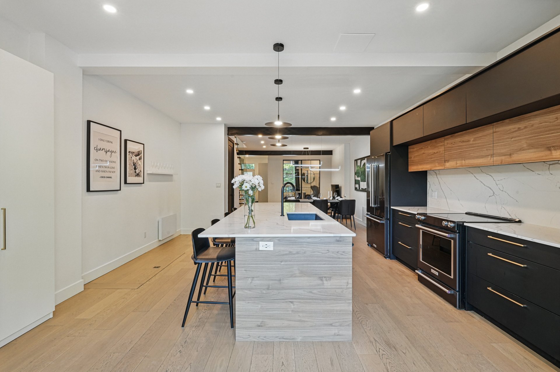 Pensé pour un quotidien moderne et ouvert, le rez-de-chaussée séduit par son imposant salon aux plafonds de 11 pieds, sa vaste aire de vie baignée de lumière, et son bureau central, subtilement intégré pour préserver fluidité et intimité. La cuisine conviviale et la salle à manger accueillante invitent aux réceptions. De grandes portes vitrées s'ouvrent sur la cour arrière, prolongeant naturellement l'espace vers l'extérieur.