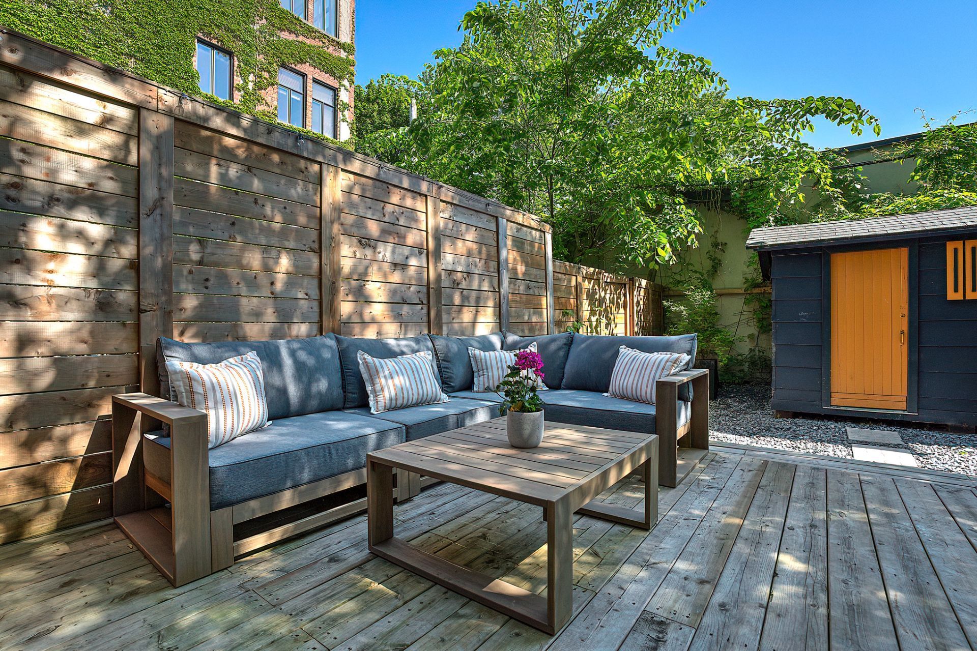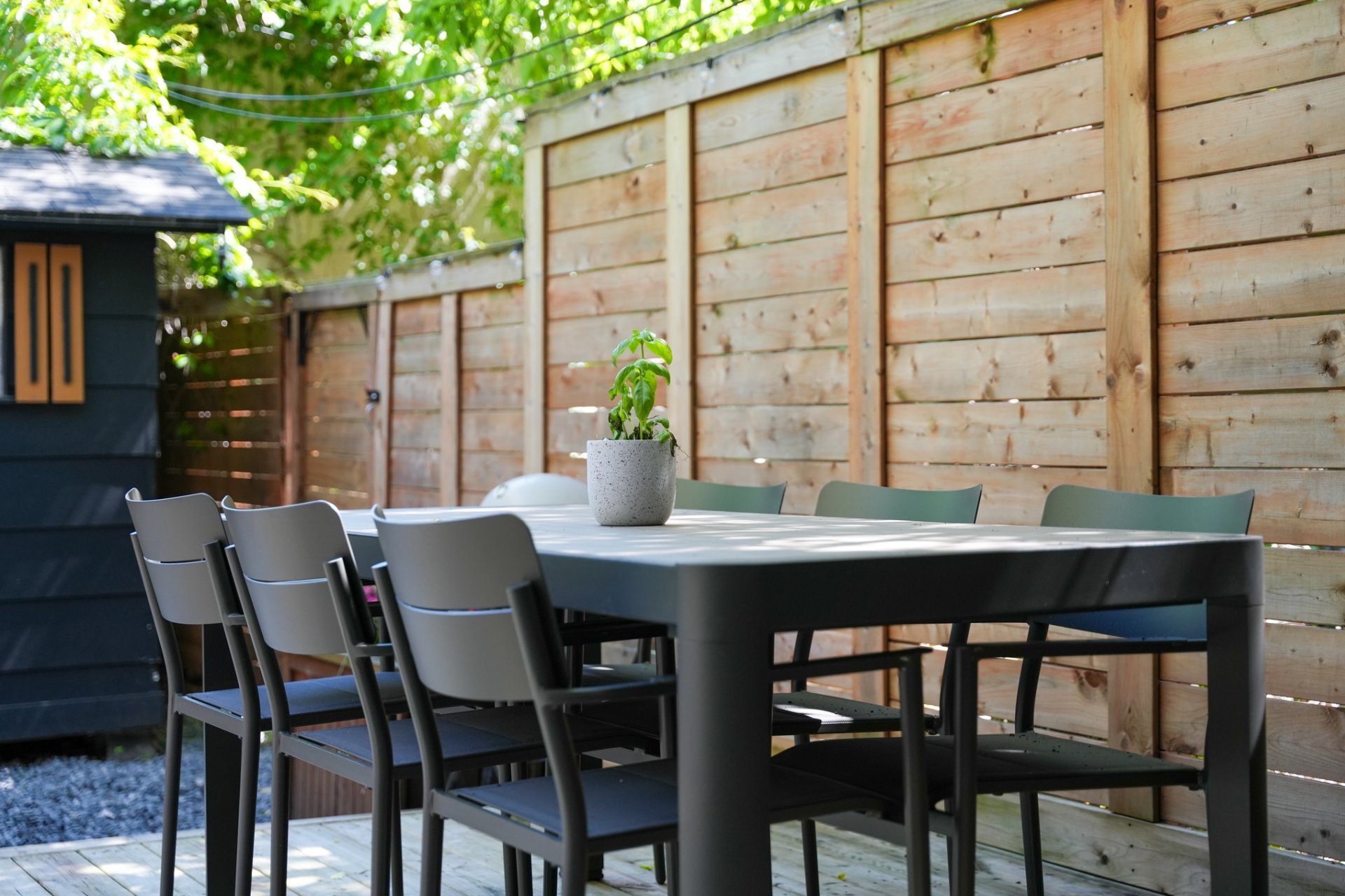 Totalement aménagée et clôturée, la cour devient une véritable extension de la maison. On y retrouve une terrasse élégante attenante à la cuisine, un coin lounge, un espace repas avec BBQ, ainsi qu'une remise parfaitement intégrée. Un lieu idéal pour profiter pleinement de la belle saison, en toute intimité.