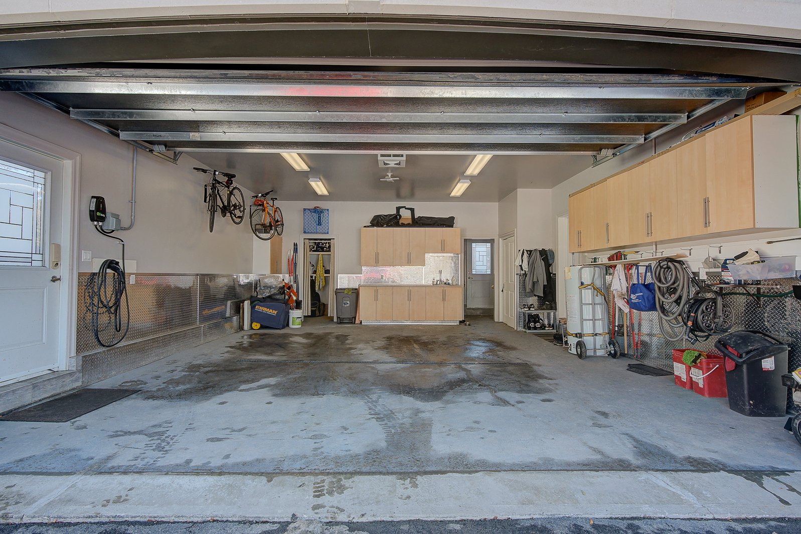 Le garage double, exceptionnellement vaste, offre deux zones de rangement distinctes, un espace idéal pour un atelier ou l'entreposage, ainsi qu'un accès direct à la cour arrière.