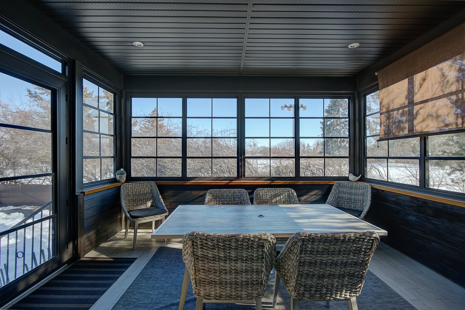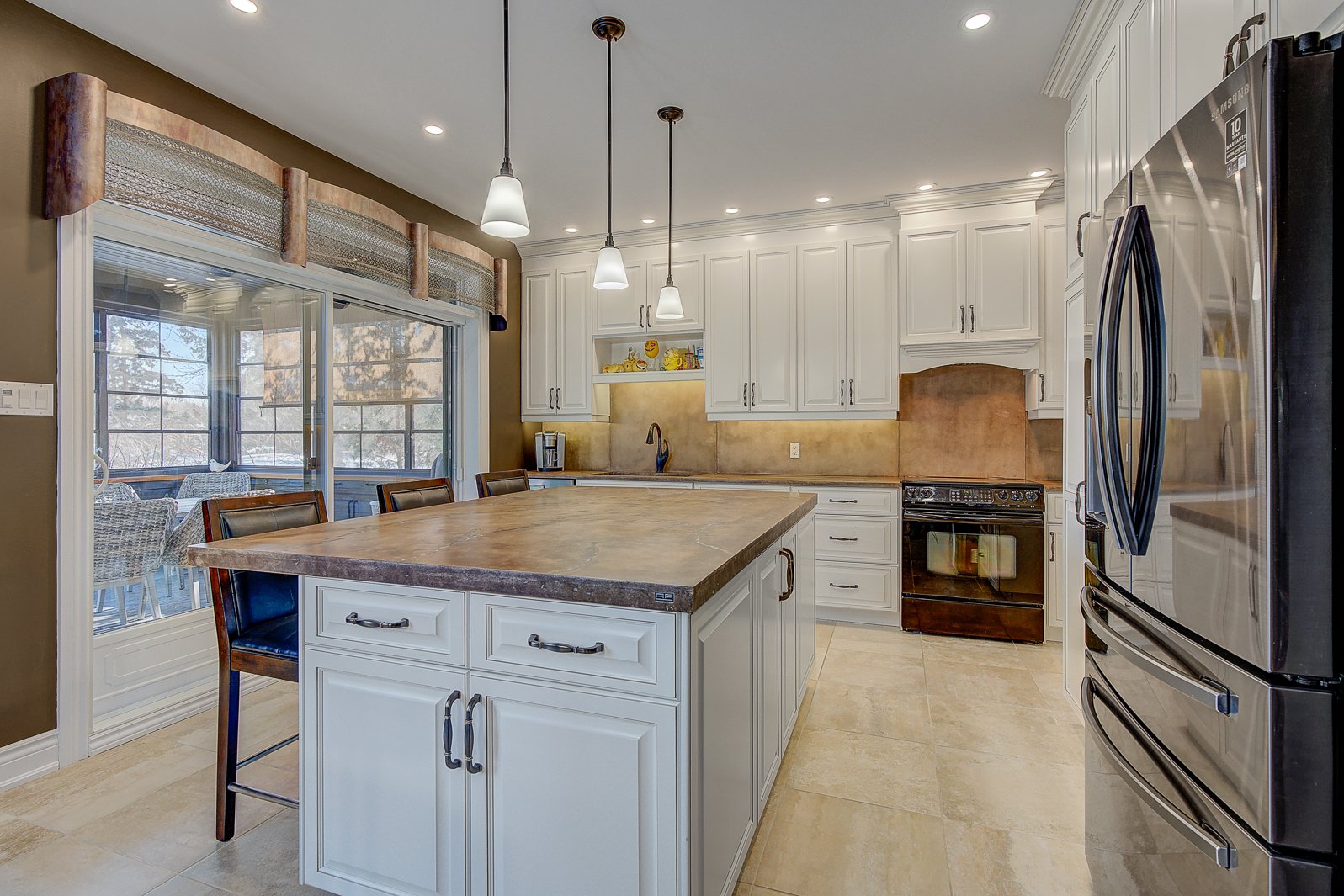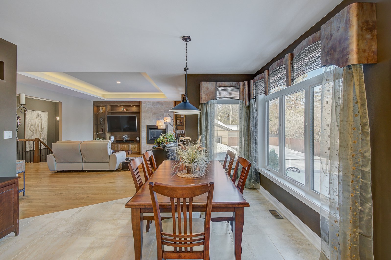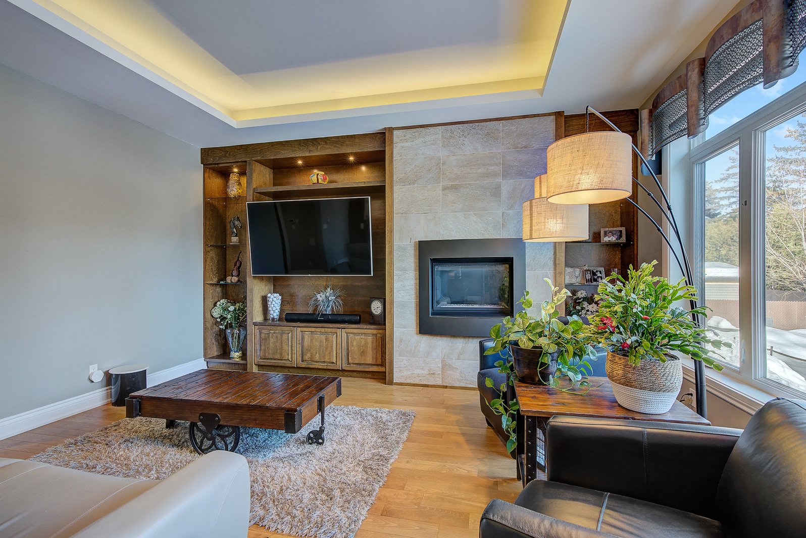 Le salon, véritable pièce phare de la maison, présente un foyer au gaz intégré dans un mur de pierre, entouré d'un mobilier sur mesure de grande qualité. Sa fenestration généreuse assure une luminosité exceptionnelle et permet d'admirer la cour arrière et la piscine.