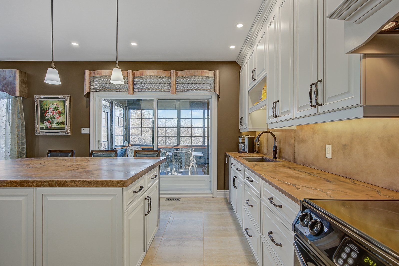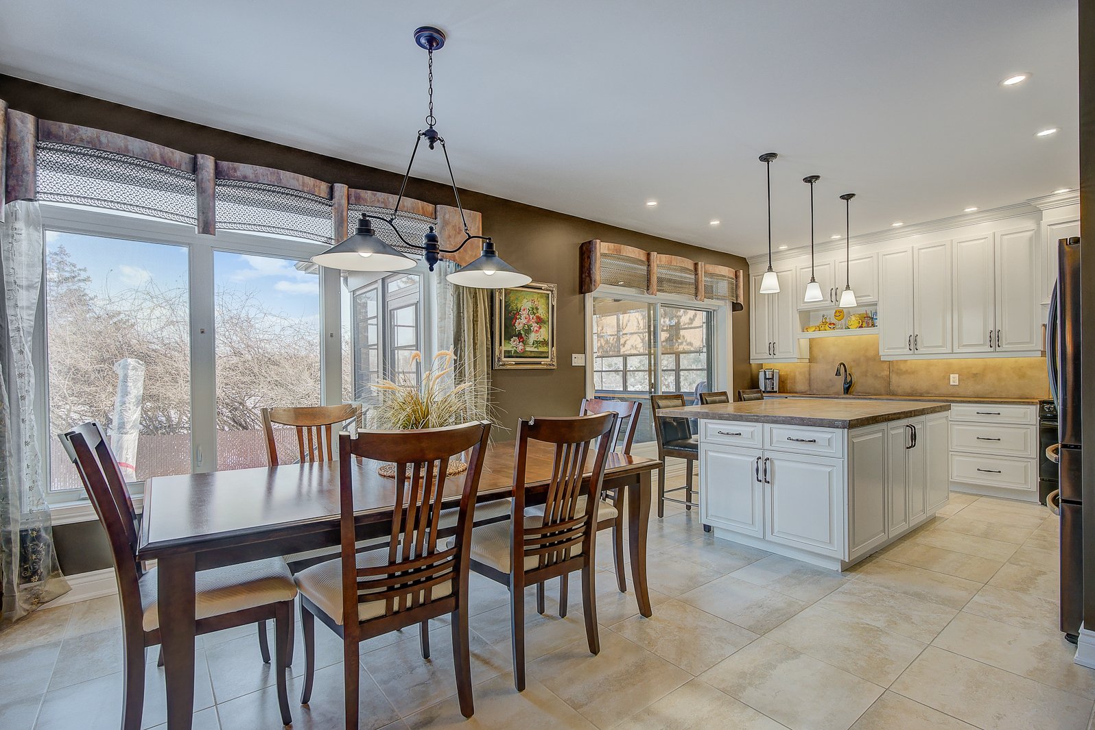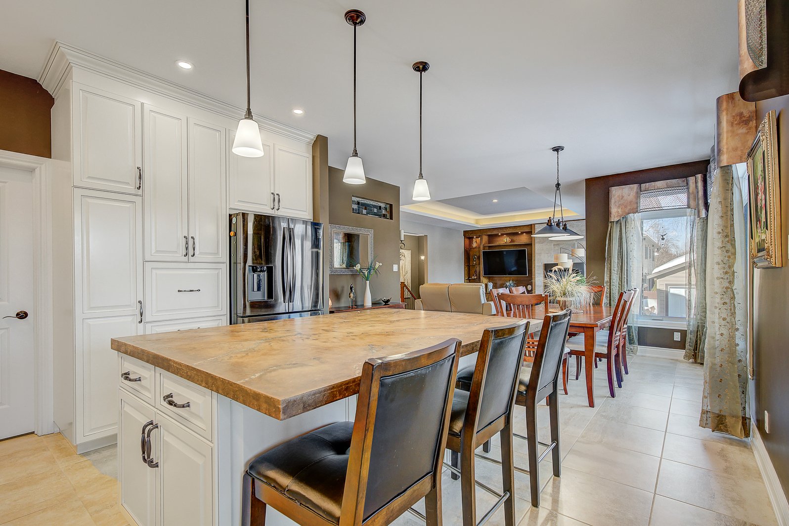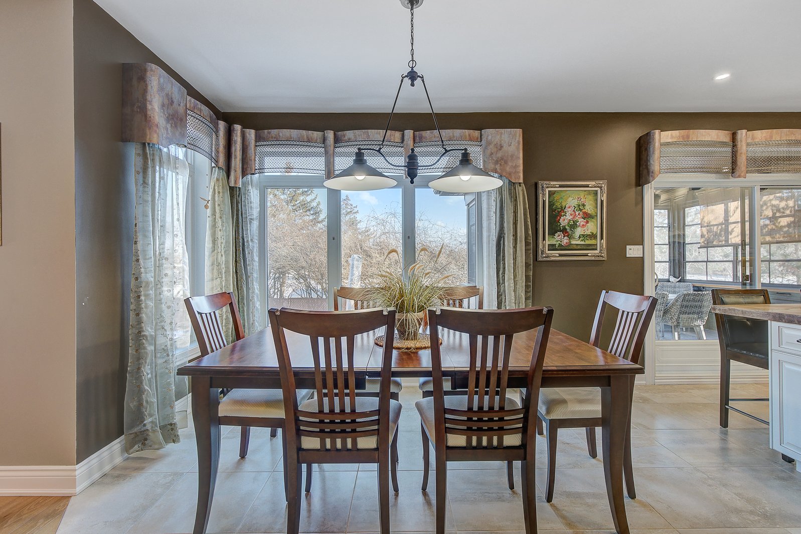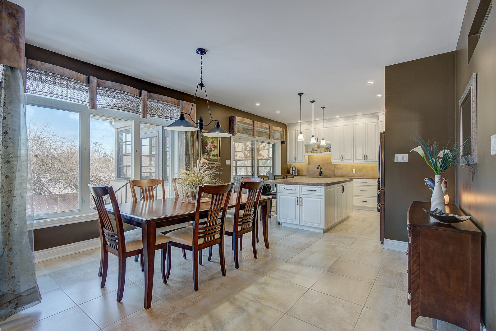 La salle à manger, spacieuse, s'harmonise naturellement avec la cuisine. Cette dernière impressionne par son grand îlot central, ses armoires pleine hauteur, son abondance de rangement, son garde-manger (pantry) pratique, ainsi que son accès direct au solarium 3 saisons, un espace unique permettant de profiter des repas ou des moments de détente.