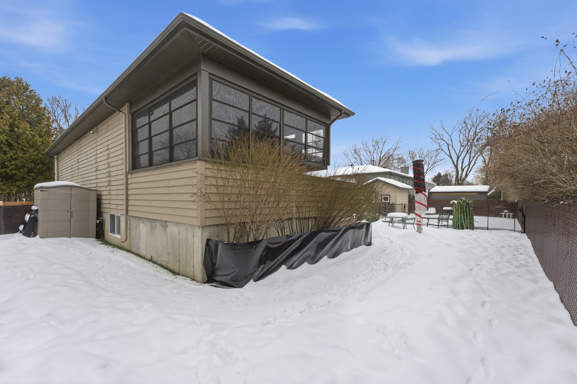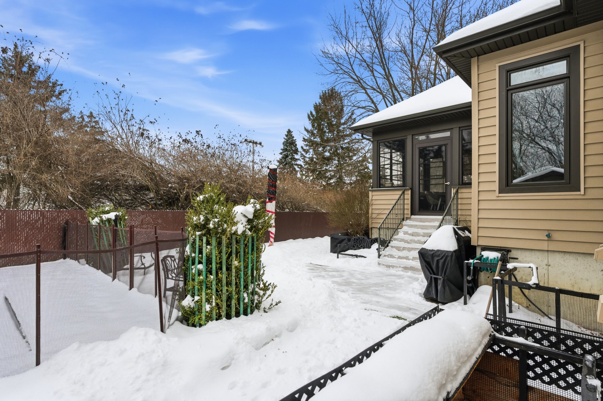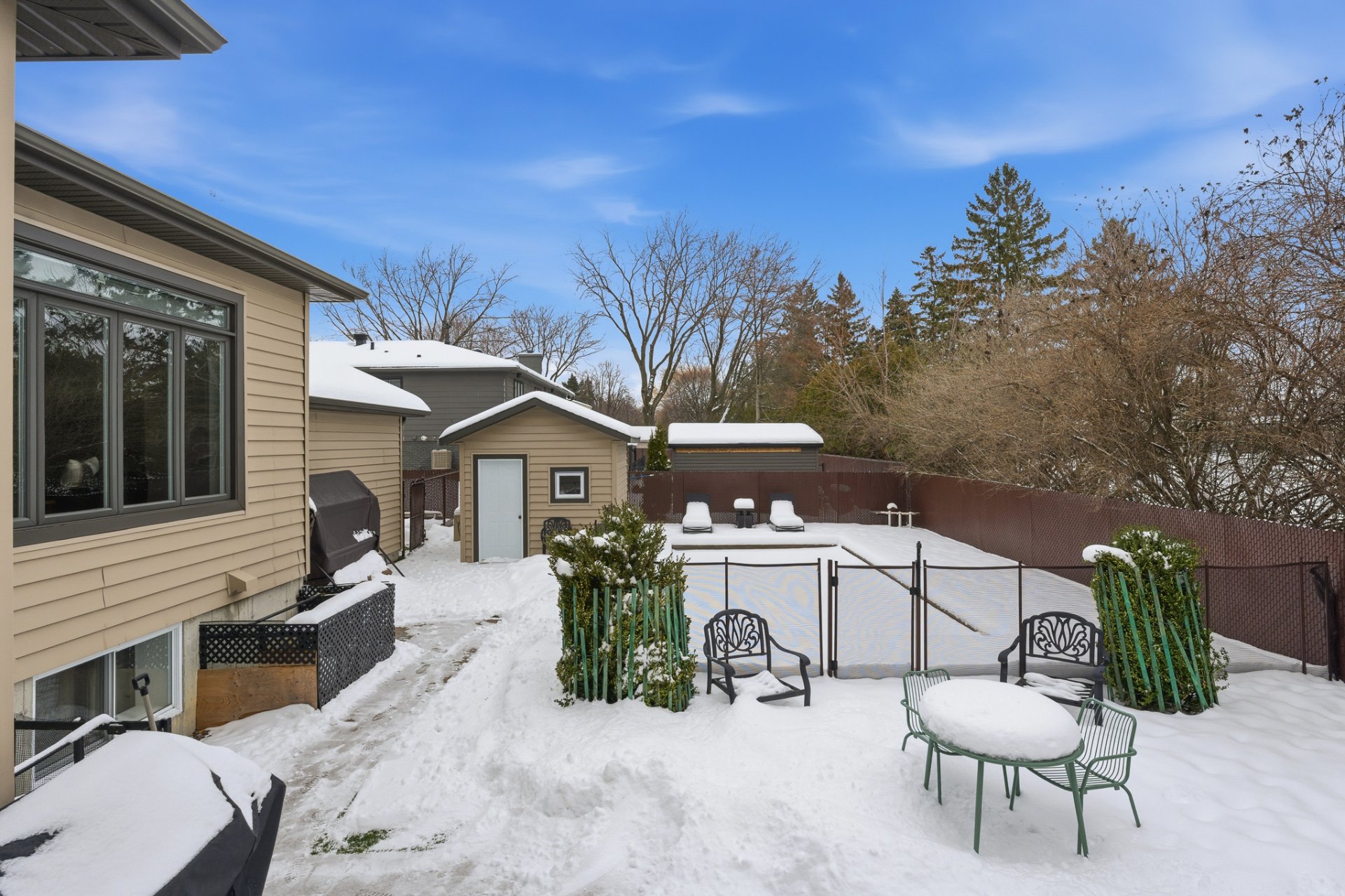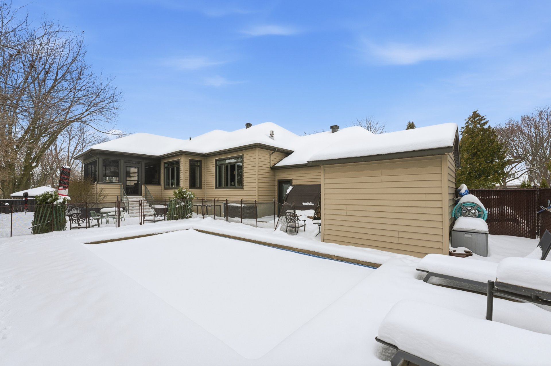 À l'extérieur, la cour arrière est un véritable havre privé. La piscine creusée constitue le centre de l'espace extérieur, entourée de zones détente idéales pour recevoir famille et amis. L'absence totale de voisin arrière accentue la tranquillité et le caractère exclusif de la propriété.