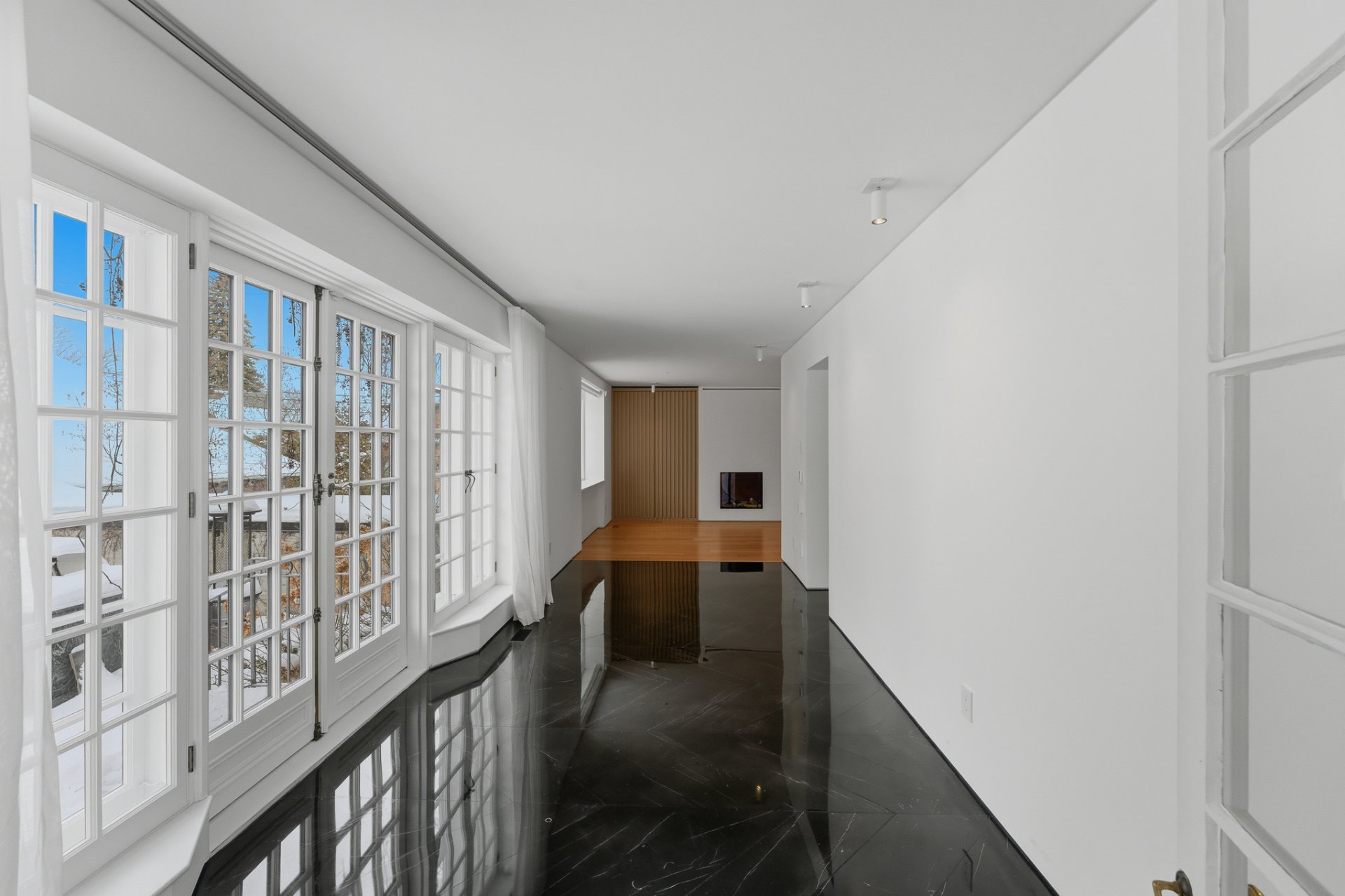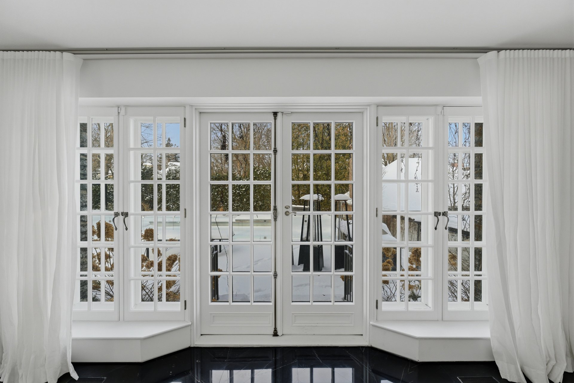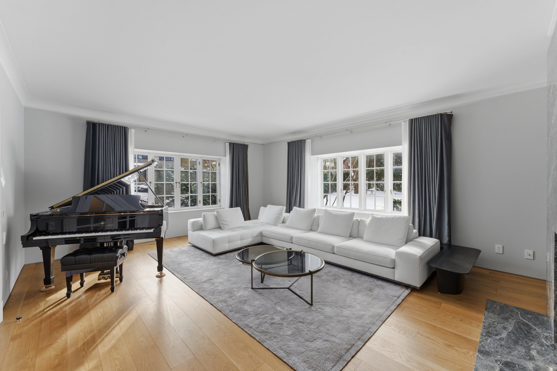 + Élégant salon avec fenêtres sur deux façades et foyer au bois avec grand manteau de marbre