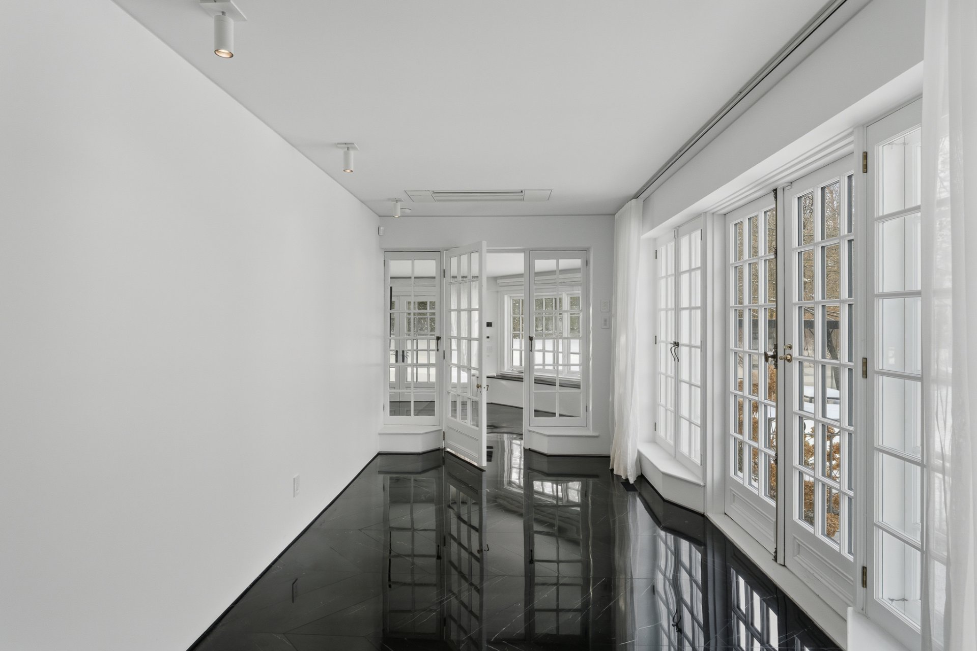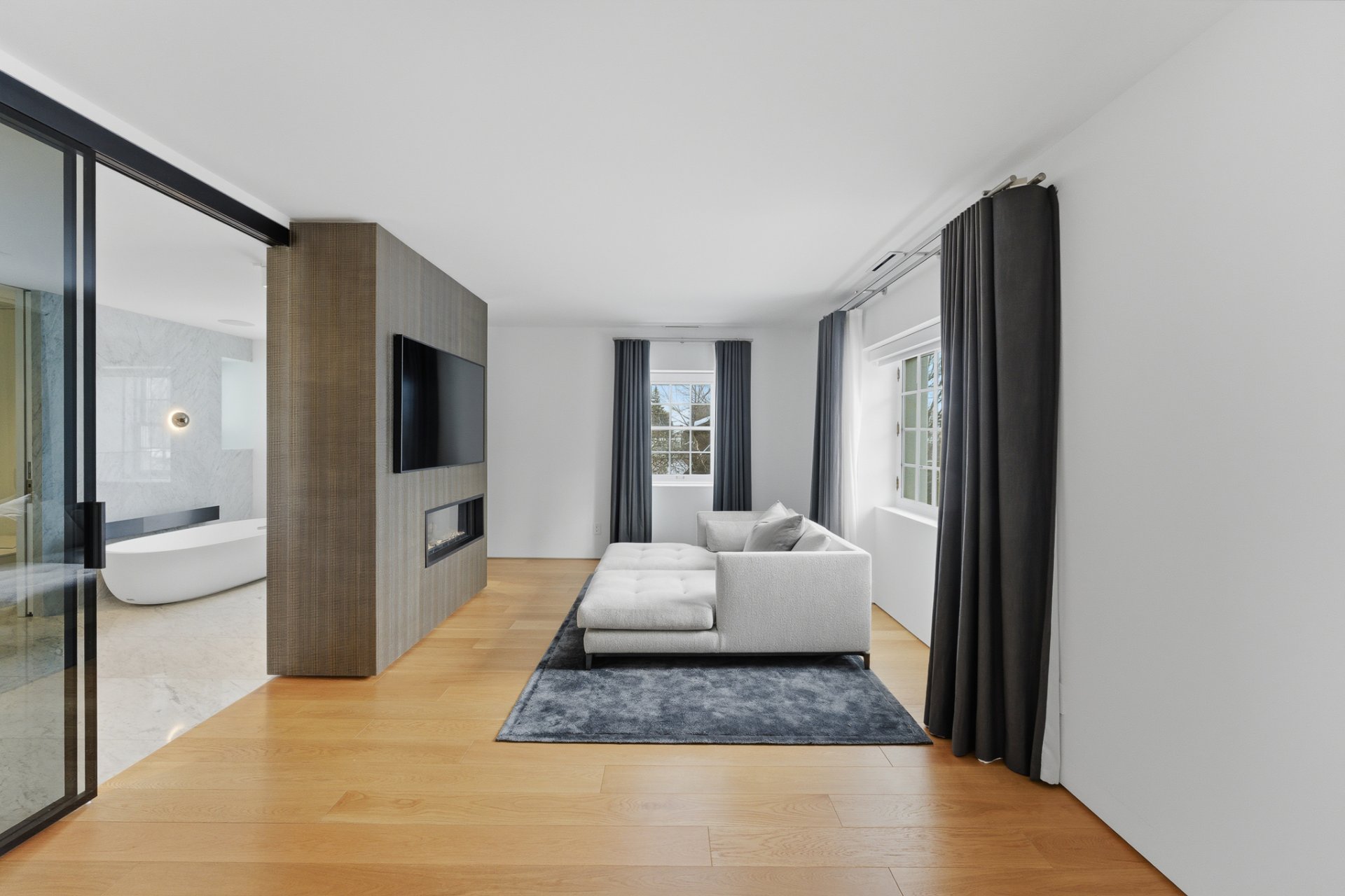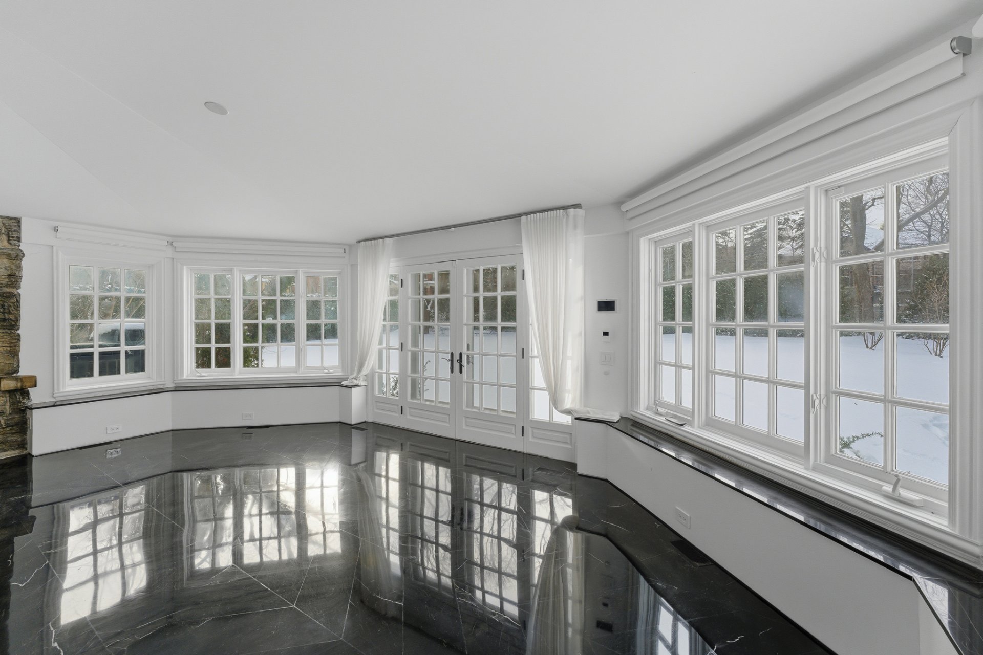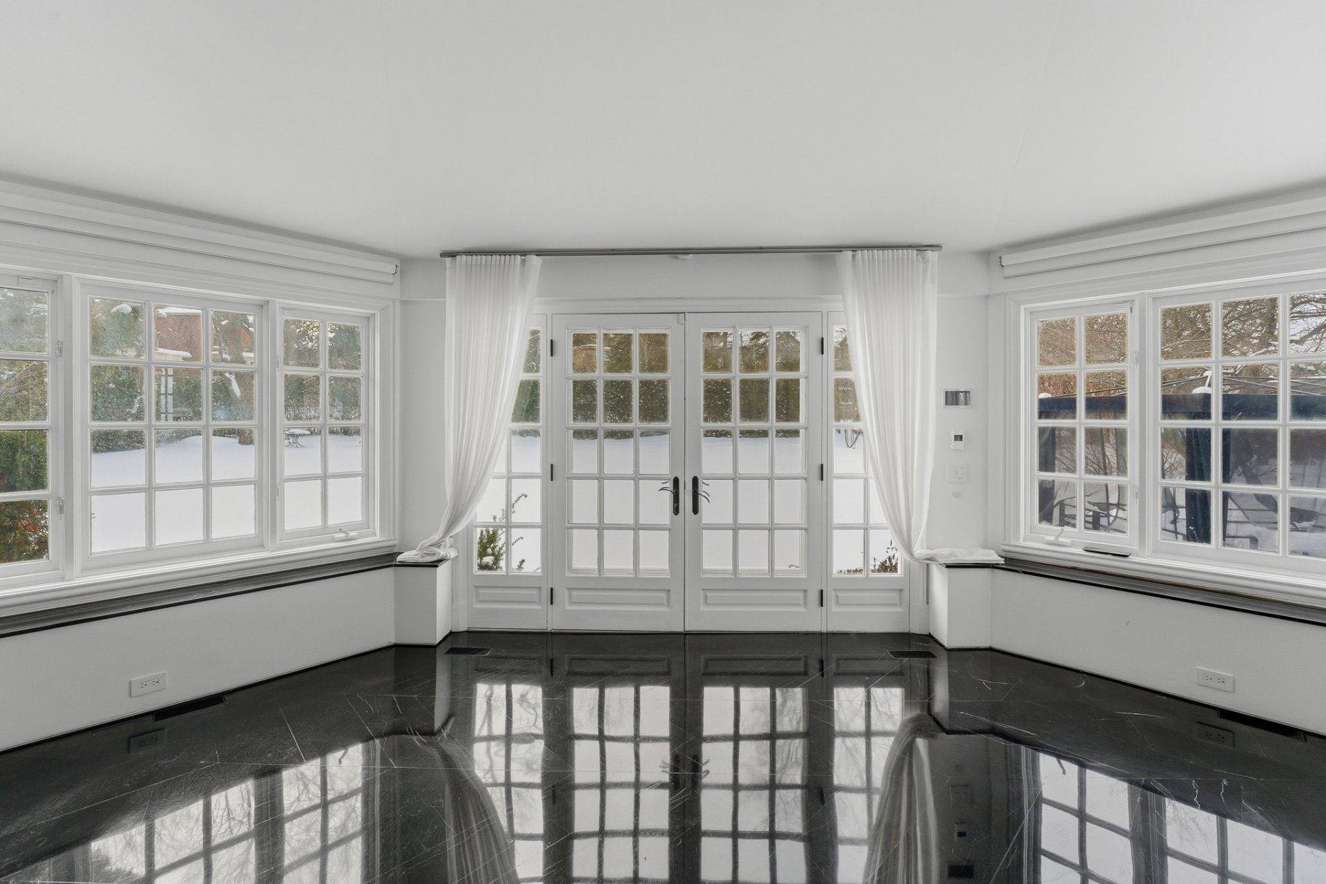 + Élégant salon avec fenêtres sur deux façades et foyer au bois avec grand manteau de marbre