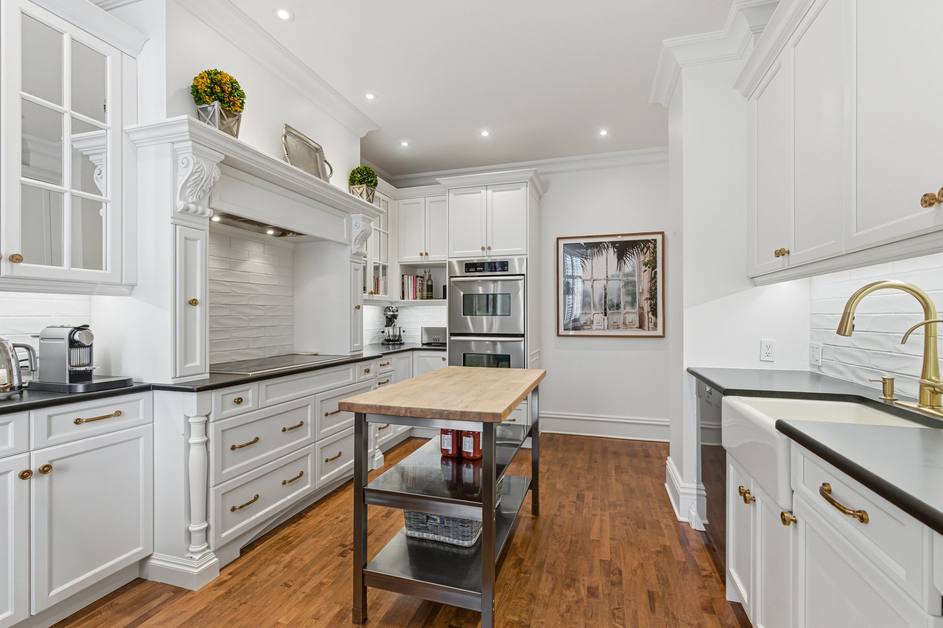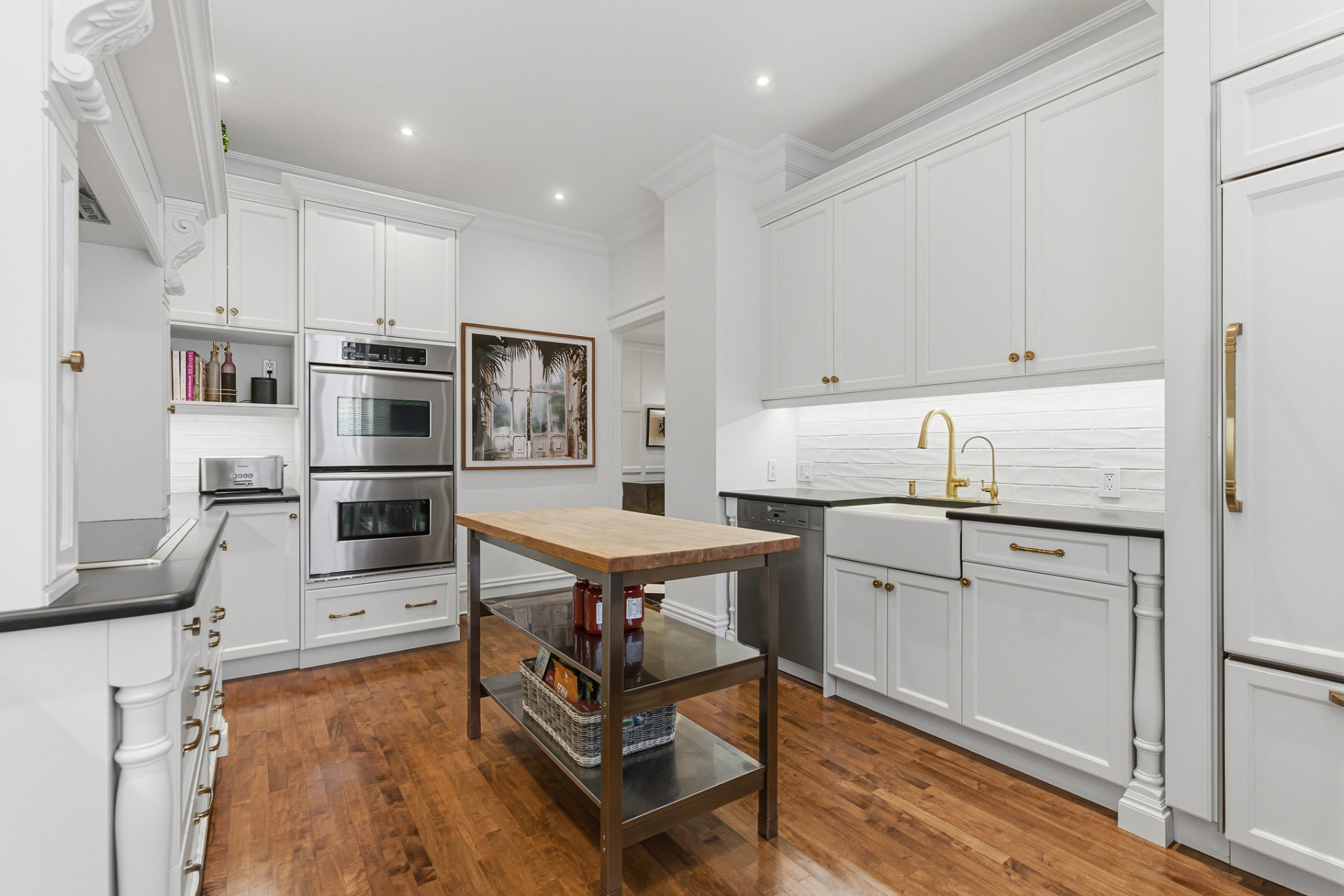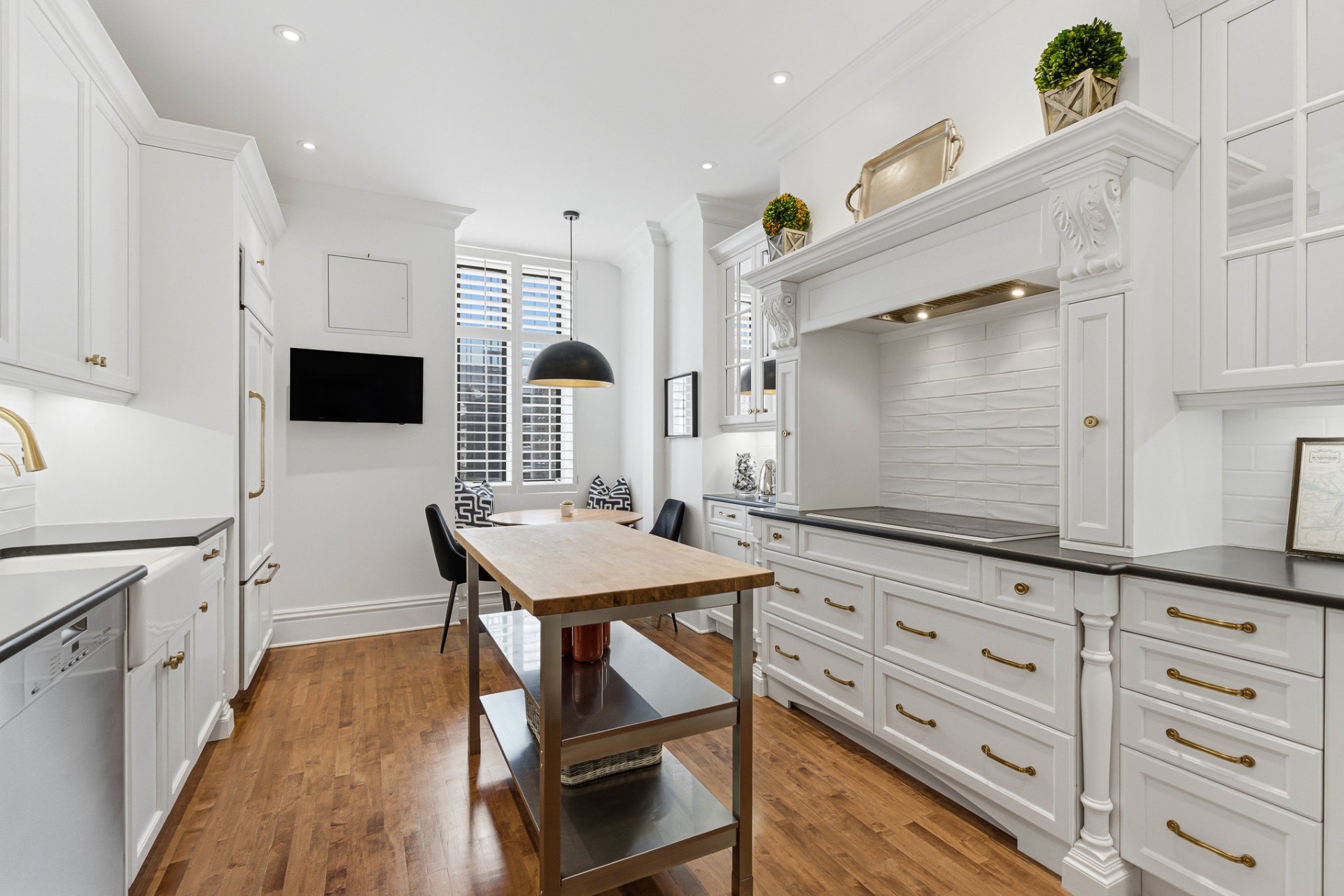 La cuisine offre un équilibre subtil entre le charme patrimonial et la fonctionnalité contemporaine. Armoires sur mesure, comptoirs de pierre et électroménagers haut de gamme sont complétés par un billot de boucher mobile. Un espace dinette raffiné avec banquette intégrée et chaises, aménagé le long d'une fenêtre orientée plein sud, bénéficie d'une abondante lumière naturelle.