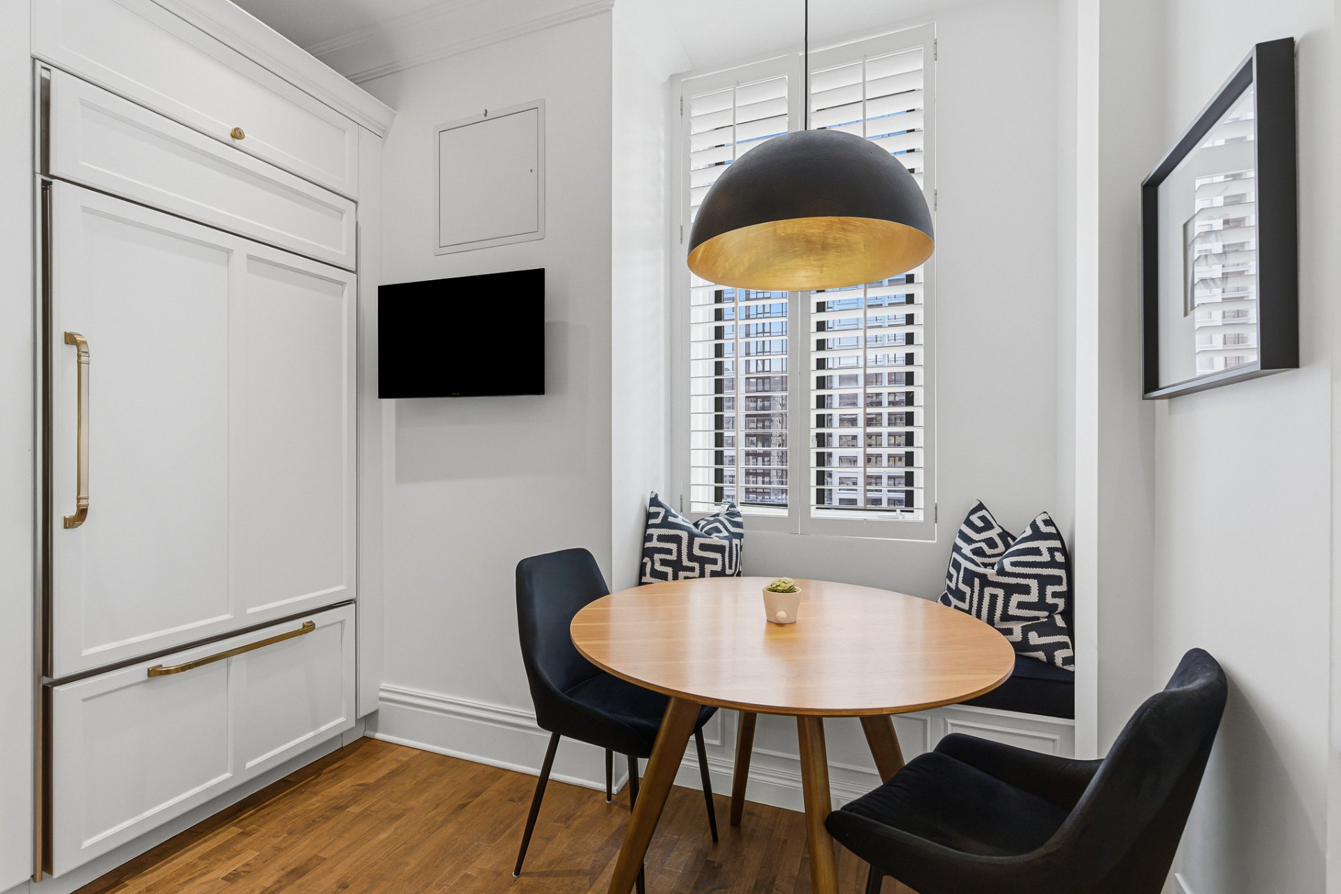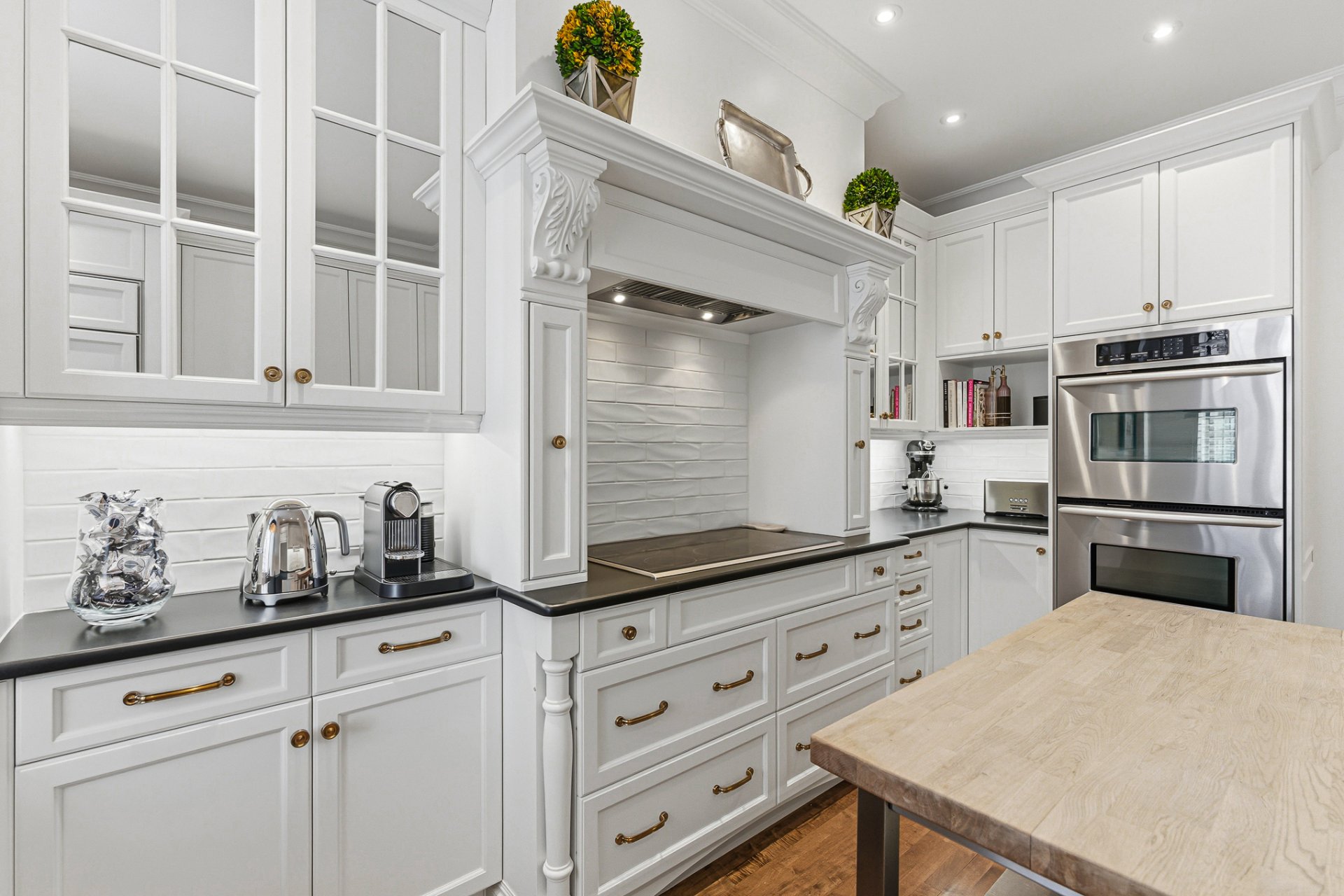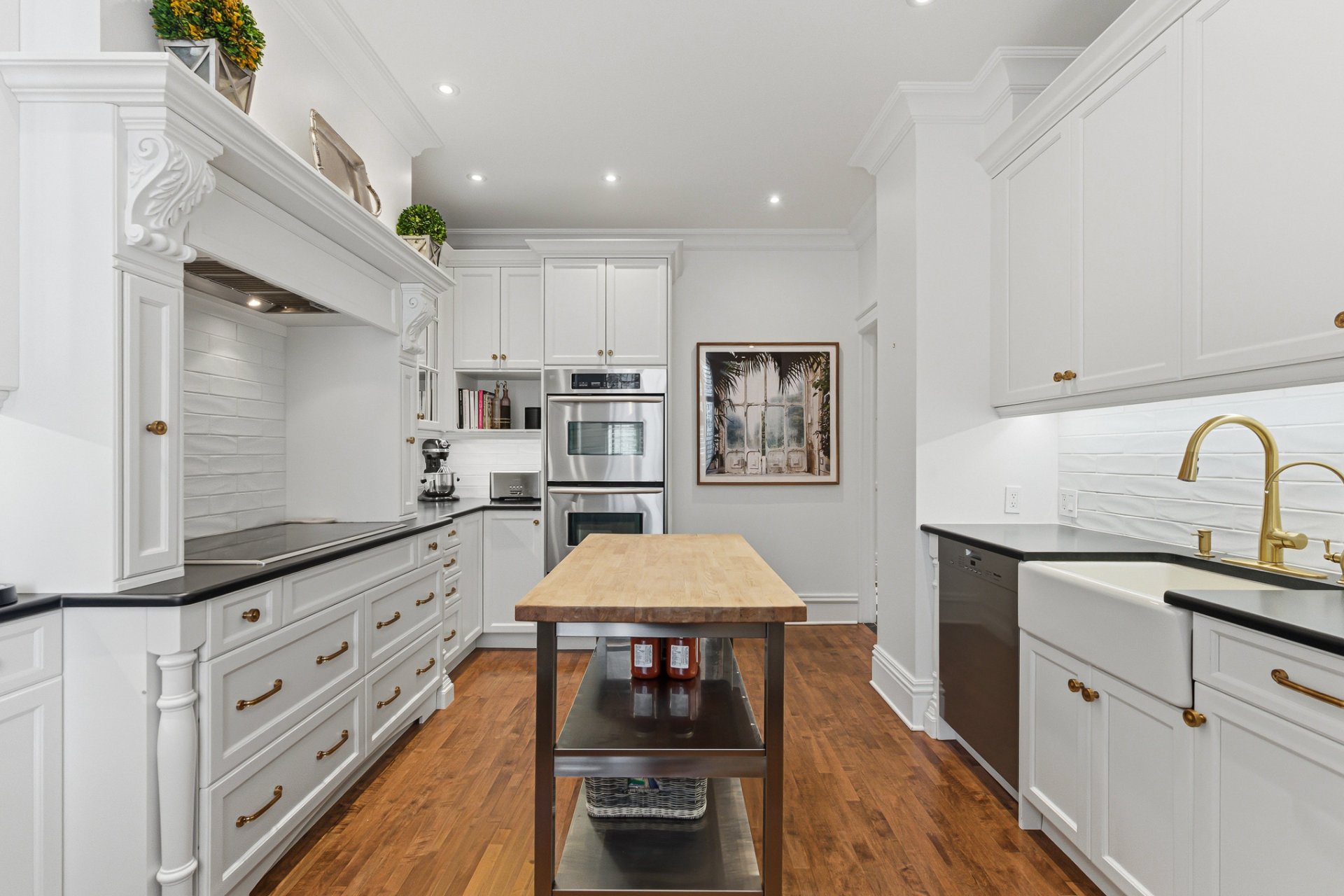 La cuisine offre un équilibre subtil entre le charme patrimonial et la fonctionnalité contemporaine. Armoires sur mesure, comptoirs de pierre et électroménagers haut de gamme sont complétés par un billot de boucher mobile. Un espace dinette raffiné avec banquette intégrée et chaises, aménagé le long d'une fenêtre orientée plein sud, bénéficie d'une abondante lumière naturelle.