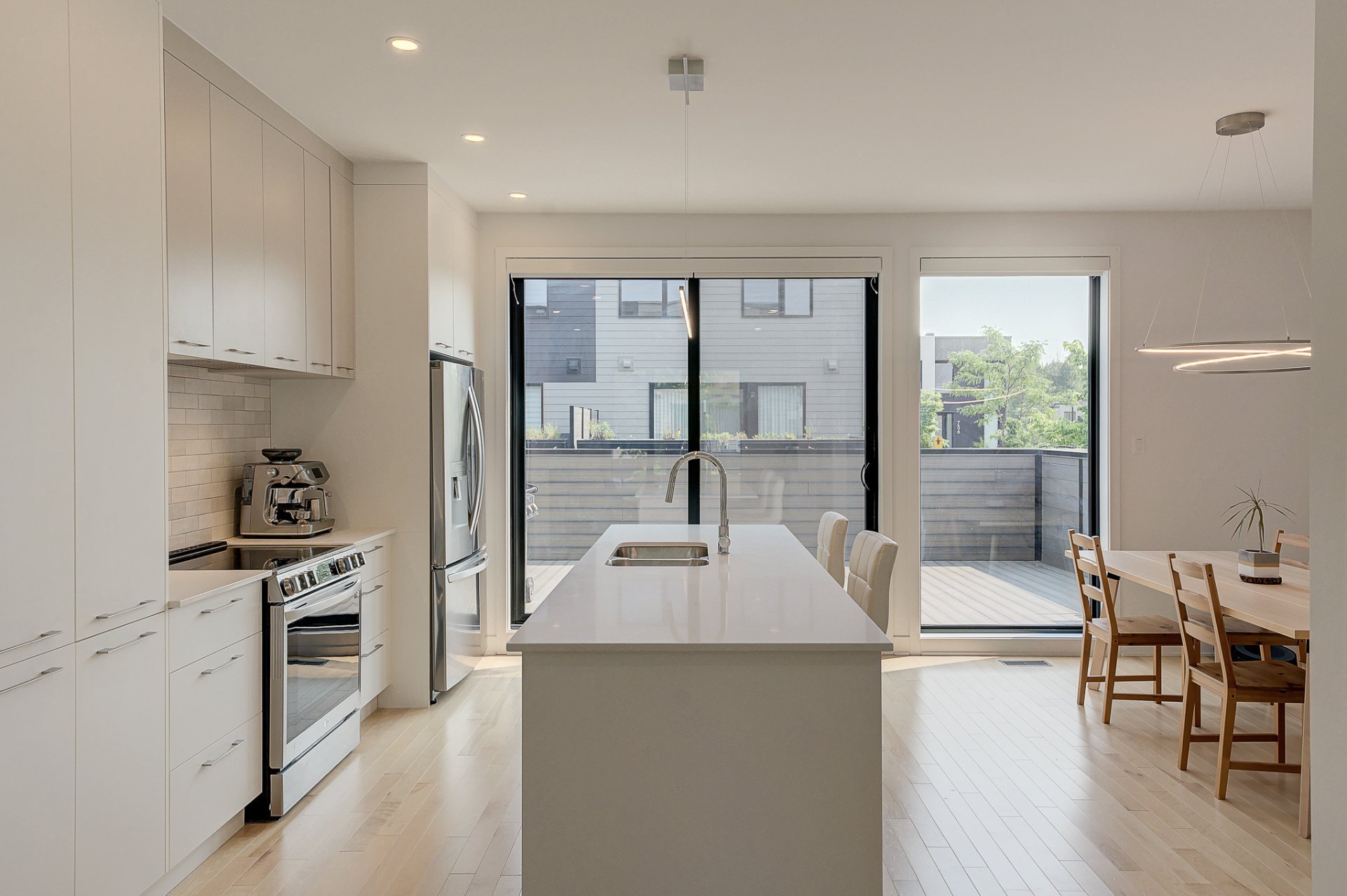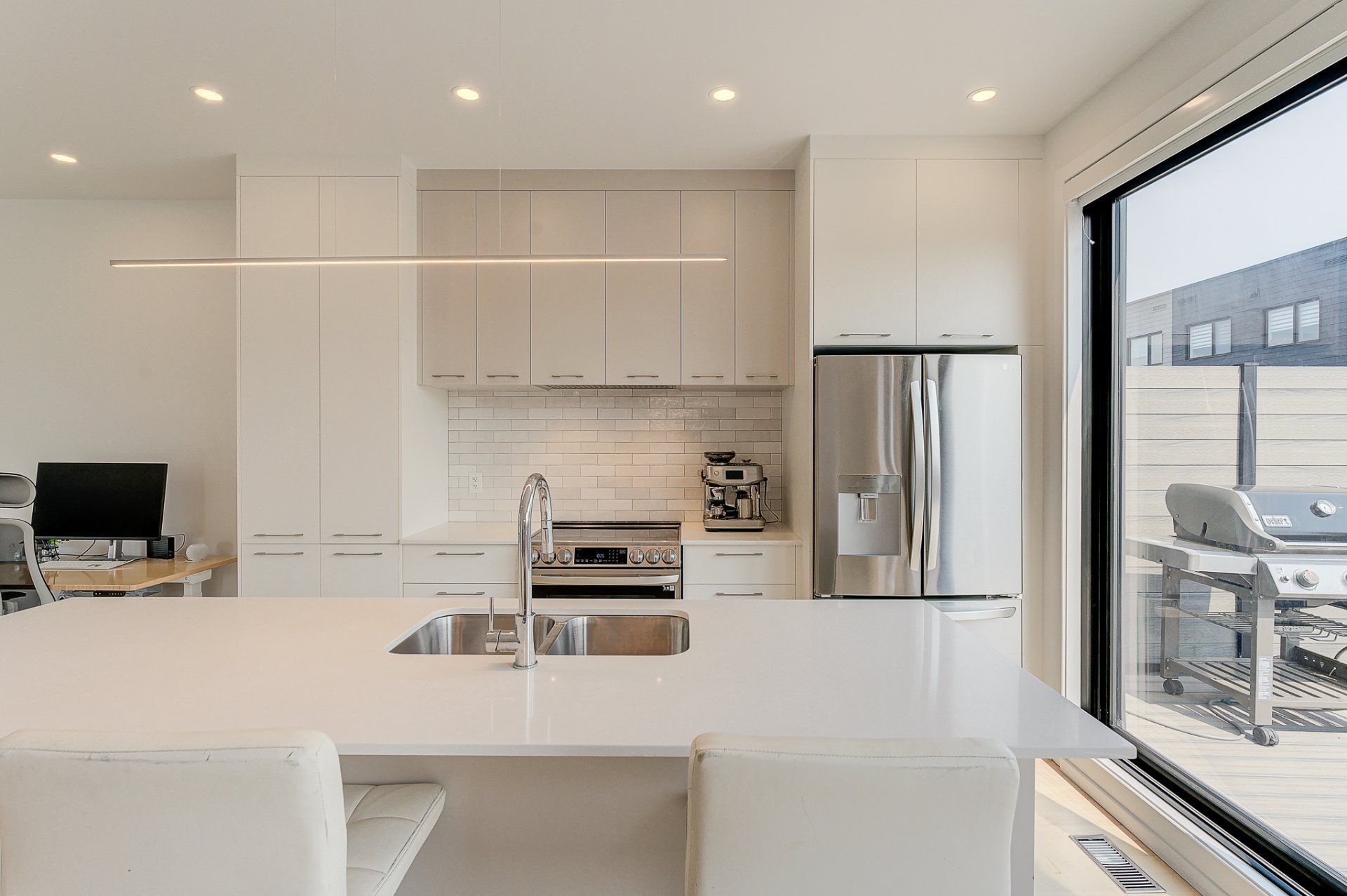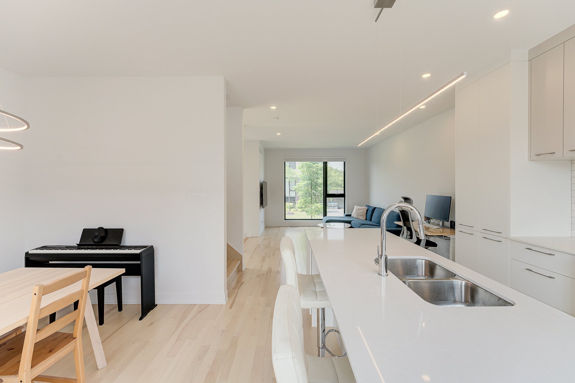 Répartie sur trois étages soigneusement aménagés, la propriété propose une superficie habitable généreuse et bien pensée. Le rez-de-chaussée à aire ouverte met en valeur un plafond de 9 pieds, un vaste salon, une salle à manger conviviale et une cuisine moderne avec îlot central, comptoirs en quartz et beaucoup de rangement. Une terrasse intime, accessible depuis l'espace repas, permet de profiter pleinement des belles journées d'été.