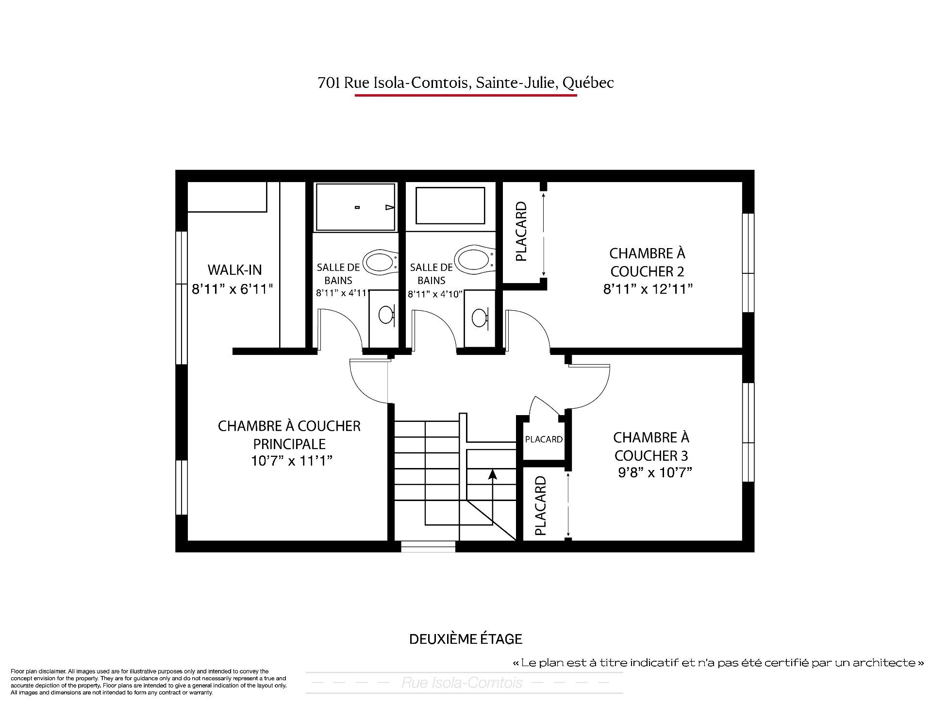 À l'étage, vous trouverez trois chambres à coucher spacieuses, dont la suite principale avec walk-in et salle de bain privée comprenant une douche vitrée et une grande vanité. Une deuxième salle de bain complète ainsi que deux autres chambres ajoutent au confort de l'étage.
