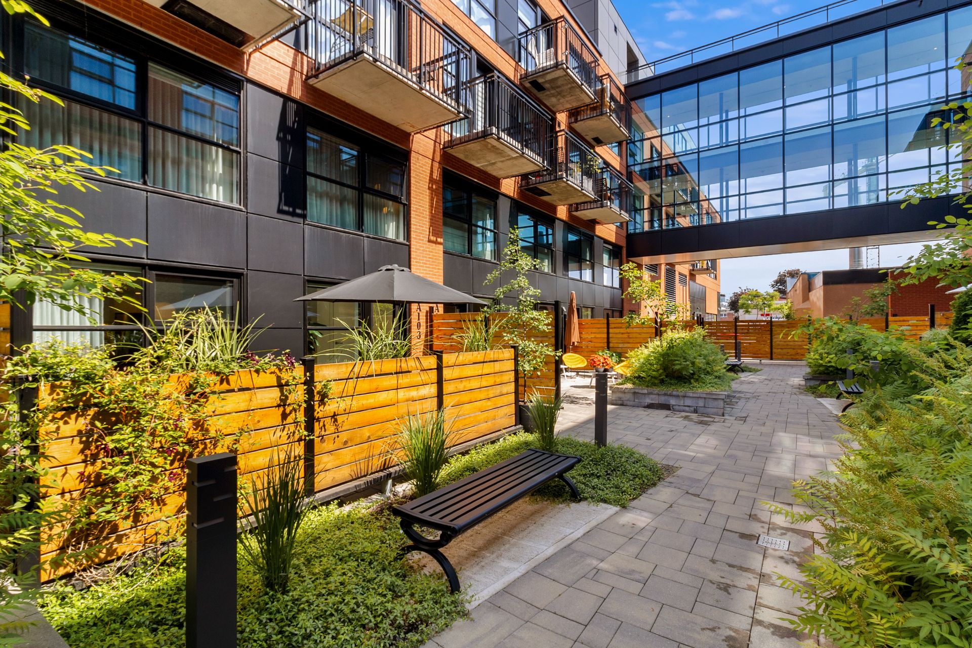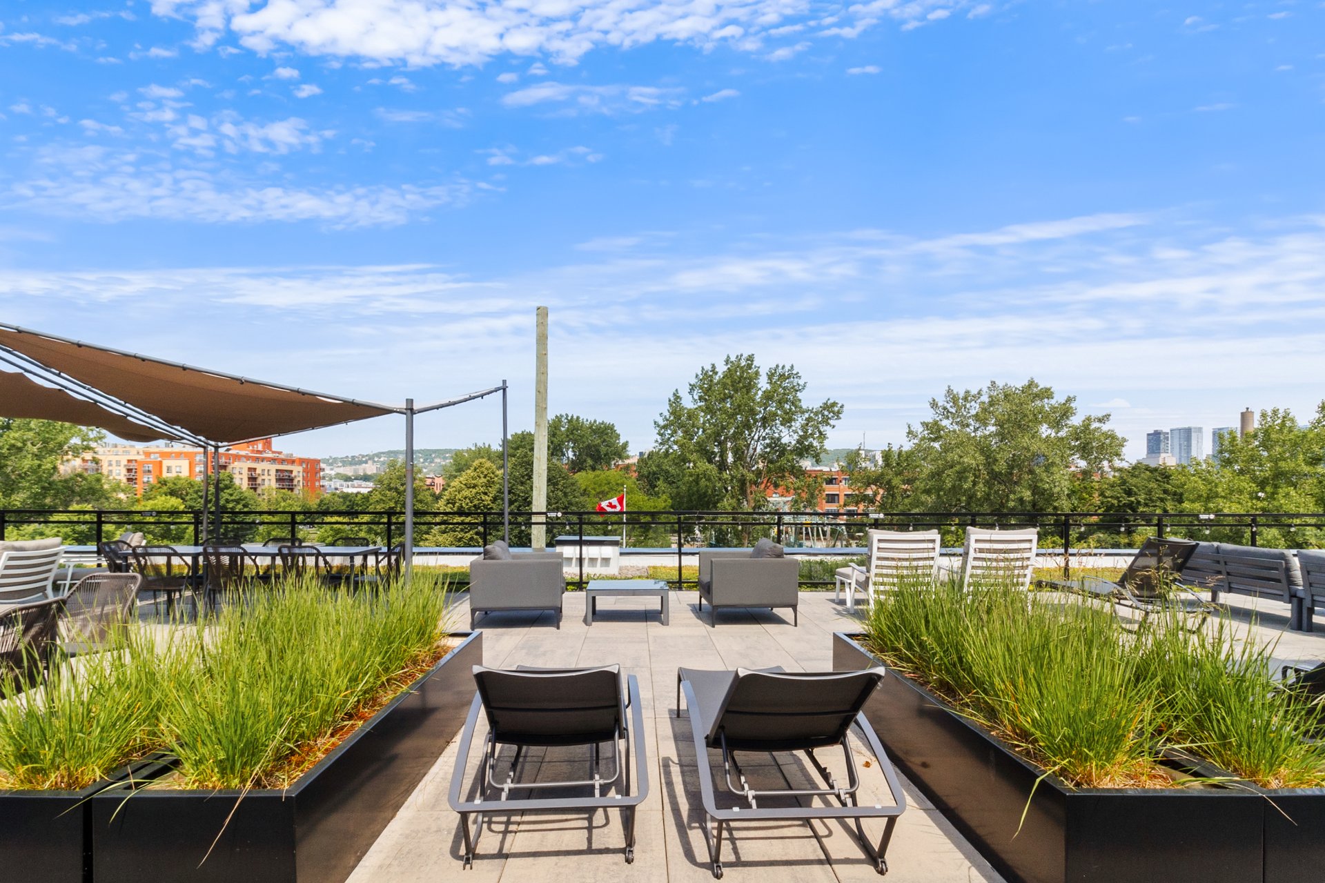 EDWIN | Immeuble construit en 2021 avec ascenseur et espaces communs : salon/lounge et salle d'exercice, terrasse sur le toit avec BBQ et vue panoramique sur le canal de Lachine, la montagne et le centre-ville.