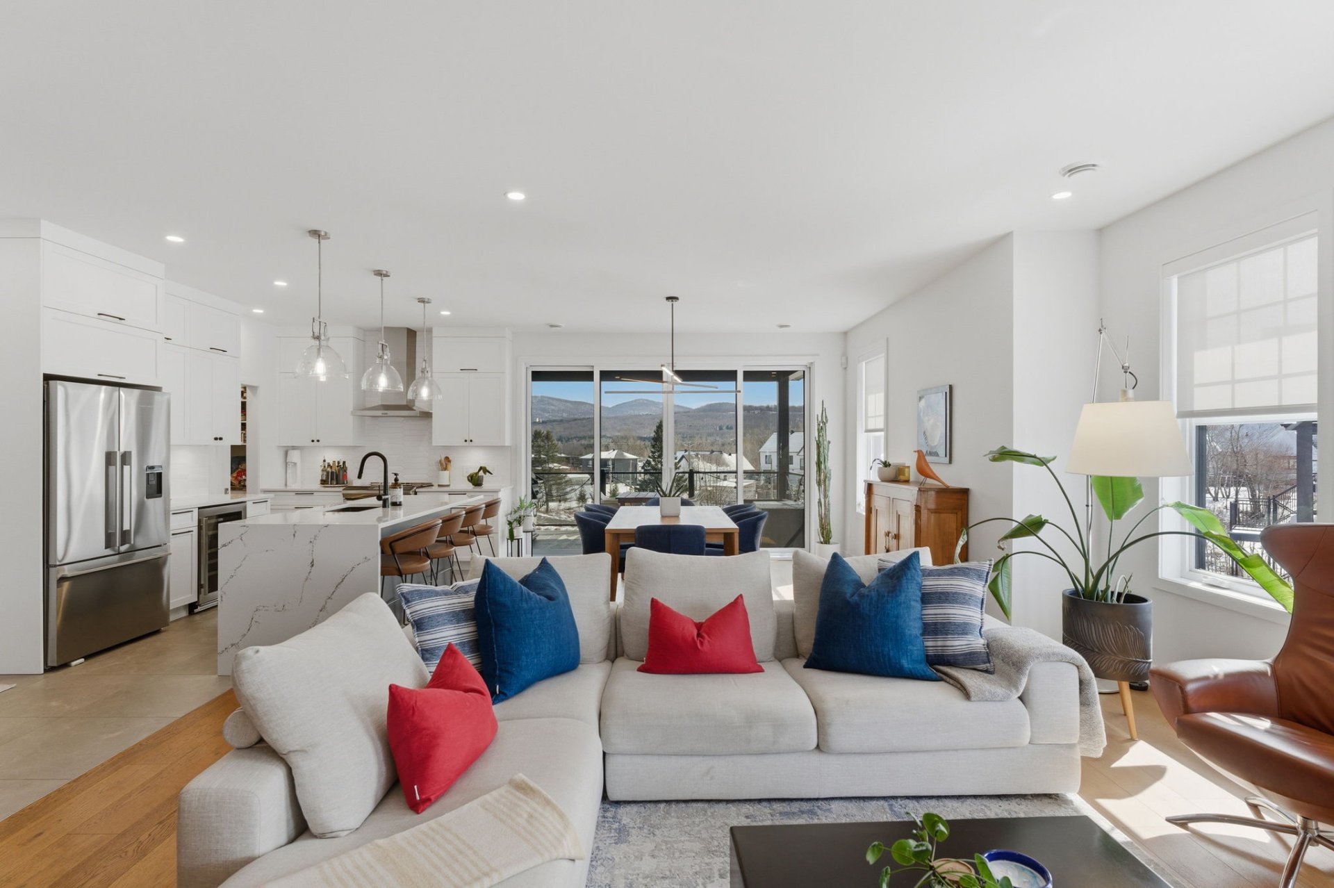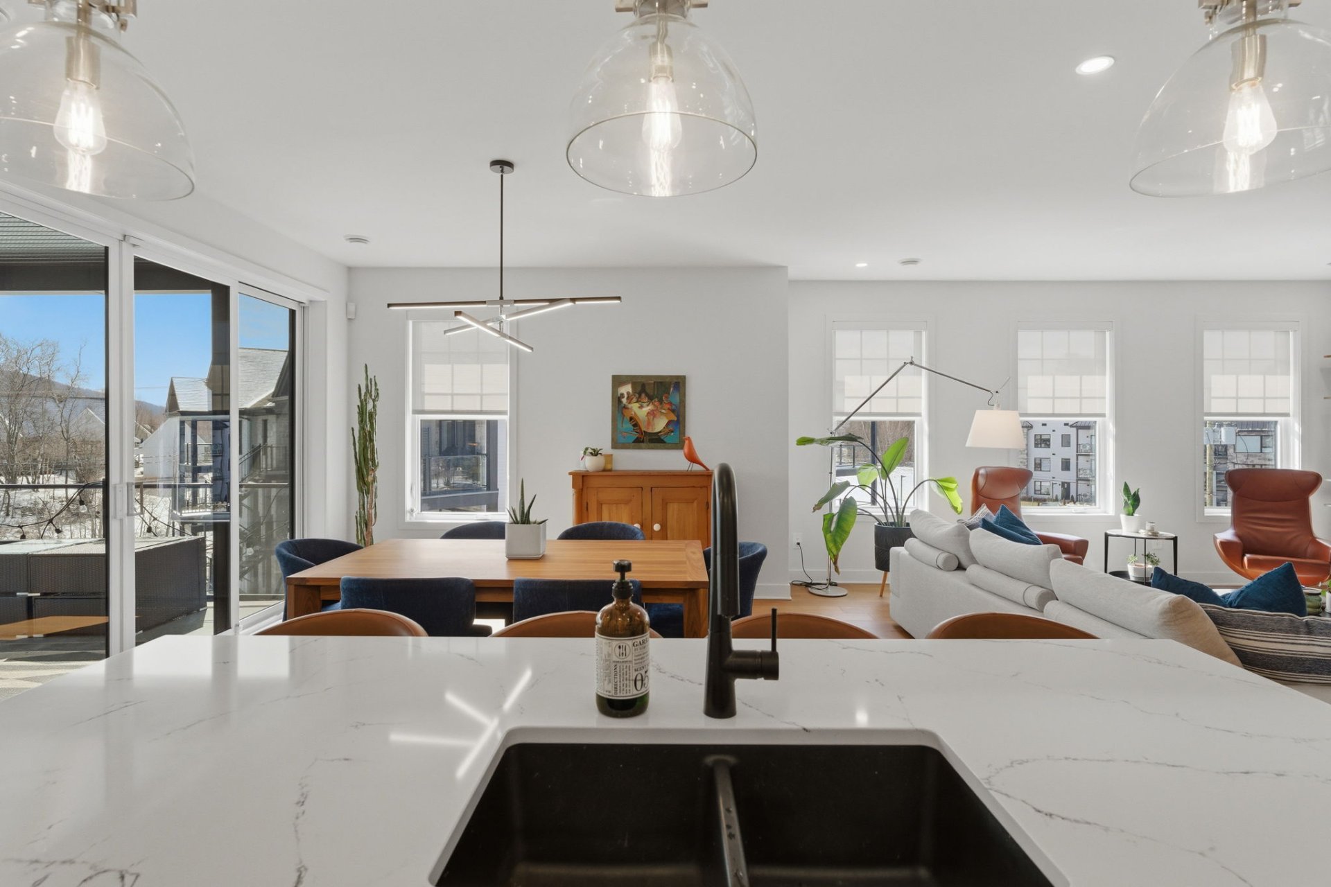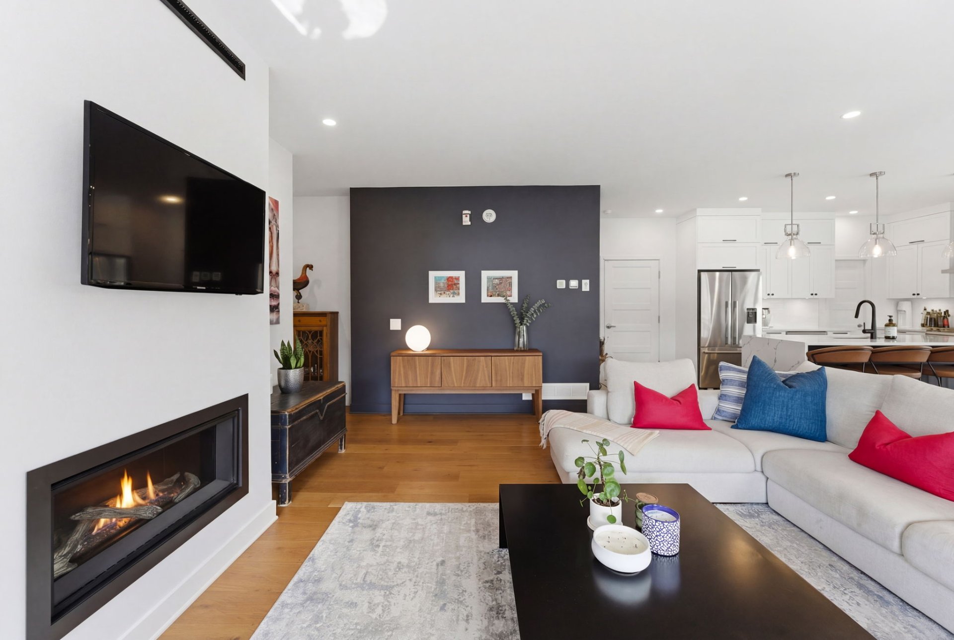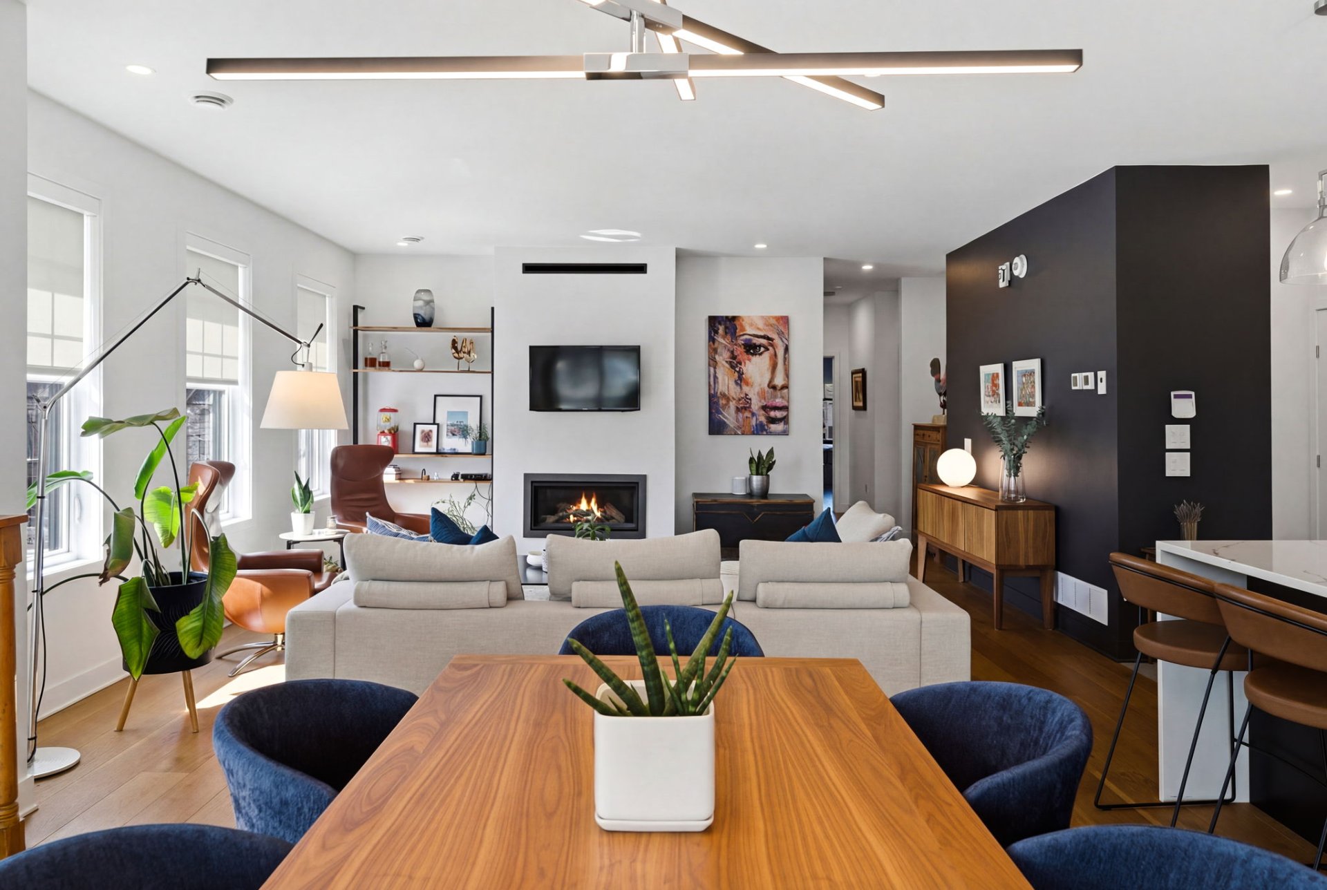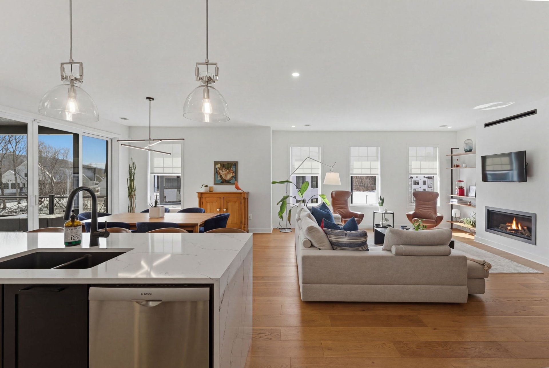 L'aire de vie, inondée de lumière, séduit par ses lignes épurées, son équilibre parfait et ses planchers de chêne blanc. Le salon, réchauffé par un foyer au gaz naturel, crée une ambiance feutrée et élégante. La cuisine, dotée de comptoirs de quartz et d'un vaste îlot, s'intègre harmonieusement à l'ensemble, idéale pour recevoir avec aisance. La spacieuse dépense est quant à elle l'endroit idéal pour cacher les petits électroménagers et entreposer la nourriture.