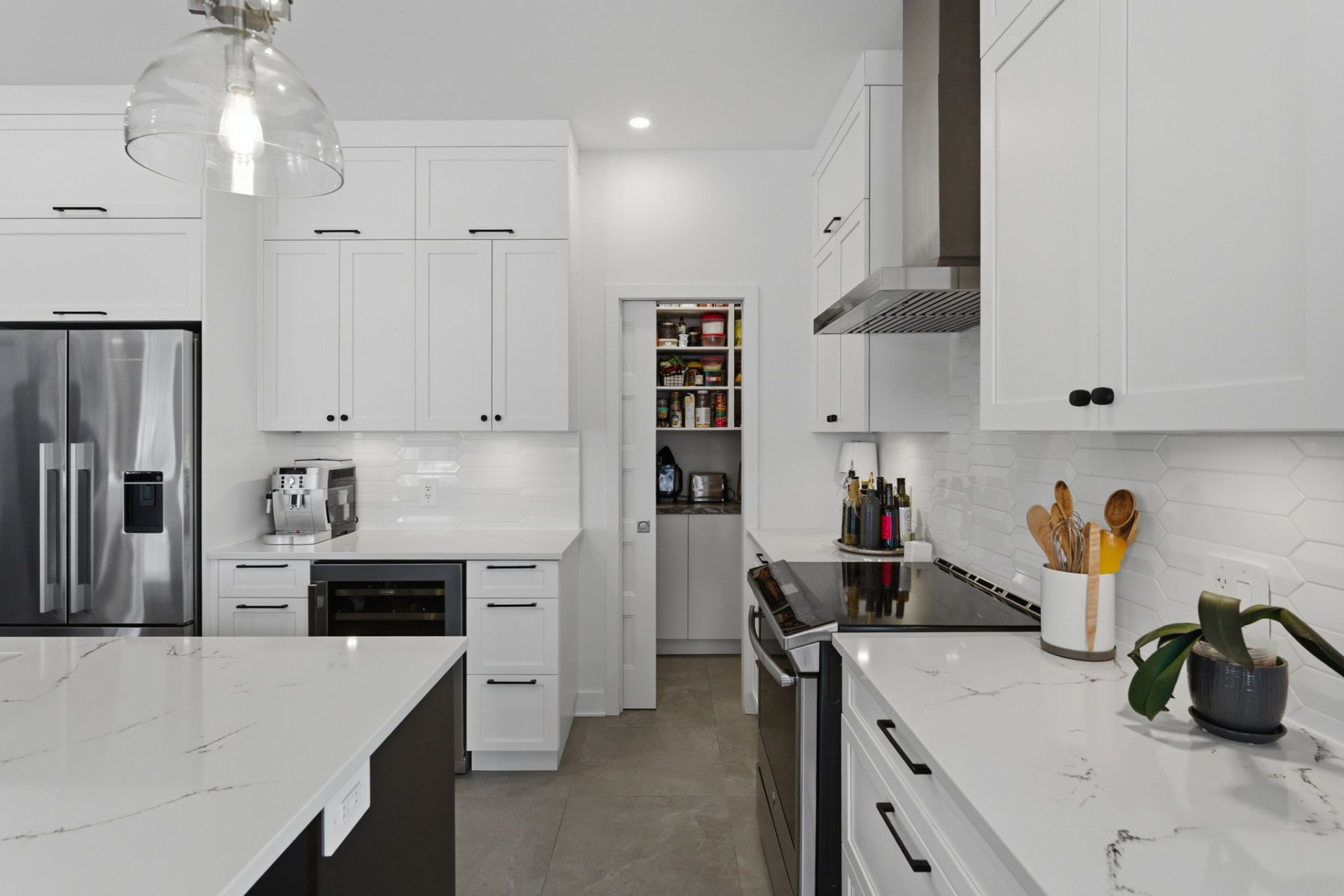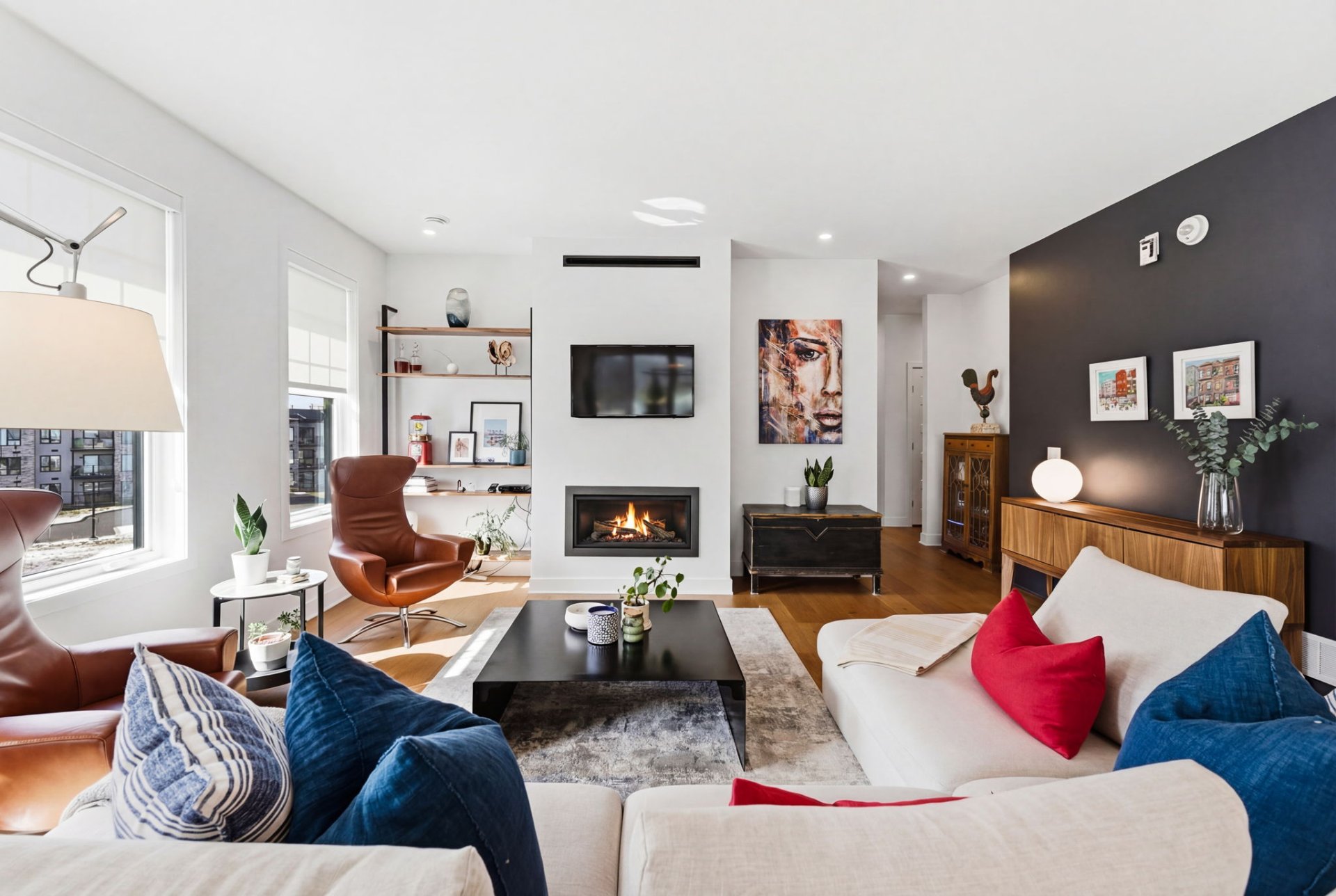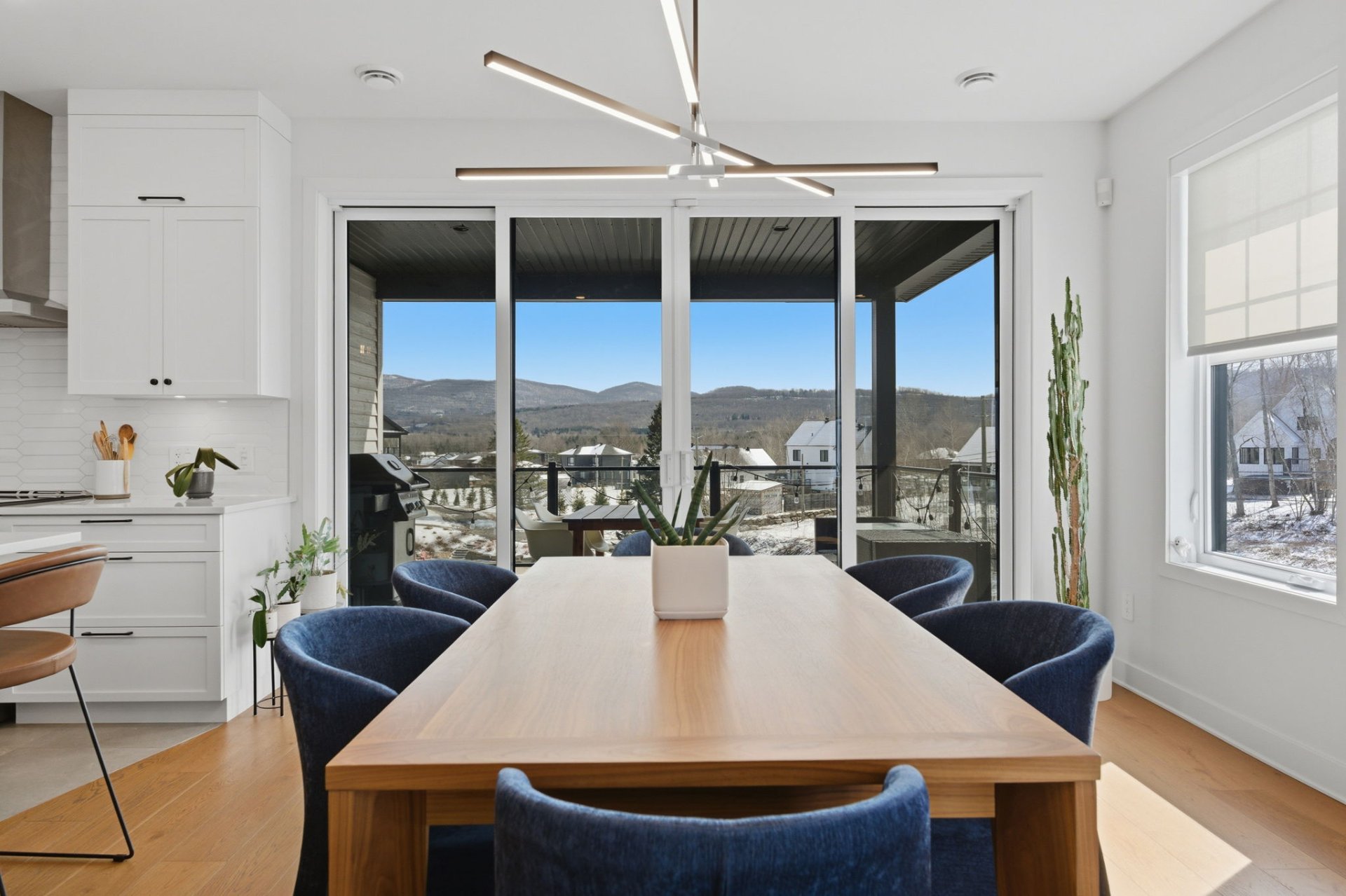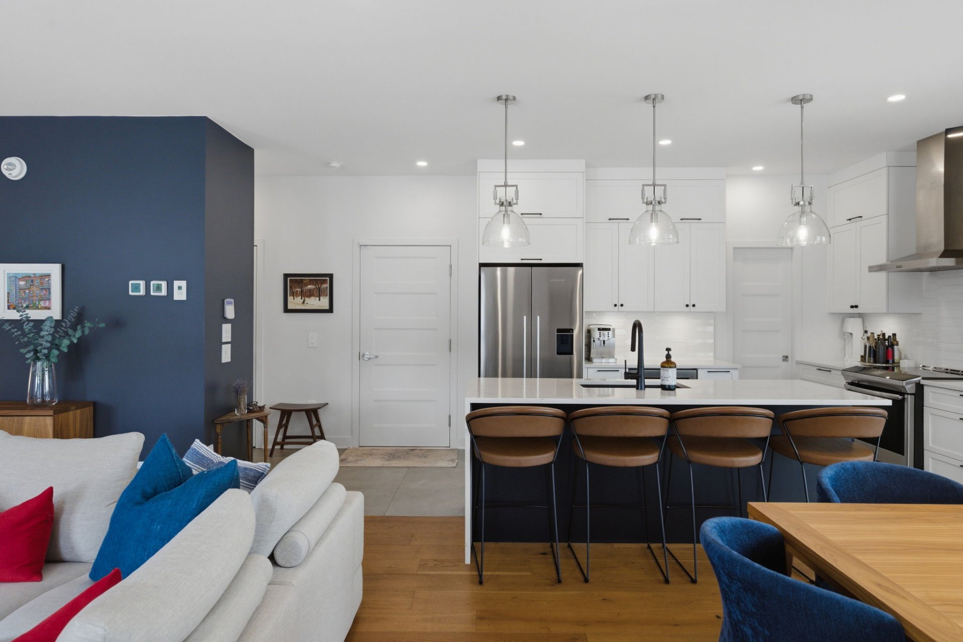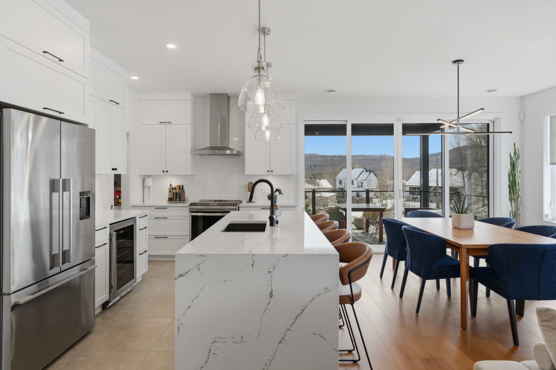 L'aire de vie, inondée de lumière, séduit par ses lignes épurées, son équilibre parfait et ses planchers de chêne blanc. Le salon, réchauffé par un foyer au gaz naturel, crée une ambiance feutrée et élégante. La cuisine, dotée de comptoirs de quartz et d'un vaste îlot, s'intègre harmonieusement à l'ensemble, idéale pour recevoir avec aisance. La spacieuse dépense est quant à elle l'endroit idéal pour cacher les petits électroménagers et entreposer la nourriture.