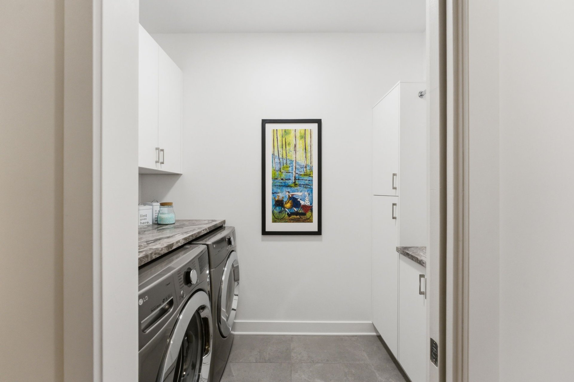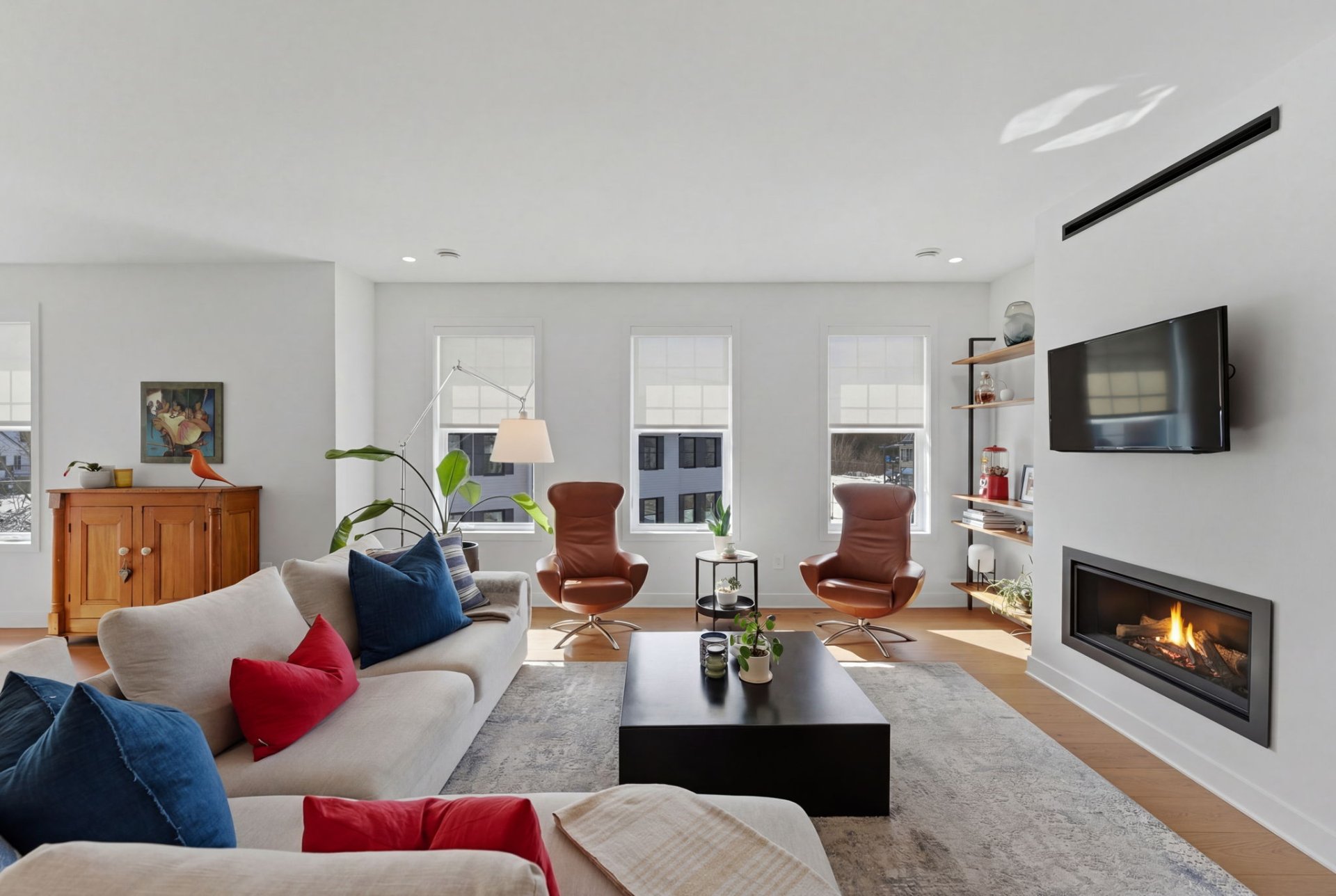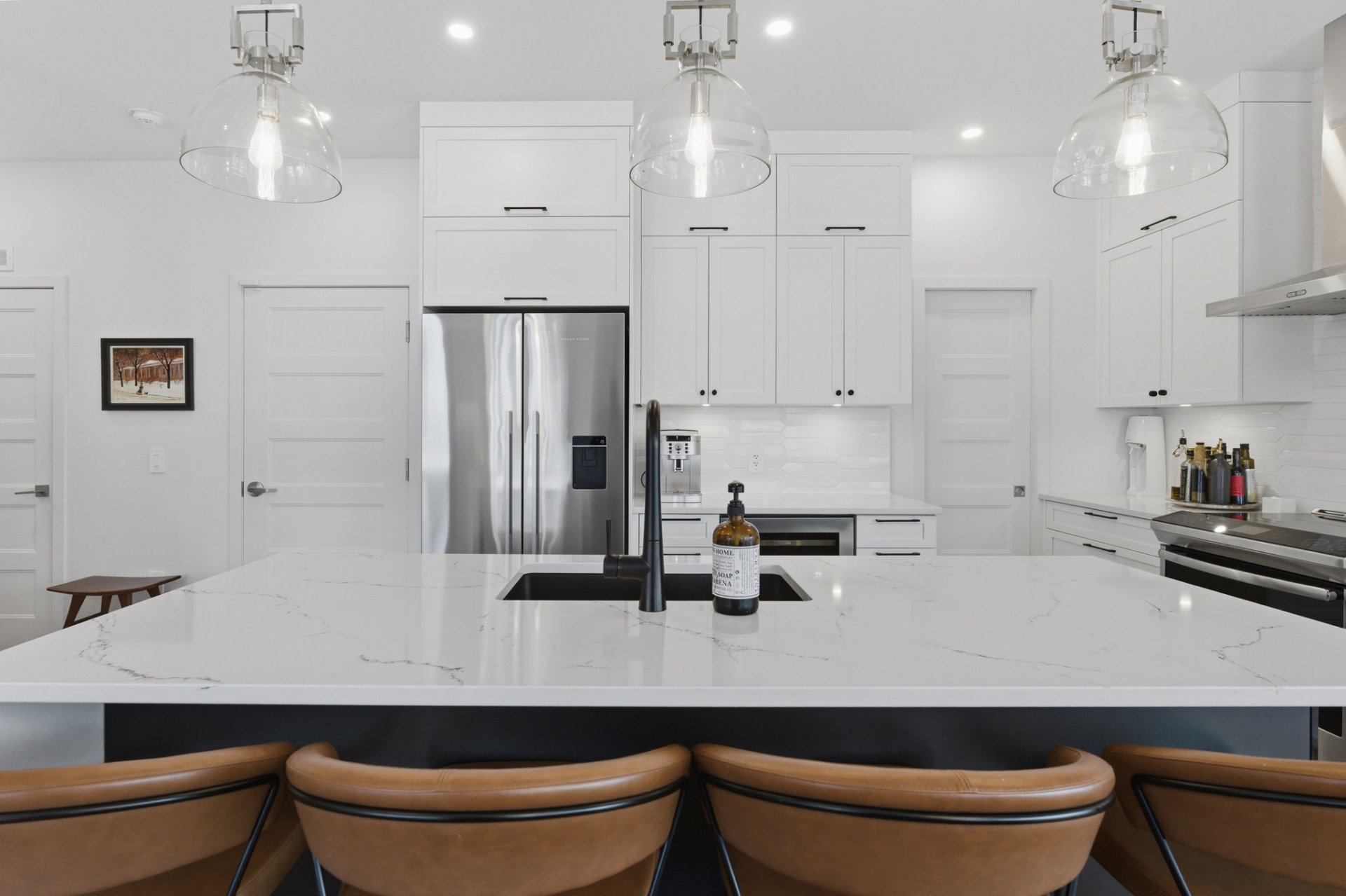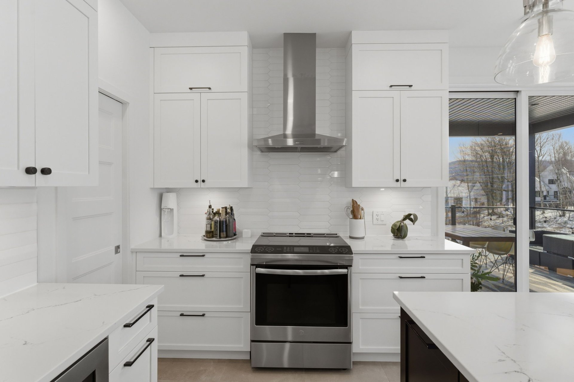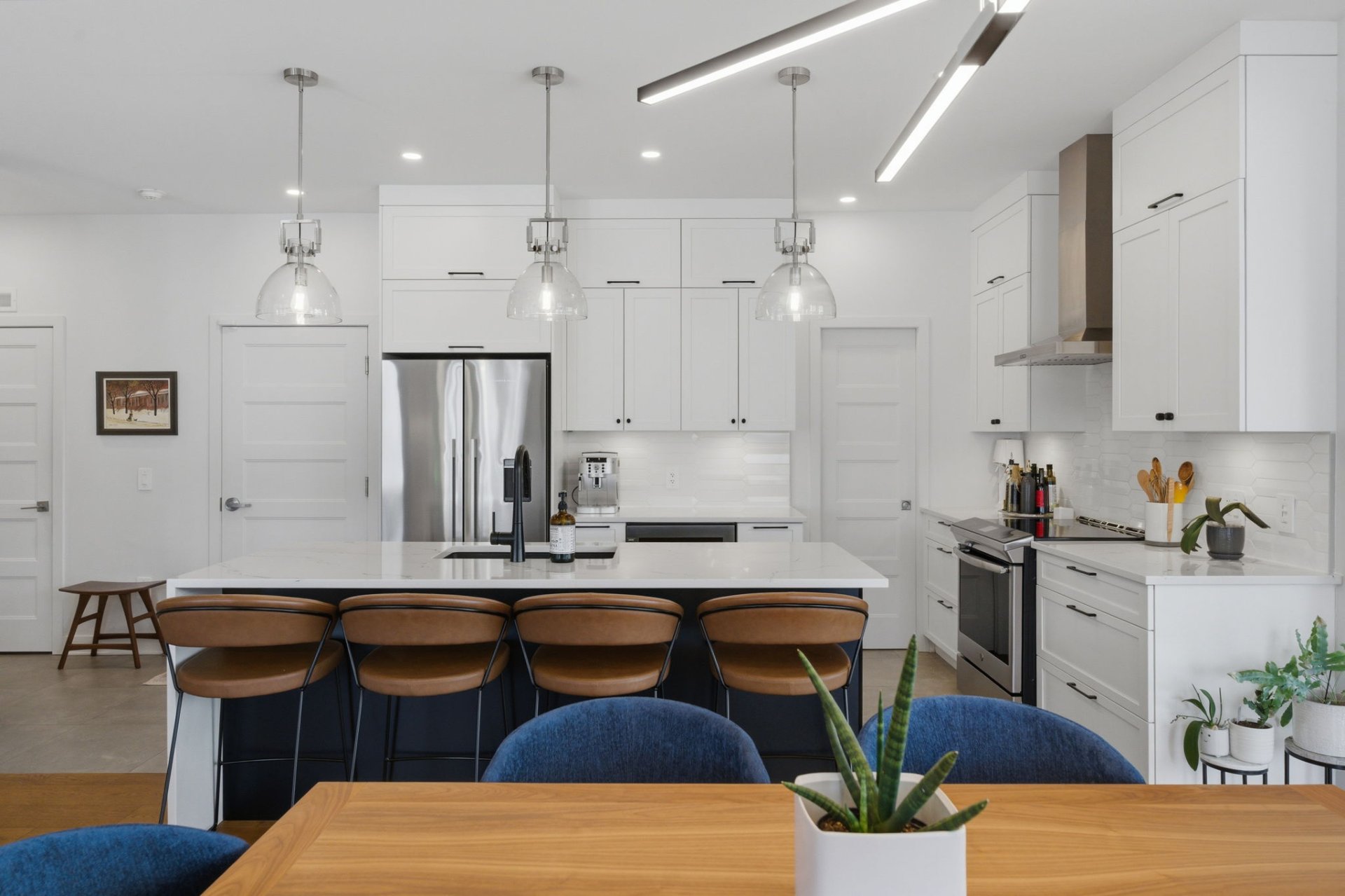 L'aire de vie, inondée de lumière, séduit par ses lignes épurées, son équilibre parfait et ses planchers de chêne blanc. Le salon, réchauffé par un foyer au gaz naturel, crée une ambiance feutrée et élégante. La cuisine, dotée de comptoirs de quartz et d'un vaste îlot, s'intègre harmonieusement à l'ensemble, idéale pour recevoir avec aisance. La spacieuse dépense est quant à elle l'endroit idéal pour cacher les petits électroménagers et entreposer la nourriture.