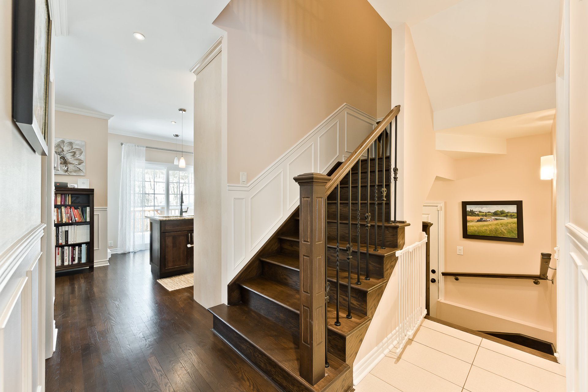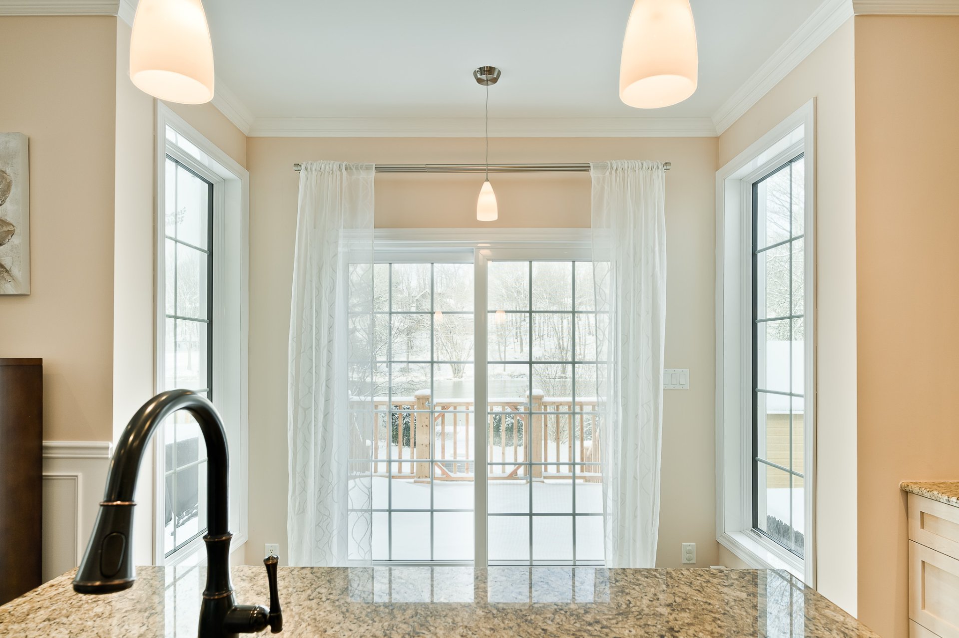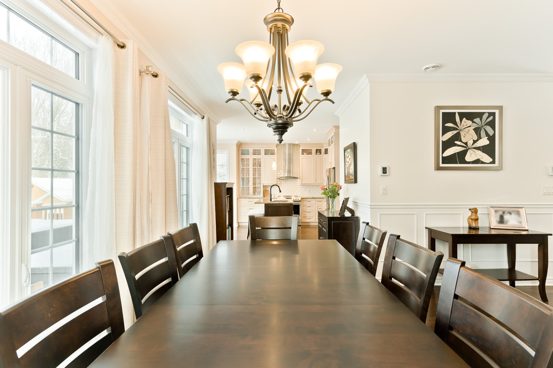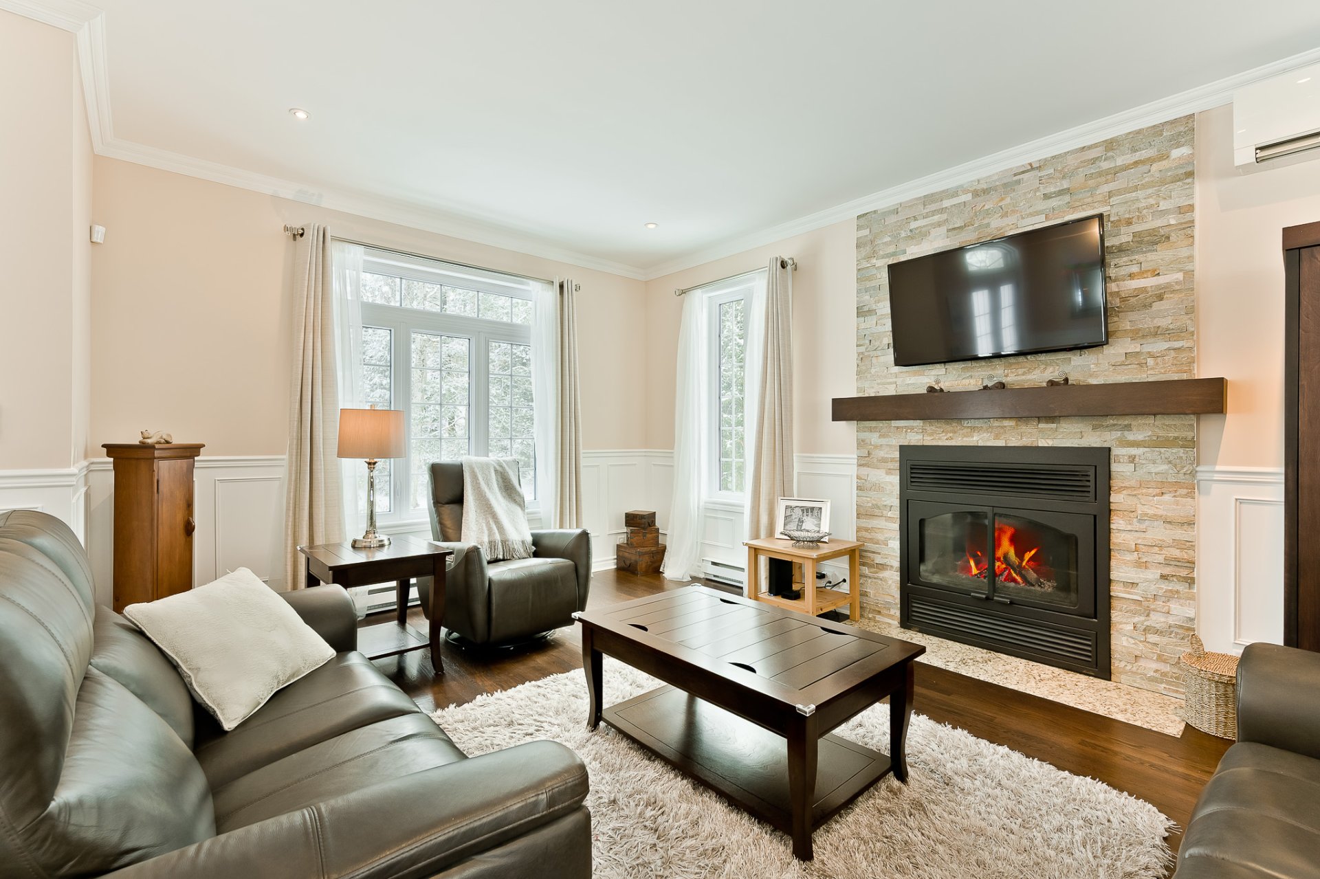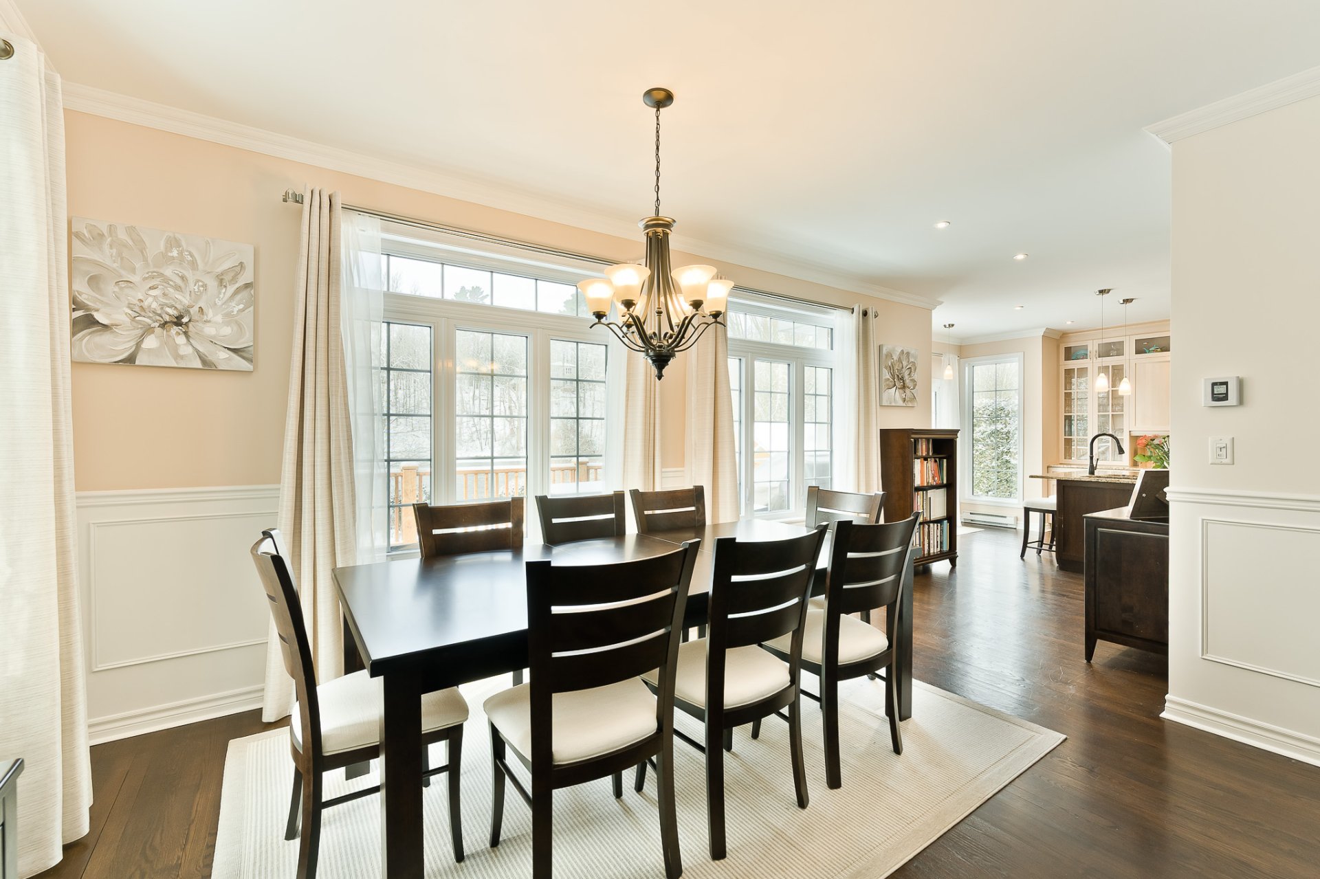 Le salon, agrémenté d'un foyer, devient naturellement le point de rassemblement parfait pour les soirées conviviales ou les moments de détente. Les planchers de bois ajoutent une touche d'élégance intemporelle. Une spacieuse salle à manger le sépare de la cuisine. Celle-ci, pensée pour être hautement fonctionnelle, facilite tant les repas du quotidien. Elle offre un îlot central, des comptoirs de granit et des armoires de bois jusqu'au plafond. On profite d'un espace lumineux, accueillant, où chaque détail contribue à une ambiance vivante et réconfortante, avec en prime une vue agréable sur la rivière.