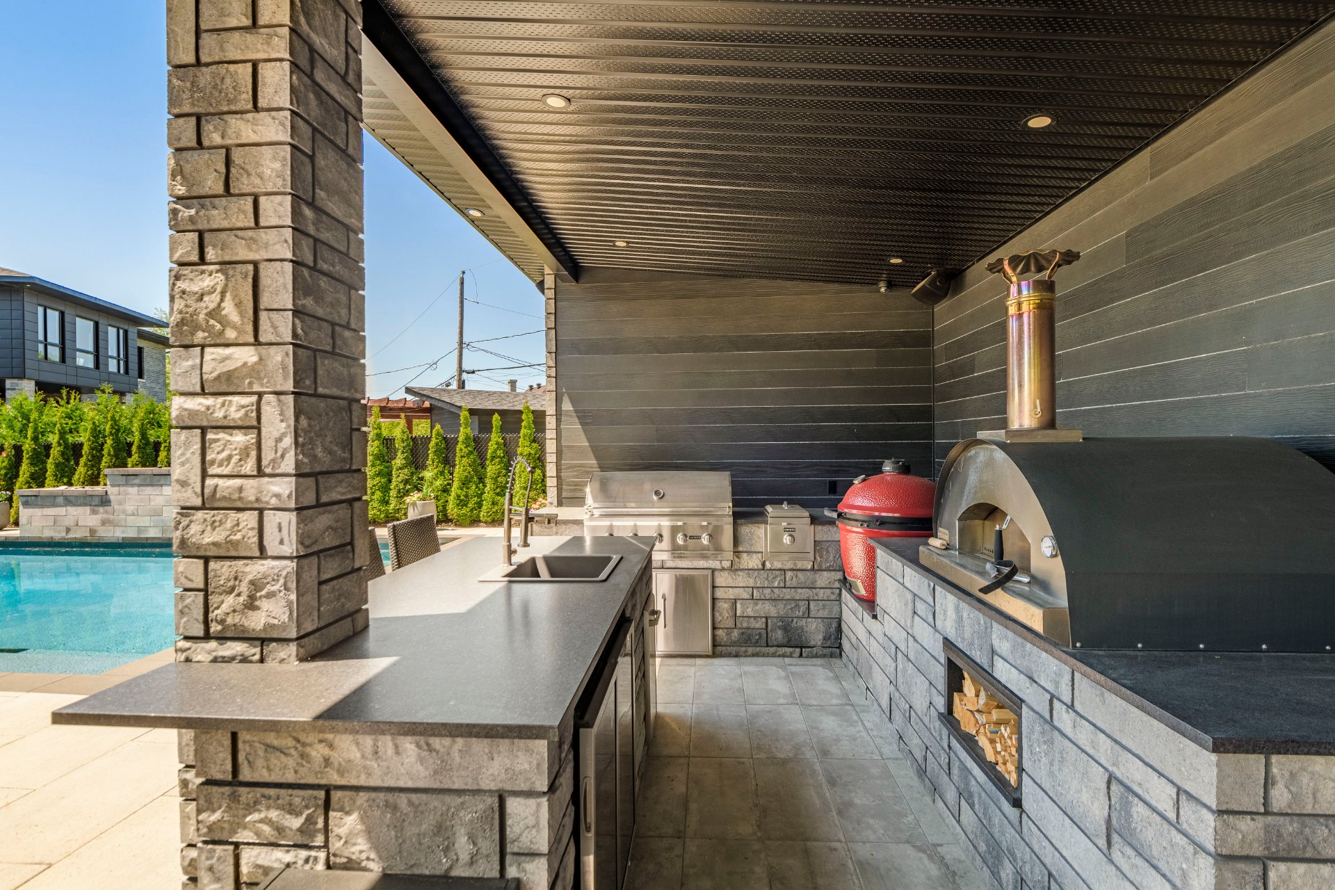 Terrasse couverte, espace lounge avec foyer et zones de détente.