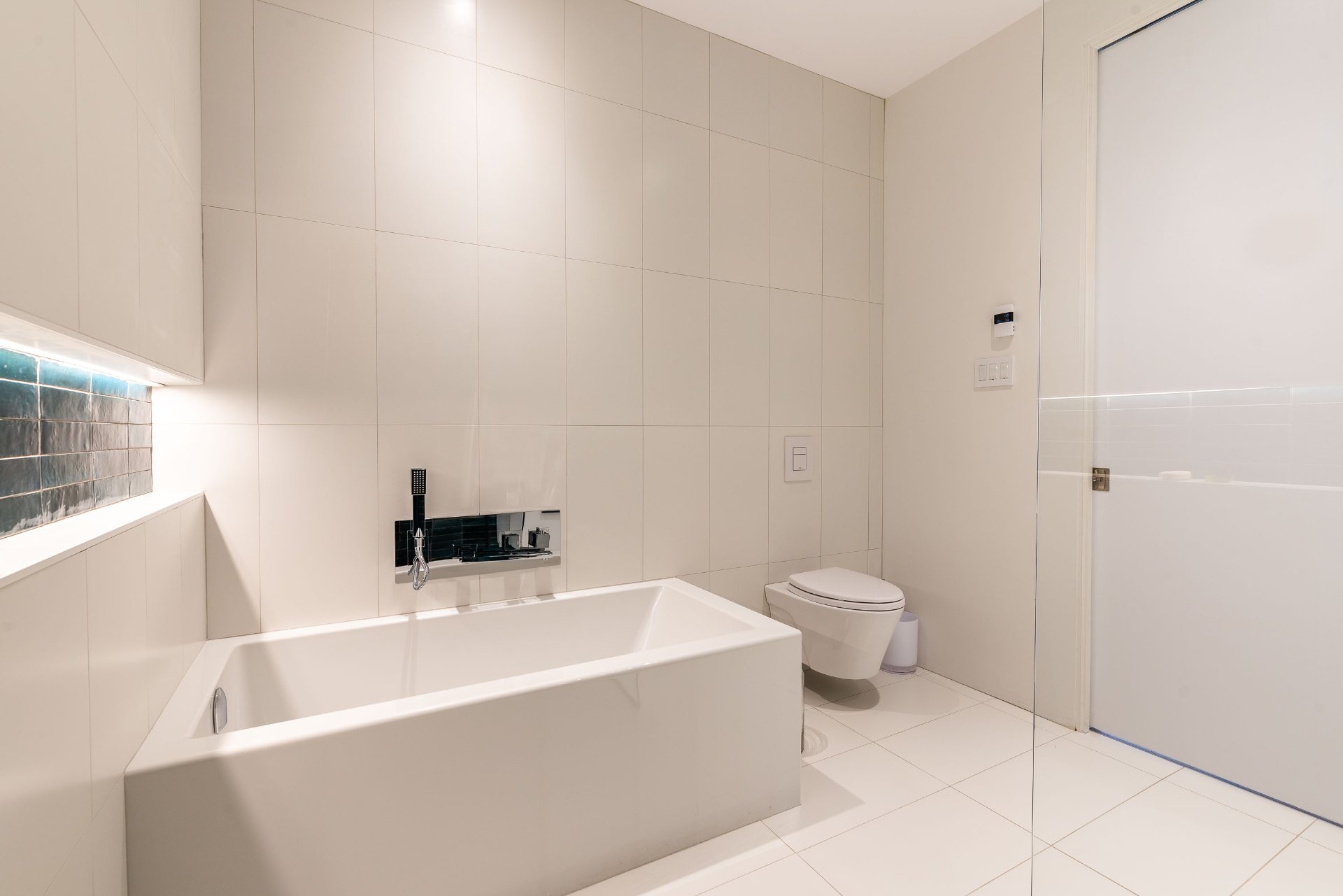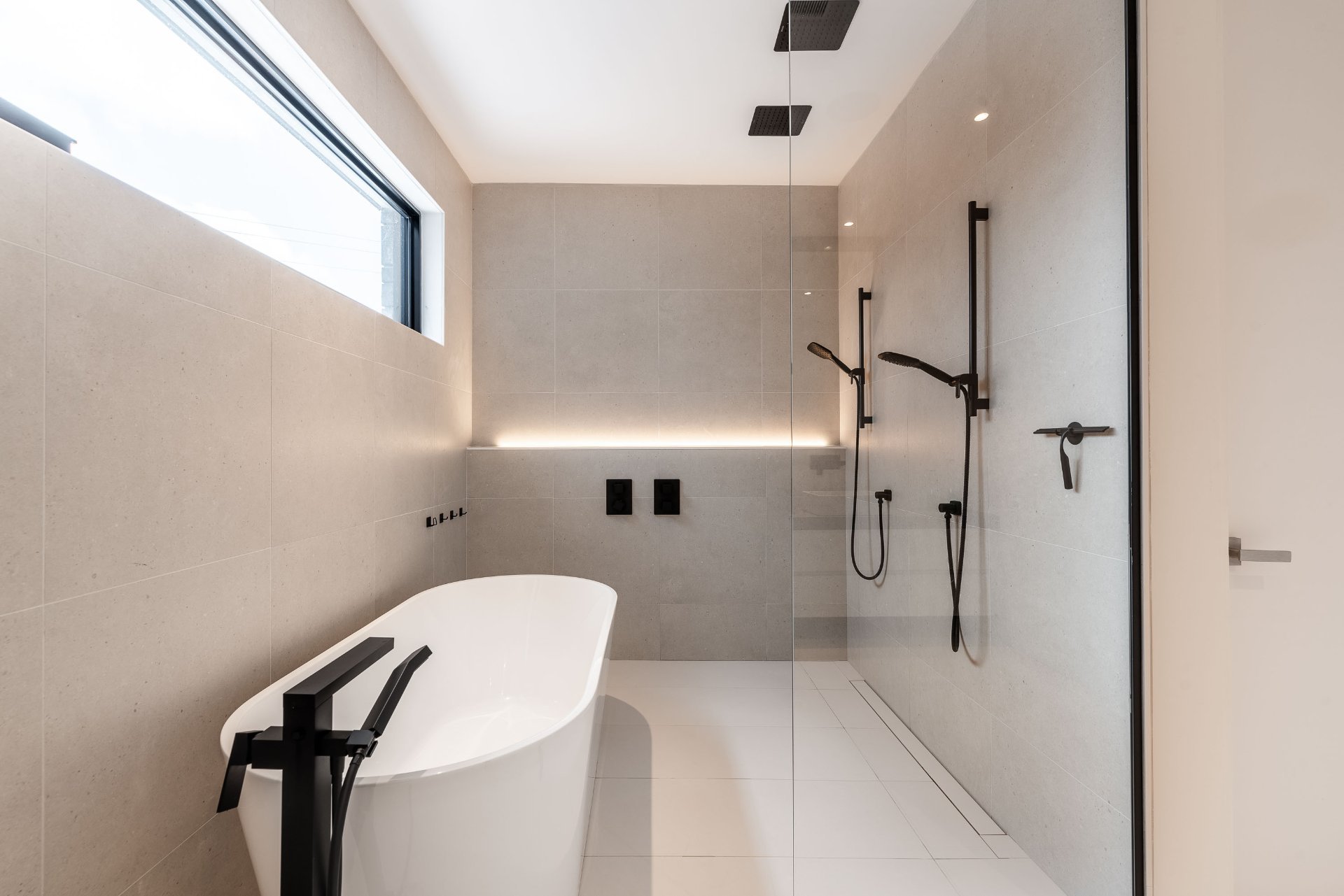 Suite principale dotée d'un vaste walk-in et d'une salle de bain digne d'un spa : vanité double, grande douche italienne double, baignoire autoportante et toilette cloisonnée.