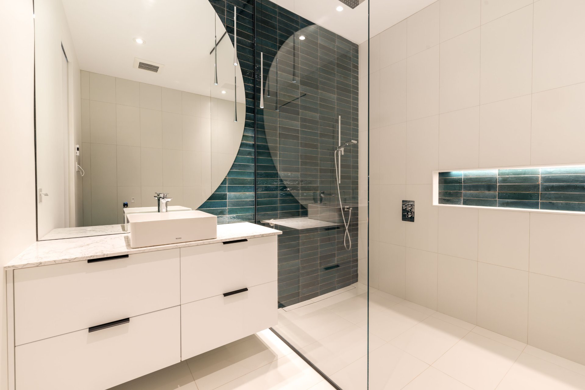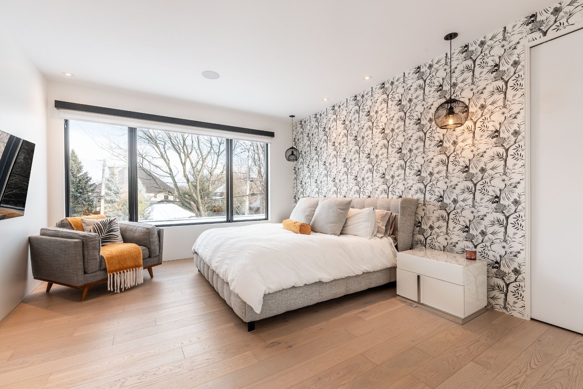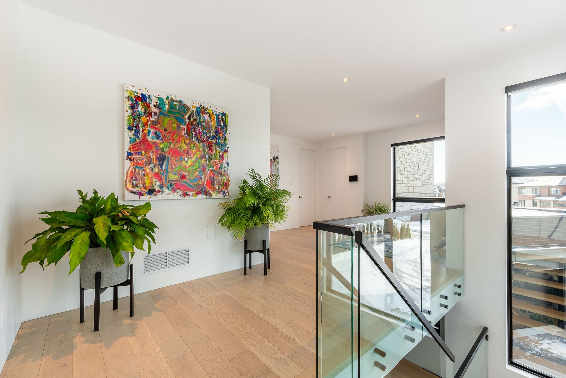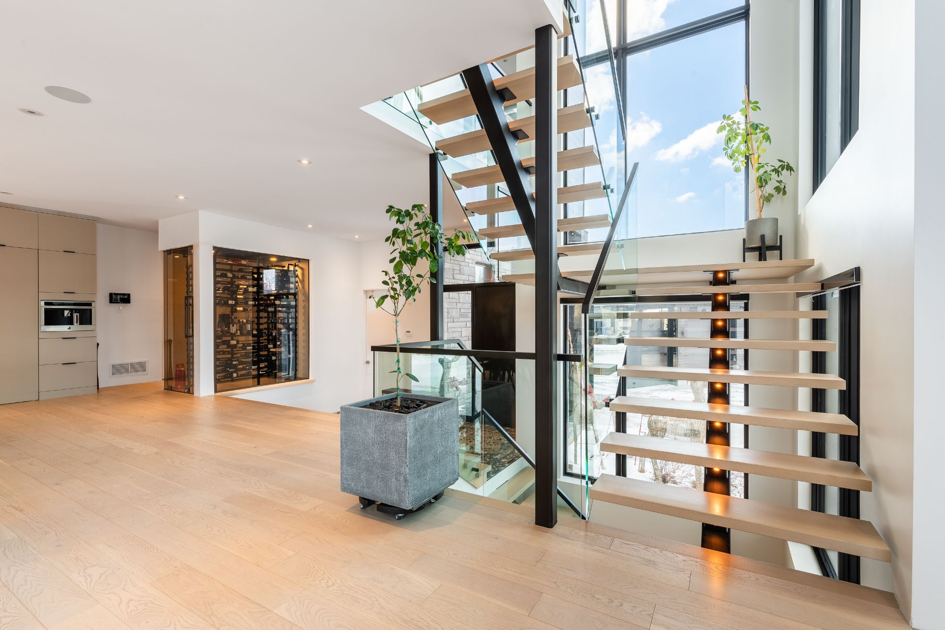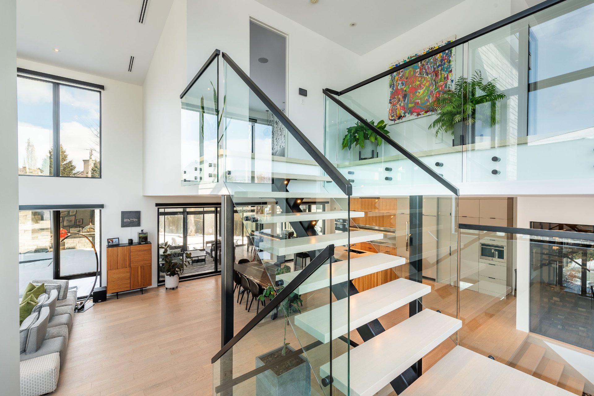 Escalier central au design raffiné, éclairé et bordé de verre, menant à trois chambres avec salles de bain privées.